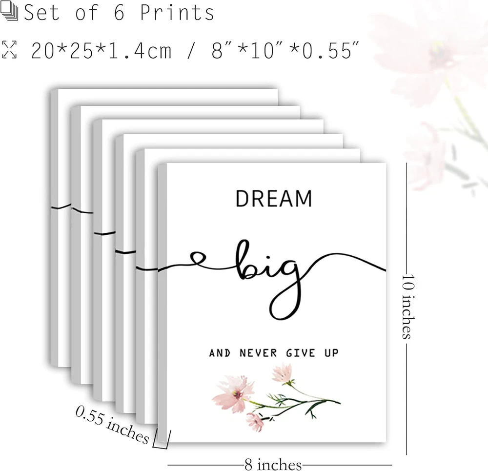 Store New Arrivals Add to Favorite View Feedback Contact Inspirational Wall Art for Bedroom, Motivational Office Wall Art Decor, Framed Canvas Wall Art for Women, Girls, Positive Affirmations Quotes Prints, Set of 6PCS, 8"X10", FRAMED Description Item Weight 1.73 pounds Product Dimensions 10 x 8 x 0.2 inches Country of Origin China Inspirational Wall Art - These motivational quotes will provide daily inspirations and remind you to keep a positive mindset everyday. They are perfect additions to your home office and bedroom, create a wonderful vibe and strengthen your self-confidence. Quality Framed Canvas Prints - You will get a set of 6PCS inspiring wall art with size 8"x10". Artistic handwriting words and cute flowers are clearly printed on thick canvas, which making our inspirational wall decor durable and waterproof, then can keep their beauty for long time. Original Design - We are here to provide you with original and creative designs to brighten up your room, remind you of the beautiful sparkles and positive attitude in life with these pretty prints. It will be the perfect addition to your office, bedroom, classroom. Easy & Thoughtful Gift - If you want to pick something special to cheer someone up, our inspirational wall art must be the perfect choice, to send your kindness and pass the positive messages to your loved one. Great gifts for your friends and family. Simple to Hang - Wooden frames are wrapped in the canvas prints, and the hook is on the back of each framed print, also the nails are included in this set. 6 PCS motivational wall arts are perfect size to shine your wall out, making your empty wall vivid. Product Description Create a inspirational vibe in any space, perfect for home office, bedroom, kids room. Office decor Wall art for bedroom Wall decor for kids room Spread positive vibes to you everyday. Sets of 6 pieces, high-quality wall art for you. Canvas wall art Wooden frames Waterproof Package Includes: 6PCS x Inspirational Wall Art prints 6PCS x Nails 1.Manual measurement, please allow slight errors on size. 2.The colors may exist slight difference due to different digital screens. Specifications: Material: Canvas, Wood Color Map: Black and white, Pink, Green Size: 8 x 10x0.55 inch/ 20 x 25 x1.4cm Pattern: Inspirational Wall Decor ABOUT US We offer the best prices around on high quality products. Our E-store includes media such as books, movies, music and games while offering electronics, toys, sporting apparel, clothing, tools, general home, garden items and more. SHIPPING We are always working hard to ensure your package arrives as soon as possible. Please understand that some factors like weather, high postal traffic, and the performance of shipping companies are outside of our control. We offer free shipping to the lower 48 states and ship within 2 business days of payment, usually sooner. We do not accept P.O. Boxes. Please provide a physical address. For shipping outside of the continental USA, we only use eBay's Global Shipping Program.The item is shipped to KY and then sent to the rest of the world. International customers are responsible for all duties and taxes. Continue to check out in order to calculate costs for shipping the item to your country. Messages regarding eBay's Global Shipping Program MUST be directed at eBay EXCLUSIVELY. RETURNS We offer a 30-Day Return Policy on items which you are not completely satisfied with. You have the option for a full-refund or an exchange of the item. No returns are available on items shipped outside of the USA. PAYMENT We accept PayPal. CONTACT US This page content is yet to come Please ad us to your favorite seller and visit again later Thank You CUSTOMER SATISFACTION We try our very best to make sure every customer is completely satisfied. If there's a problem, message us! We're happy to help. WE ACCEPT Copyright © 2021 AutoDS. | All Rights Reserved