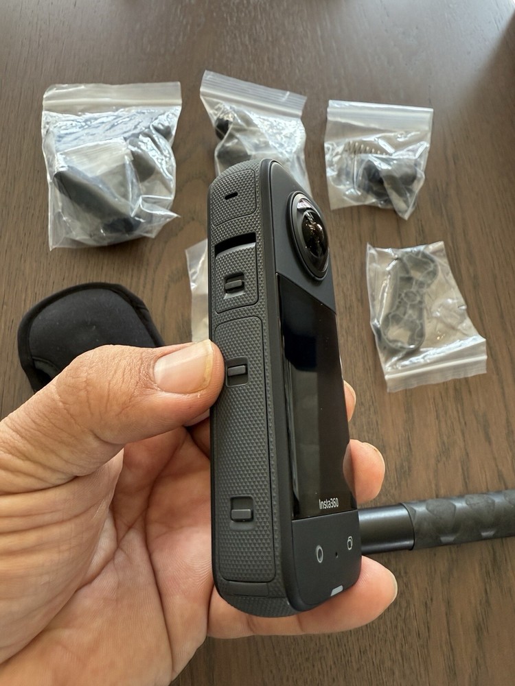 The Insta360 X3 is an action camera with a 3x digital zoom capability, designed for capturing high-quality footage on the go. It comes in a sleek black color and offers features such as waterproofing and built-in Wi-Fi connectivity. The camera includes a motorcycle attachment and an invisible stick for versatile shooting options. With a USB-C connection and a rechargeable Lithium-Ion battery, this camera is perfect for capturing dynamic moments in various environments. Made in China, this Insta360 model combines portability and advanced features for capturing immersive footage. No scratches on lens or screen , never used motorcycle parts , invisible stick has small dent .