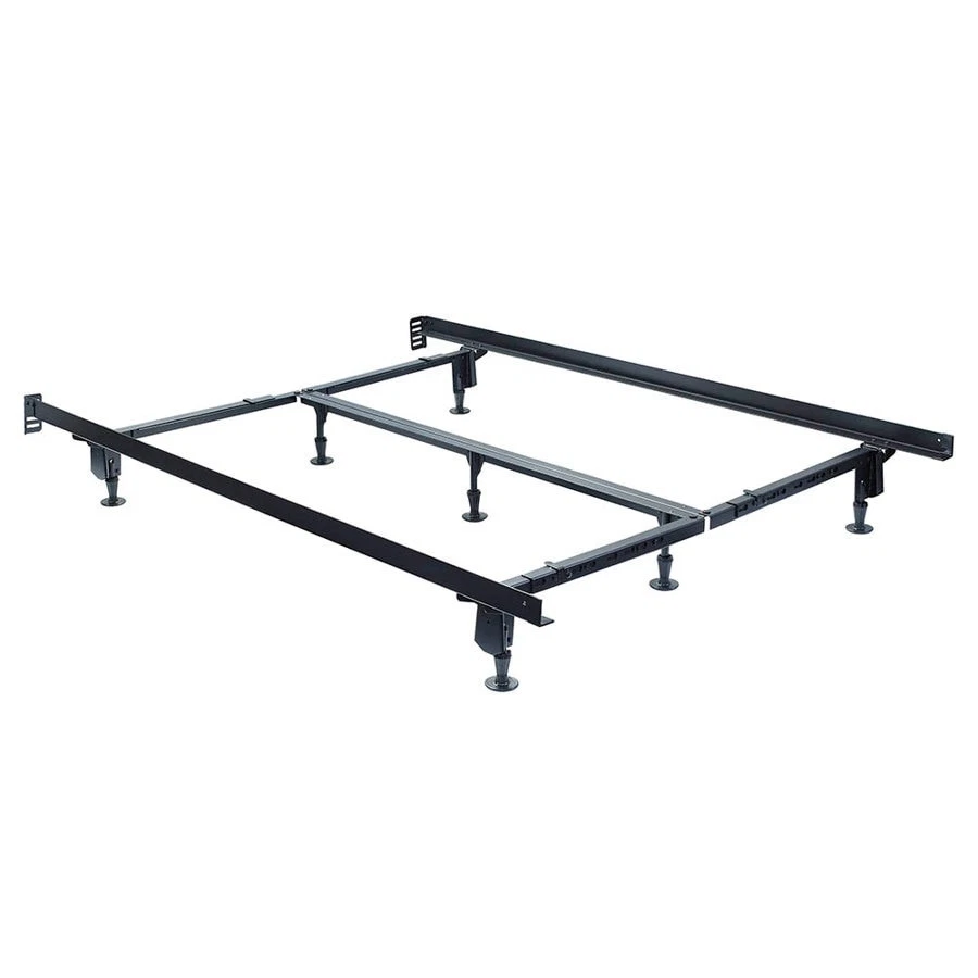 An extra heavy-duty bed frame strong enough to support all bedding. Made of heavy duty high carbon, recycled railroad rails with a water-based, lead-free finish. Unique Wedge Lock leg design becomes even stronger with use. Oversized side rails provide additional support. Permanently attached locking system. Solid rivet construction increases durability. Rounded corners provide safety and recessed legs offer additional toe room. Heavy-duty brackets. Easy to assemble, no tools required. Limited lifetime warranty. Materials: Steel, metal, plasticFinish: Coffee colored finishSize: QueenColor: BrownUpholstery color: Weight capacity: 3000Seat dimensions: NADimensions: 39 inch to 76 inchFurniture Pattern: SolidFurniture Room: BedroomProduct Features: Includes HardwareMaterial: Metal, Free Shipping Over $49.99* Details Inst-a-matic Heavy Duty Universal Bed Frame with Rollers & Glides Product Description: An extra heavy-duty bed frame strong enough to support all bedding. Made of heavy duty high carbon, recycled railroad rails with a water-based, lead-free finish. Unique Wedge Lock leg design becomes even stronger with use. Oversized side rails provide additional support. Permanently attached locking system. Solid rivet construction increases durability. Rounded corners provide safety and recessed legs offer additional toe room. Heavy-duty brackets. Easy to assemble, no tools required. Limited lifetime warranty. MaterialsSteel, metal, plastic FinishCoffee colored finish SizeQueen ColorBrown Upholstery color Weight capacity3000 Seat dimensionsNA Dimensions39 inch to 76 inch Furniture PatternSolid Furniture RoomBedroom Product FeaturesIncludes Hardware MaterialMetal, Steel AssemblyAssembly Required FinishSteel Finish All steel construction. Assembles in minutes. Set includesMetal and plastic hardware, cross supports Serta Stable-Base Ultimate Bed Frame 'One Size Fits All' Universal - Twin/Full/Queen/California King/King, 7.5' high, Center Support - 6 Legs with Rug Rollers and Glides. Assembly required. Mattress, box spring, and bedding (comforter, sheets, pillows, etc.) are NOT included.