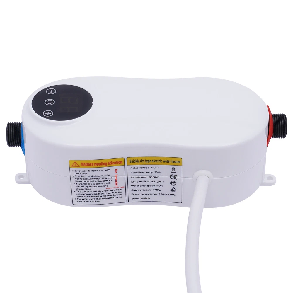 Specifications Color: White Material: ABS, Stainless Steel Shape: Gourd-shaped Style: Mini, Instant Mounting Type: Wall-mounted, Vertical Usage: Indoor Use Features: With Leakage Protection Water Inlet Mode: Lower Water Inlet Heating Method: Instant, Stainless Steel Heating Tube Power Source: Corded Electric Voltage: 110V Frequency: 50Hz Power: 3500W Rated Pressure: 0MPa Operating Pressure: 0.04-0.4MPa Anti-Electric Shock Type: I Waterproof Grade: IPX4 Wire Requirements: >2.5m² Circuit Breaker Switch: >16A Heating Time: 3s Interface: 1/2"NPT Heating Temperature: 20-55℃/68-131℉ Power Cord Length: 0.9m/2.95ft Water Inlet Hose Length: 50cm/19.68inch Water Heater Size: 19*7.5*7.5 cm/7.48*2.95*2.95 inch Package Size: 27*28*12cm/10.6*11.02*4.7inch Net Weight: 1.35kg Instant Electric Bathroom Hot Water Heater With Shower Head White 110V 3500W Instant Electric Bathroom Hot Water Heater With Shower Head White 110V 3500W Without shower, hose, bracket. Description Our water heater uses a stainless steel heating core with 3500w large power, providing you with instant hot water and allowing for a comfortable washing/shower experience. In addition, it adopts multiple protection designs such as leakage protection, dry-heating protection, and grounding protection, ensuring high safety of water use. The mini body and modern appearance make it a great companion for a sink, faucet, or bathroom. Specifications Color: White Material: ABS, Stainless Steel Shape: Gourd-shaped Style: Mini, Instant Mounting Type: Wall-mounted, Vertical Usage: Indoor Use Features: With Leakage Protection Water Inlet Mode: Lower Water Inlet Heating Method: Instant, Stainless Steel Heating Tube Power Source: Corded Electric Voltage: 110V Frequency: 50Hz Power: 3500W Rated Pressure: 0MPa Operating Pressure: 0.04-0.4MPa Anti-Electric Shock Type: I Waterproof Grade: IPX4 Wire Requirements: >2.5m² Circuit Breaker Switch: >16A Heating Time: 3s Interface: 1/2"NPT Heating Temperature: 20-55℃/68-131℉ Power Cord Length: 0.9m/2.95ft Shower Hose Length: 1.5m/4.9ft Water Inlet Hose Length: 50cm/19.68inch Water Heater Size: 19*7.5*7.5 cm/7.48*2.95*2.95 inch Package Size: 27*28*12cm/10.6*11.02*4.7inch Net Weight: 1.35kg/2.97 lbs Gross Weight: 1.4kg/3.08 lbs Features Premium Material: The instant water heater uses stainless steel and high-quality ABS materials, making it sturdy, wear-resistant, anti-rust, and long-lasting. A Safe Heater: The various protections such as leakage protection, dry-heating protection, anti-electric wall technology, water-electricity isolation, overvoltage protection, thermostatic anti-scalding protection, over-temperature protection, grounding protection, and IPX4 waterproof rate make it safe to use without any worries. Instant Heating: Using a stainless steel heating tube with 3500w high power, this water heater can deliver warm hot water in about 3 seconds without storing water for preheating, which saves time/energy and prevents sediment/scale accumulation. Temperature Controllable: You can control the water temperature (68-131℉) by adjusting the water flow (large/small water flow--low/high temperature) and pressing the+/- keys on the panel, providing hot water that fits four seasons in a year. LED Display: The digital screen displays the water temperature and power, so you can keep track of them and get the desired temperature easier. Anti-scaling Design: It can filter the sediment, rust, and other large particles in the tap water, restore the tap water to the factory state, reduce energy consumption, and avoid damage to the human body and skin. Low Water Pressure Startup: The advanced temperature sensing technology overcomes the difficulty of using water heaters due to low water pressure, making it suitable for residential buildings with water pressure up to 0.04MPa. Cost-effective: The tankless water heater with 98% thermal efficiency can automatically regulate the power according to the water flow and temperature change, saving energy up to 50%. Only when it is used the water can be heated to the required place, eliminating the waste of unused water in the long water pipeline between the central water heater and each faucet. Mini Appearance: This mini wall-mounted white instant water heater with a unique gourd-shaped design and 4.6*2.8*6.3 inches size plays a decorative role and does not occupy much space. Simple Installation: With the equipped accessories, premade fixing screw holes, English manual, and 1/2" standard interfaces, you can install this heater easily. Details Power Cable: The 2.95ft power cable allows for easy installation in your cupboard or under the sink. Stainless Steel Hose: The 4.9ft freely bendable shower hose allows you easily to flush wherever you want and take a shower at your leisure. Hand Spray: The evenly distributed outlet holes of the hand spray provide you with softer and finer water for a better shower experience. Touch Button: The new-generation touch button with electronic control has a longer lifespan and good sealing. It resists wet and water and avoids mechanical failure of buttons. Application It is suitable for kitchens, cupboards, bathrooms, daily washing, RVs, bars, schools, hospitals, communities, hair salons, and so on to wash hands, dishes, clothes, and face. You can also take a shower above 0.04MPa water pressure. Package Included 1* Instant Water Heater 1* Hand Spray 1* Shower Hose 1* Water Inlet Hose 1* Flow Regulating Valve 1* Hand Spray Holder 1* English Instruction Other Accessories for Assembly How to Install Fix it through the premade screw holes at the proper position on the wall. Install the water flow regulating valve at the blue electric water inlet under the water heater. Install an electric partition wall at the red water outlet above the water heater. Connect the water inlet hose to the water flow regulating valve. Connect the water inlet. Connect the shower hose to the electric partition wall. Install the hand spray holder in the proper posit