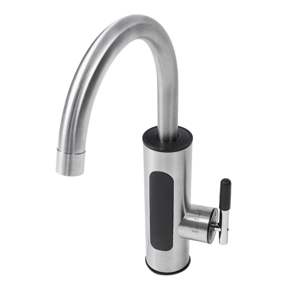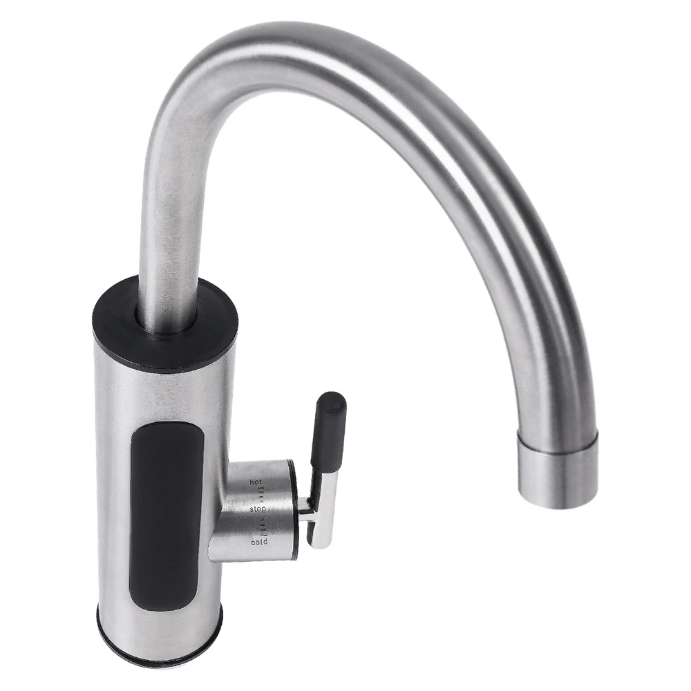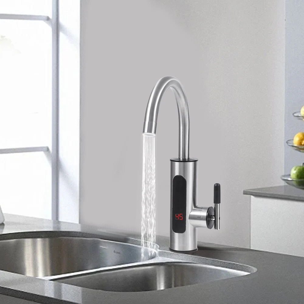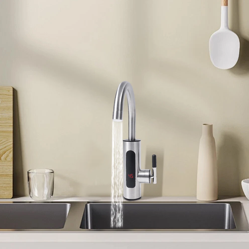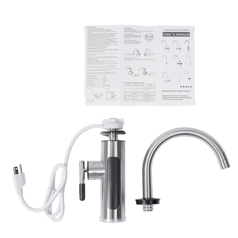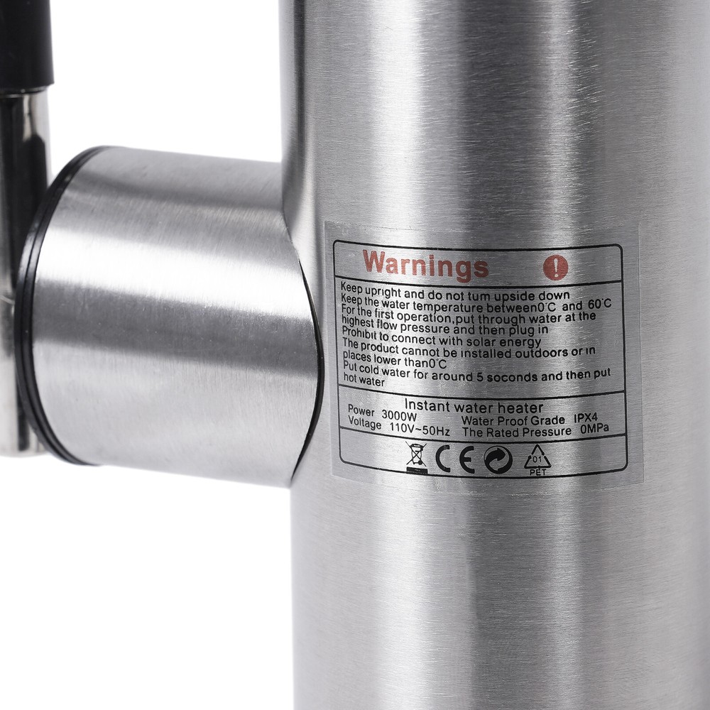 Specifications Color: Silver Process: Wire Drawing Mount Type: Countertop Assembly Required: Yes Waterproof Level: IPX4 Material: 304 Stainless Steel, ABS Valve Core Type: Ceramic Valve Core Water Inlet Type: Lower Water Inlet Heating Method: Instant, Stainless Steel Heating Core Working Water Pressure: 0.15-0.6Mpa Rated Pressure: 0MPa Rotation Angle: 360° Temperature Range: 30-60℃/86-140℉ Power Source: Corded Electric Plug: US Standard Voltage: 110V, 50Hz Power: 3000W Interface Size: NPT1/2" Wire Requirements: 1.5mm² Power Cord Length: 1.1m/3.6ft Product Overall Size: 20*36cm/7.87*14.17inch Faucet Lower Part Size(D*H): 5.5*18cm/2.16*7.08inch Faucet Connection Length: 5cm/1.96inch Packaging Size: 27*21*11cm/10.63*8.27*4.33inch Gross Weight: 1.05kg/2.31lbs Electric Heating Faucet Countertop Rotation Instant Heating Water Faucet 50Hz Description This electric heating faucet adopts 304 stainless steel and ceramic valve cores, ensuring high durability and the health and safety of water use. The 3000W high power faucet with 304 stainless steel heating cores has a 3-second heating speed, which is convenient and fast. Meanwhile, the IPX4 protection level, pressure relief protection, grounding protection, and more allow you to use this product with confidence to make your life more convenient and comfortable! Key Features High-quality Material: It is made of high-quality 304 stainless steel and ABS, which make this faucet highly resistant to rust and wear and greatly extend its service life. Fast Water Heating: 3000W high power and 304 stainless steel heating core can quickly heat water and it can provide you with a constant supply of hot water. Thoughtful Design: This faucet features a ceramic spool boasting excellent sealing performance and is more resistant to wear and aging than a copper spool, providing you with healthier water quality. In addition, it comes with a detachable honeycomb bubbler for soft, splash-free, water-saving performance, thus giving you a more comfortable and skin-friendly experience while making cleaning easier. Convenient Control: It comes with an LED display, which makes it easy to observe the temperature change and effectively avoid scalding. At the same time, you can adjust the water flow easily by turning the handle to adjust its temperature. (The lower the water flow, the higher the temperature.) Safety Protection: The water and electricity separation mechanism, IPX4 waterproof rating, anti-dry-burning protection, pressure relief protection, and grounding protection greatly improve the safety of product use. 360° Rotatable Faucet: It can meet the need for multi-directional water needs, while also helping you clean more conveniently. It is suitable for single or double sinks. Effortless Installation: It comes with a simple structure and an English manual to help you install the faucet with less time and effort. Protective Package: To prevent the product from being damaged during transportation, we packed it with the air column bag to protect your product to the maximum extent possible. Ideal Gift: Its powerful function makes it an ideal housewarming gift for your friends, families, or colleagues. Details Standard Connector: The NPT1/2'' threaded connector is compatible with most water pipes for easy replacement and makes the pipe uneasy to fall off. Safety Plug: The faucet is equipped with a safety plug that releases pressure in extreme environments to protect you and the product. Clear Signs: The "hot", "cold", and "stop" indications are convenient for your operation without confusion. Application It is suitable for use in kitchens, bathrooms, toilets, hotels, hotels, supermarkets, and other places. Specifications Color: Silver Process: Wire Drawing Mount Type: Countertop Assembly Required: Yes Waterproof Level: IPX4 Material: 304 Stainless Steel, ABS Valve Core Type: Ceramic Valve Core Water Inlet Type: Lower Water Inlet Heating Method: Instant, Stainless Steel Heating Core Working Water Pressure: 0.15-0.6Mpa Rated Pressure: 0MPa Rotation Angle: 360° Temperature Range: 30-60℃/86-140℉ Power Source: Corded Electric Plug: US Standard Voltage: 110V, 50Hz Power: 3000W Interface Size: NPT1/2" Wire Requirements: 1.5mm² Power Cord Length: 1.1m/3.6ft Product Overall Size: 20*36cm/7.87*14.17inch Faucet Lower Part Size(D*H): 5.5*18cm/2.16*7.08inch Faucet Connection Length: 5cm/1.96inch Packaging Size: 27*21*11cm/10.63*8.27*4.33inch Gross Weight: 1.05kg/2.31lbs Package Included 1*Electric Heating Faucet 1*English Manual Notes Please let the cold water flow for a few seconds before using the hot water. Please make sure the water flow is high enough to avoid sudden temperature rise and fuse blowing. When the temperature is lower than 32℉ or the water is frozen, be sure to unplug the plug and disconnect the water and power. It is strictly forbidden to install this product outdoors. Please ensure that water is connected before electricity when you install this product. Please do not install it outdoors or where it may freeze. Please install the product vertically instead of tilting or upside down. Please do not install a water purifier, water tap, or other devices to block the original parts, to avoid affecting the normal outflow of the machine and hindering the heating of the machine, thus damaging the equipment. The faucet is started by water pressure. It is not recommended for users who do not have running water, water tanks, water towers, or users who have too low water pressure(drop heights of tanks and towers are less than 19.69 feet) to purchase. Please note that this product has undergone a water leakage test, so there will be a small amount of liquid residue, which is a normal phenomenon. If the water output cannot reach the set temperature, please adjust the water flow appropriately. The larger the water flow, the lower the temperature; and the smaller the water flow, the higher the temperature. Please note that this item only supports the lower influen