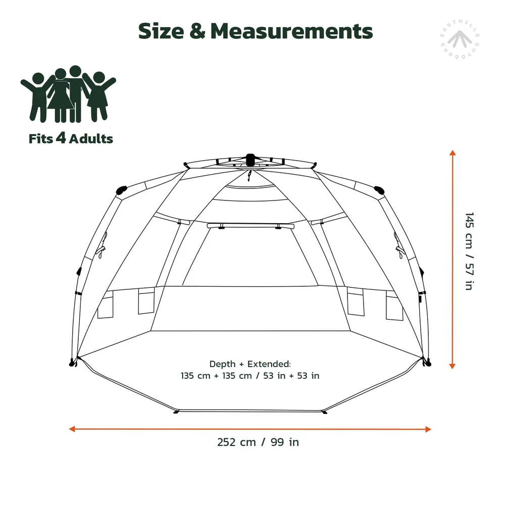Dark Shelter Technology: Coated with Dark Shelter coating, this Instant Shader not only effectively blocks 97.5% of UVA and UVB rays (UPF 50+) but also eliminates 90% of direct sunlight for maximum sun protection. It creates an oasis on the beach for your whole family. Family Size: Take shade and comfort wherever you go. With a super-spacious interior of 99" W x 53" D x 57" H and 53” front porch, even 4 adults can sit and lay down comfortably inside the tent. Enjoy as long as you like, and when it's time to go, the Instant Shader Silver Shelter packs down to 41" x 8.5" x 8.5". Toss it over your shoulder and easily load it into the trunk of your car without discomfort. Patent-Pending Opening Machanism: End the frustration of putting up and taking down large beach tents. The Instant Shader's patent-pending opening mechanism allows to set up and disassemble with smooth movements. Create your family’s beach oasis in less time, with less strain. Winning! Great Airflow: Some outdoor tents can get stuffy and humid on hot days. Not the Silver Shelter. Large mesh windows and double guyout points let you enjoy great ventilation and breezes, while staying shaded from the sun. Versatile & Convenient: It's inevitable: long days at the beach will have surprise pop-ups. The Instant Shader's versatile design can handle them all. Zip up the front to change into dry clothes in privacy. Protect your tent from high winds with guylines. Store valuables in the overhead mesh pocket.