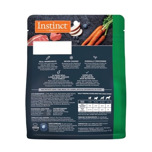 Instinct Freeze Dried Raw Meals, Natural Dry Dog Food, 3 Ounce (Pack of 1) Description Instinct Freeze-Dried Raw Meals Grain-Free Lamb Recipe is a healthy dog food that provides a superior alternative to traditional kibble. Featuring 3x more real meat and nutrient-rich organs than Instinct Original Kibble, this raw dog food delivers complete, balanced nutrition for a happier, healthier pup. Unlike traditional dry food, our freeze dried dog food recipes are never cooked. This preservation method maintains full nutritional integrity, resulting in complete and balanced high protein dog food made with the pure, real nutrition of raw. Freeze dried raw dog food retains more natural flavor and nutrients than kibble, offering the same nourishment found in fresh dog food but in a convenient shelf-stable form. This freeze dried food supports lean muscles, digestion, and vibrant skin and coat and is made without grains, corn, wheat, soy, legumes, or artificial colors or preservatives. Harness the power of raw ingredients with Instinct dog food—minimally processed natural dog food made in the USA with the finest ingredients from around the world. Features: UPGRADE FROM KIBBLE TO FREEZE-DRIED RAW: 3x more real meat & nutrient-rich organs than Instinct Original Kibble, delivering high-quality animal protein for strong, lean muscles MINIMALLY PROCESSED: Never cooked and less processed than kibble to preserve ingredient integrity, nutrients, and deliver complete, balanced nutrition POWER OF RAW: Feeding raw supports healthy digestion, lean muscles, strong bones, and vibrant skin & coat NATURAL INGREDIENTS: Made with 85% meat & organs and 15% non-GMO fruits, vegetables, vitamins & minerals; free from grain, corn, wheat, soy, legumes, artificial colors & preservatives. CRAFTED IN THE USA: Made in the USA with the finest ingredients from around the world for a wholesome, complete diet Product Details: Handling We will ship all orders within 1 business day of payment. Delivery We Do Not Ship Outside of the Continental US. Return Policy All items qualify for returns within 30 days of receipt. Buyer is responsible for return shipping on any item that is not damaged. Feedback We take our reputation seriously, we buy and sell online, so we understand the value of trust. If you are unsatisfied with your order, please contact us and we will work with you to resolve it to your satisfaction.