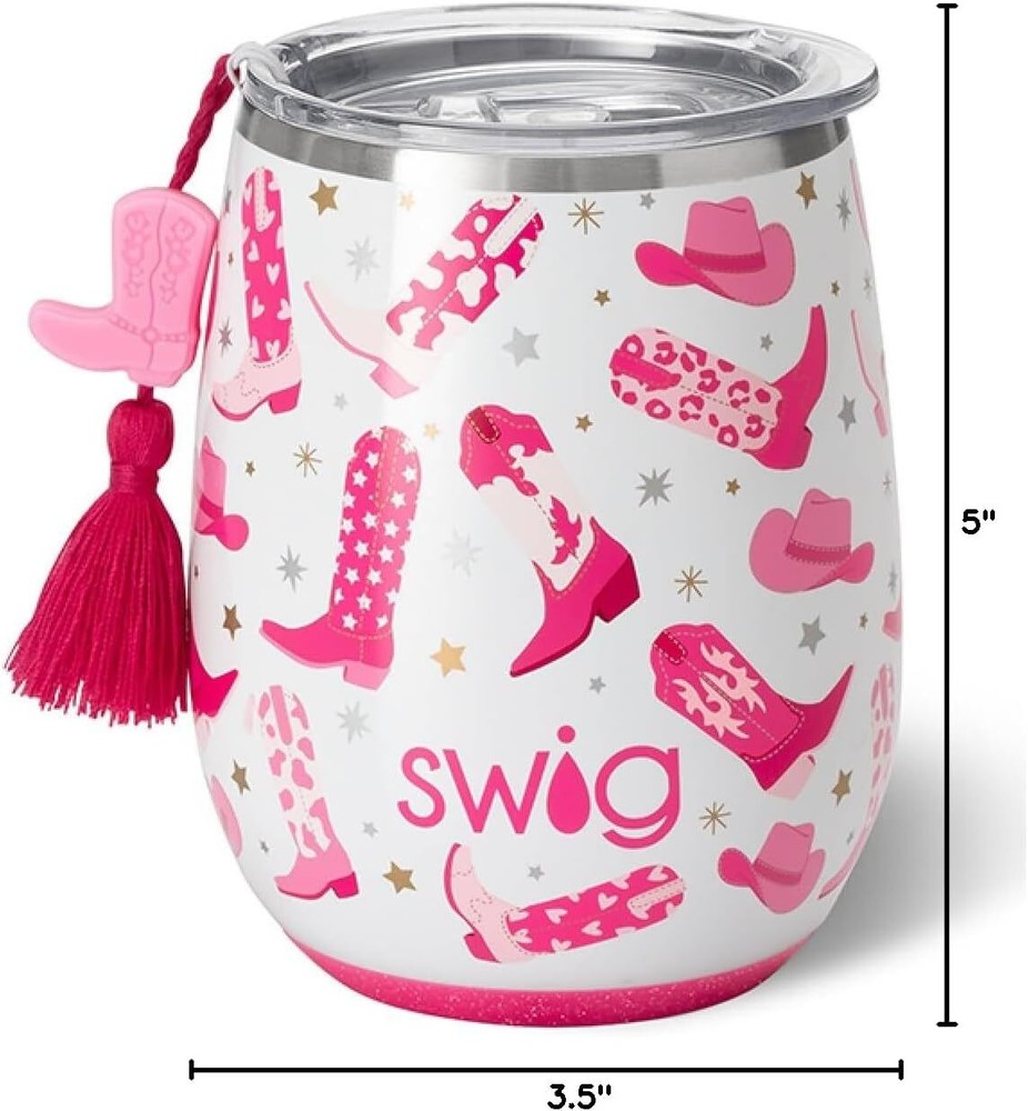 14OZ WINE TUMBLER WITH LID keeps cold white wine or rose cold for 9 hours and hot drinks hot for 3 hours with Swig Life's triple insulated, copper-plated, stainless steel cups. Insulated stemless wine glass holds 2 glasses or about half a bottle of your favorite wine. VERSATILE WINE GLASSES are perfect for trips to the beach, pool, or other glass free zones. Durable, non breakable, and condensation free, this insulated cup is perfect for everyday use. HIGH QUALITY INSULATED CUP keeps your drinks at the perfect temperature all day long. The large opening allows ice to fit with ease, and the spill resistant, removable slider lid lets your choose how you want to sip. TRAVEL WINE TUMBLER includes a lid (compatible with Swig reusable straw sets) with a removable slider for an easy sipping experience. Features a built-in coaster base that prevents slips, drips, and scratches. Top rack dishwasher safe. VARIETY OF COLORS AND PRINTS to choose from makes the Swig Life range of cups, travel mugs, tumblers, and water bottles the best unique drinkware you'll find. We also offer a variety of bags, coolers, straws, straw toppers, and other water bottle accessories to style your Swig.
