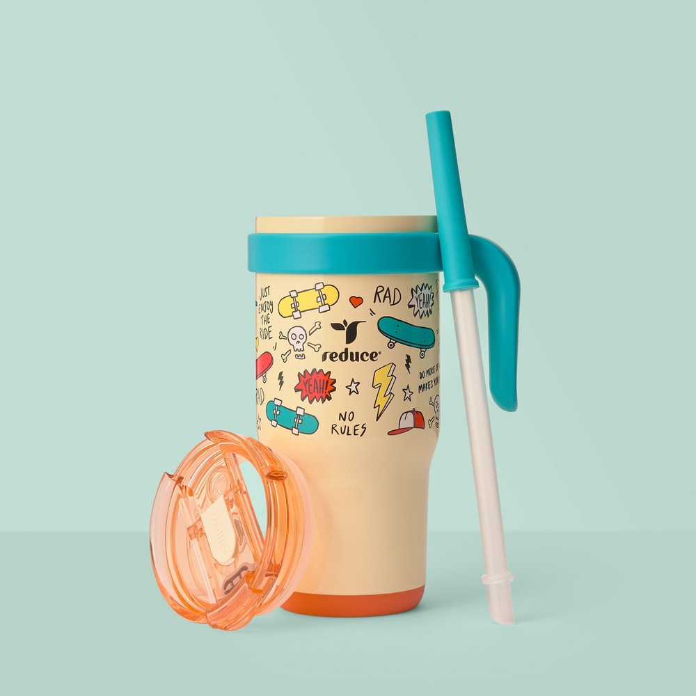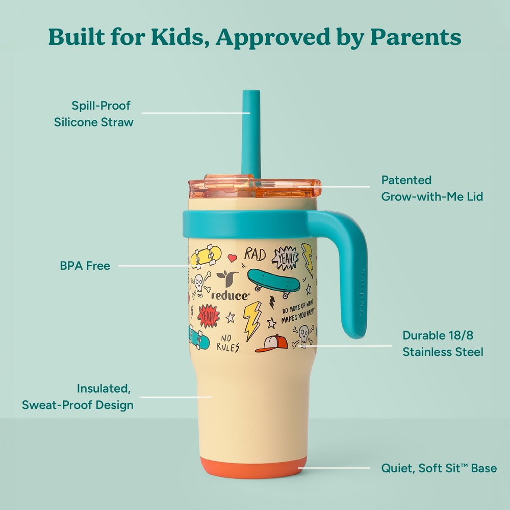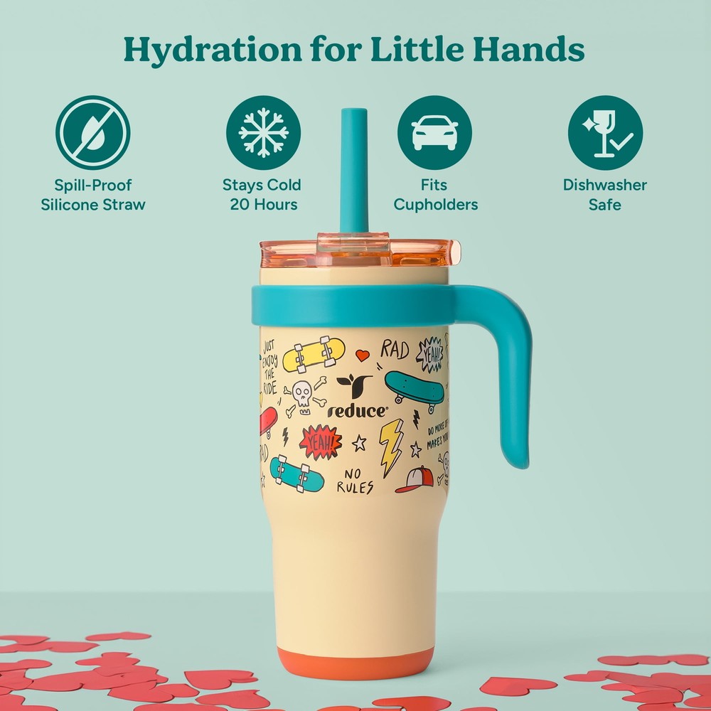 The Reduce 18oz Coldee Tumbler, the ultimate hydration buddy for your little ones! Designed with busy kids in mind, this 18oz tumbler is perfect for keeping their favorite beverages cold for up to 20 hours. Whether it's for school, sports, or any adventure, the spill-proof straw and patented 3-in-1 lid ensure drinks are accessible without the mess. Its Soft Sit base and convenient handle makes it easy to take on the go, fitting snugly in most cup holders. Made from durable stainless steel and BPA-free materials, the Coldee cup can withstand the rigors of daily use and is dishwasher safe for hassle-free cleaning. Plus, the reusable straw promotes a healthier planet. Let your kids sip, drink, or gulp their way. to hydration with the stylish and practical Reduce Coldee – because fun never has to pause for a refill. Featuring a charming Valentine's Day design, this tumbler is a great Valentine's gift for your little sweetheart - sugar-free and less-mess! SPILL-PROOF STRAW - Soft silicone and spill-proof straw ensures less messes GROW-WITH-ME LID - Start sipping from the spill-proof straw then graduate to drinking from the lid spout DURABLE & DISHWASHER SAFE - Easy to clean and separates to wash, built to last FITS CUPHOLDERS - Fits your cupholders and booster seats for easy travel BPA-FREE & STAINLESS STEEL - Vacuum insulated to keep drinks cold up to 20 hours. Safe and fun travel mug for kids favorite drink with a Valentine's Day design