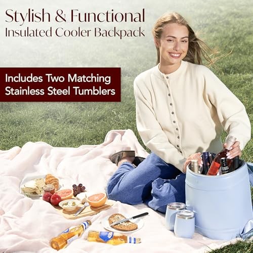 Insulated Cooler Backpack with 2 Stainless Steel Wine Tumblers Leakproof Lightweight