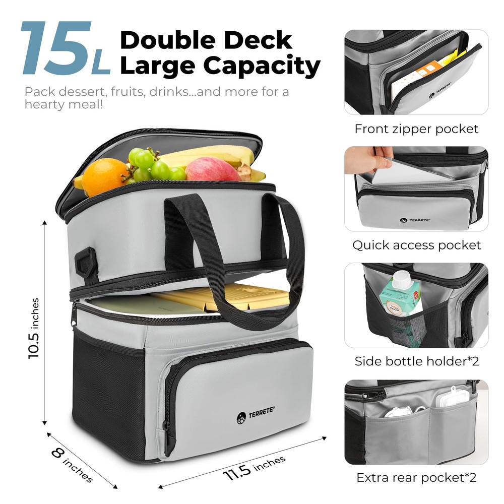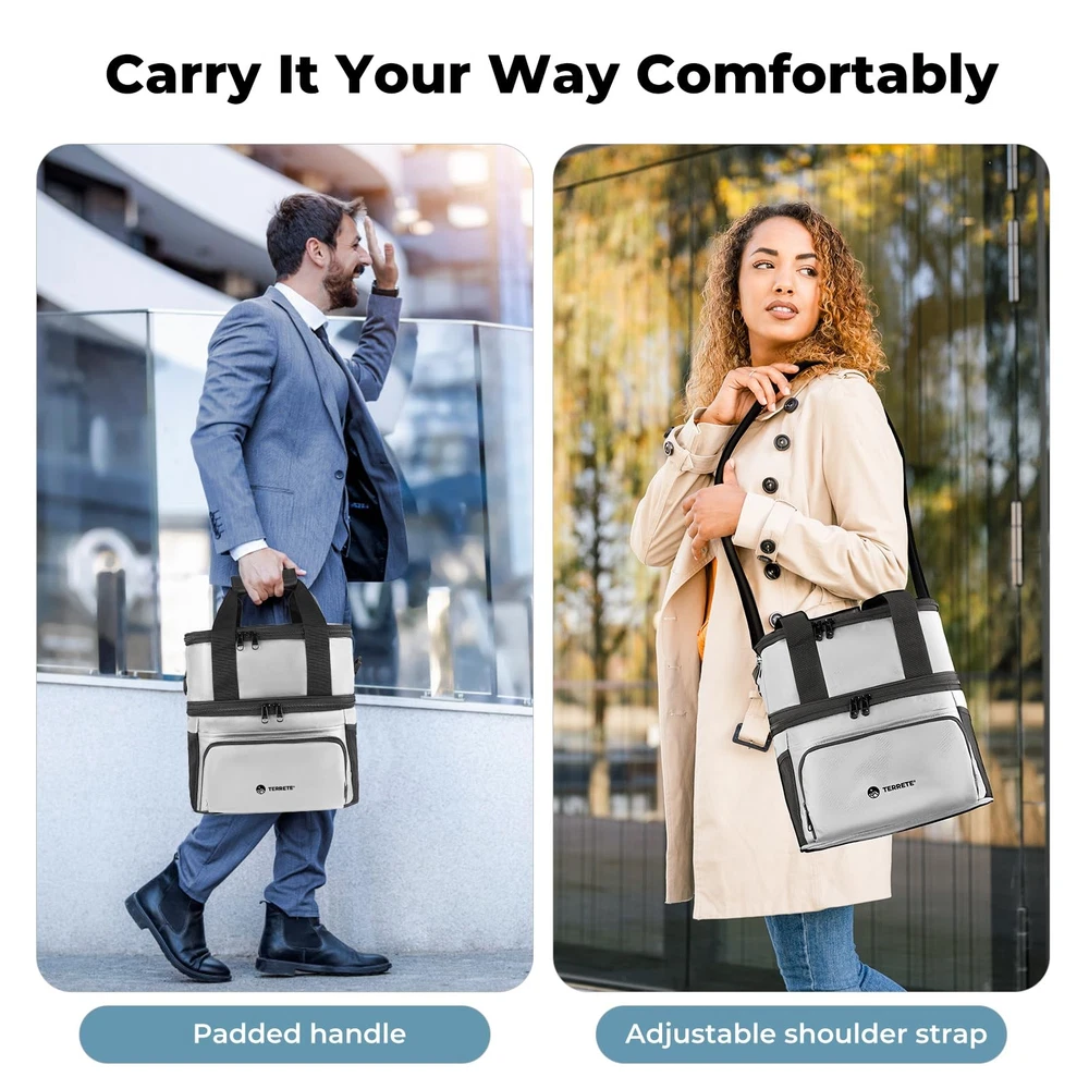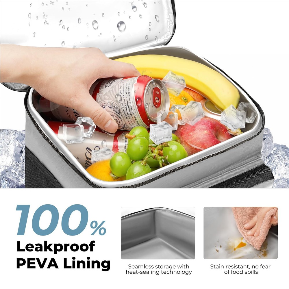 Fresh food, all day! This insulated lunch bag (7hr ice cold!) keeps meals perfectly chilled or warm with 4-layer insulation. 100% leakproof lining, premium YKK zippers, and a water-resistant PU leather exterior make it functional and stylish. Easy cleanup & comfy carrying (handle and shoulder strap). A perfect gift for on-the-go eaters! Double Deck & Lasting Freshness: This large insulated lunch bag (11.5×8×10.5″) boasts 4 layers of insulation materials (with 5mm extra thick pearl cotton) for exceptional 7-hour cold retention (tested with ice) and heat preservation. And with 15L of 2-deck roomy storage for lunch boxes, fruits, drinks, and more, you can pack it all and keep fresh all day 100% Leakproof Confidence: Experience the peace of mind of 100% leakproof storage with our seamless PEVA lining. No more worries about spills from beverages or melted ice ruining your lunch bag, so you can pack any food you want to keep warm or cold with complete confidence Trusted YKK Zippers: This lunch bag for men is built to last with premium YKK zippers. Renowned for smooth operation and durability, these zippers stand up to regular use with ease, ensuring a consistently hassle-free experience every time you open or close your bag Effortlessly Cleanup: The lunch bag for women boasts beautiful PU leather exterior and PEVA liner with impressive water & stain resistance, enabling you to effortlessly wipe clean for any spills, stains and enjoy a lunch bag that looks great and stays pristine with minimal effort The Perfect Gift for On-the-Go Eaters: Surprise someone special with the gift of fresh, healthy lunches! This insulated lunch box keeps meals perfectly chilled or warm for hours. Plus, it features a comfy handle and adjustable shoulder strap for easy carrying, making it perfect for busy lifestyles