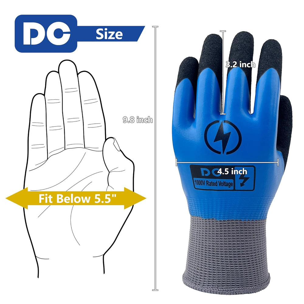 Store New Arrivals Add to Favorite View Feedback Contact Insulated Electrician Gloves 1000V Voltage Resistant Flame Retardant Work Gloves Description Item model number 1000VG Color Blue Brand DongChu Material Rubber Department Unisex Adult Team Name 1000V-1pair Special Feature Electrical Package Dimensions 11.5 x 8.03 x 0.67 inches; 3.21 ounces Size Large Insulation Performance: The palm part of the work gloves is insulated, making them ideal for use as an additional safety measure when working with electrical equipment under 1000V. Rubber Palm: The gloves have rubber palms that offer strong insulating and flame-retardant properties, providing safety and reliability during use. Anti-Slip Grip: The textured palms ensure a firm grip with anti-slip design, helping you handle tasks with confidence and prevent mistakes. Durable Nylon Fabric: Made from nylon fabric, the electrician's gloves are tough, resistant to wear and aging, and have a long-lasting lifespan. Versatile Use: These gloves are perfect for a range of home and professional tasks, such as handling instruments, appliances, mechanical equipment, automotive work, and other installation and maintenance projects. Product description Fully rubber - overed front The entire palm and fingers are covered with rubber foam, which effectively provides insulation and anti - slip properties. Waterproof layer coverage The back is covered with dipped rubber, further protecting safety with waterproof effect. Insulation level display On the back of the hand, the electric - resistance grade is clearly marked, allowing you to see it intuitively during use and ensuring your peace of mind. Design of constricted cuffs The constricted cuffs keep the gloves firmly on your hands and prevent dust from entering. Standards QB/HJYT-003-2022 Max. Use Voltage 1000V Color Blue Glove Hand Style Left and Right Proof Test Voltage 2000V Glove Size 10 ABOUT US We offer the best prices around on high quality products. Our E-store includes media such as books, movies, music and games while offering electronics, toys, sporting apparel, clothing, tools, general home, garden items and more. SHIPPING We are always working hard to ensure your package arrives as soon as possible. Please understand that some factors like weather, high postal traffic, and the performance of shipping companies are outside of our control. We offer free shipping to the lower 48 states and ship within 2 business days of payment, usually sooner. We do not accept P.O. Boxes. Please provide a physical address. RETURNS We offer a 30-Day Return Policy on items which you are not completely satisfied with. You have the option for a full-refund or an exchange of the item. No returns are available on items shipped outside of the USA. PAYMENT We accept PayPal. CONTACT US This page content is yet to come Please ad us to your favorite seller and visit again later Thank You CUSTOMER SATISFACTION We try our very best to make sure every customer is completely satisfied. If there's a problem, message us! We're happy to help.