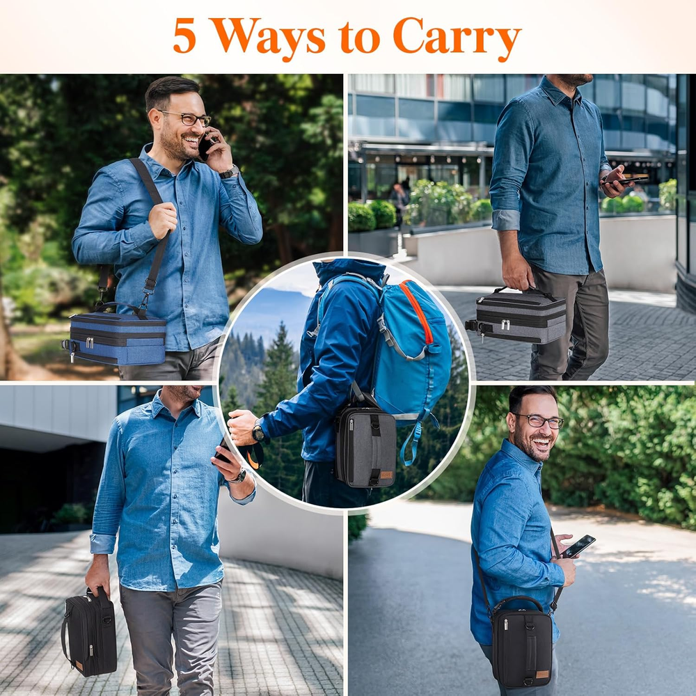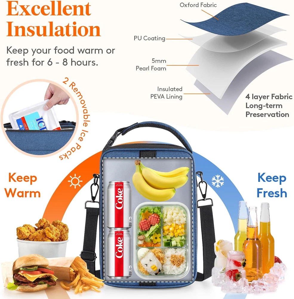 Excellent Insulation: Enhance cool insulation with 5mm thick PE cotton and 2 removable gel ice packs. Use exterior pockets to separate ice packs from food, preserving freshness and cleaning for 6-8 hours. Refrigerate ice packs for 6 hours before use for optimal performance. 5 Ways to Carry: The lunch bag can be carried horizontally or vertically using its dual padded handles or adjustable shoulder strap. The side handle is equipped with a quick-release buckle, allowing for hands-free carrying when attached to backpacks. Perfect for work, picnics, camping, and everyday use. Expandable Capacity: This lunch bag looks small but packs a punch. It measures 10.2" x 7.1" x 3.8" and can be expanded to 10.2" x 7.1" x 5.5" by zipping off the extra layer, providing the double space. It’s perfect for storing lunch boxes, fruits, snacks, drinks, and more, ensuring you’re covered for the entire day. Premium Leakproof Material: The lunch bag features a cationic fabric exterior that shields your bag from splatters and light rain. Its fully-lined, leakproof interior is easy to clean by wiping it with a towel. Practical Design: The lunch bag features strong two-way zippers that open wide, allowing for easy access to your food. And it offers 4 D rings that can not only attach shoulder straps but hang other items like keys or other items, adding to its versatility. Product Description The video showcases the product in use. The video guides you through product setup. The video compares multiple products. The video shows the product being unpacked. Highlights and Advantages Excellent Insulation Enhance cool insulation with 5mm thick PE cotton and 2 removable gel ice packs. The exterior pockets separate the ice packs from the food, preserving freshness for 6-8 hours. Expandable Capacity It measures 10.2" x 7.1" x 3.8" and can be expanded to 10.2" x 7.1" x 5.5" by zipping off the extra layer, providing the double space. Perfect for storing lunch boxes, fruits, snacks, drinks, and more. Details We Care Smooth Zippers Our lunch bag features sturdy metal zippers that smoothly slides and won’t easily break. Reinforced Handles The two padded handles are designed with reinforced seams for added strength and a comfortable grip. Waterproof Oxford Fabric The outer fabric is crafted from water-resistant Oxford material, ensuring protection from occasional splatters or light rain. Seamless Leakproof Features an ultra-thick EVA soft lining and hot-welded seams to prevent leakage. It is easily cleaned with a towel. Ready to Pack and Go 1 Work 2 College 3 Day Trip Compare These Lunch Bags Add to Cart Add to Cart Add to Cart Customer Reviews 4.2 out of 5 stars 159 4.6 out of 5 stars 51,444 4.6 out of 5 stars 995 4.6 out of 5 stars 11,132 4.6 out of 5 stars 4,200 Price $16.99 $ 16 . 99 $12.99 $ 12 . 99 $16.99 $ 16 . 99 $29.99 $ 29 . 99 — Volume 6.5L(12 Can) 8.5L (12-Can) 12L(16-Can) 23L (32-Can) 30L (50-Can) Dimensions 10.24" x 7.09" x 5.51" 10” x 6.7” x 8” 10" x 6.7" x 9.5" 14.9“ x 8.6” x 11“ 15.7” x 10.6“ x 12.2” Color Black/Grey/Blue Black/Grey/Blue/Dark Grey Black Black/Grey Black/Grey Insulated ✔ ✔ ✔ ✔ ✔ Leakproof Interior ✔ ✔ ✔ ✔ ✔ Carry Style 2 Handles & 1 Shoulder Strap 2 Handles & 1 Shoulder Strap 2 Handles & 1 Shoulder Strap 2 Handles & 1 Shoulder Strap 2 Handles & 1 Shoulder Strap