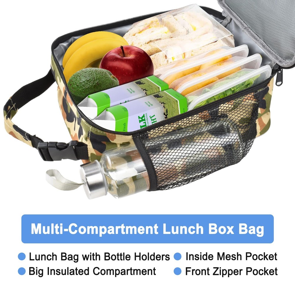 Insulated Lunch Bag, Leakproof Portable Lunch Box for Women Men Boys Girls, Large Capacity Cooler Bag with Handle and Bottle Pocket for Office School Camping Hiking Outdoor Beach Picnic High-quality Material: The lunch bag is made of 600D Oxford cloth, waterproof and leak-proof, wear-resistant, easy to clean and can be reused for a long time. The sturdy two-way zipper makes it easy for you to place and take out the lunch box. It is an idea gift for 7-18 years old children, boys. Keep Food Hot / Cold: Our insulated lunch bag has an insulating layer to keep your lunch hot/cold for hours, keep your food fresh. It can meet all your daily lunch, meal preparation or snack needs. Multi Compartments:Our lunch box is designed for maximum storage efficiency, 1 main zipped pocket, 1 internal mesh pocket, 1 side mesh pockets. provides you with plenty of space to store lunch boxes, fruits, snacks, drinks, etc. The sturdy double zipper design of the main pocket is very easy to open and close. Easy to Carry: the size of the lunch bag: 10.2" L x 4.3" W x 8.6" H, suitable for 6 cans or 1 person lunch. With a detachable buckle/handle, it can be tied to any backpack and suitcase, making it an ideal lunch bag for work, office, school and travel, suitable for men, women, boys and girls. Easy to Clean: Our lunch bags are waterproof and leak-proof, the inner lining can be easily wiped clean with a damp cloth. Cleaning is effortless.