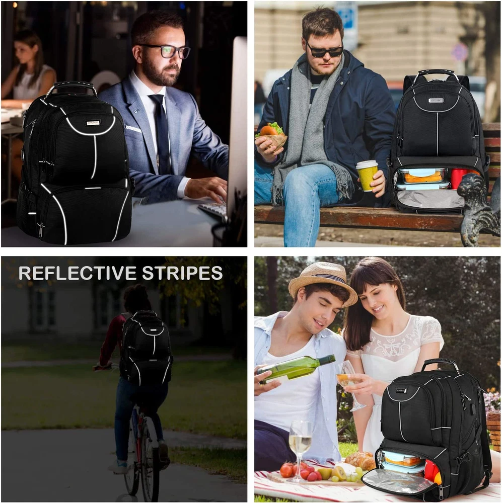 Business is our speciality NEW Lunch Bag Backpack, Insulated Cooler Lunch Box Backpack, Extra Large Travel Laptop Backpack TSA Friendly RFID Computer College Bag with USB Port for Women Men Fits 17.3 Inch Laptop FEATURES INSULATED LEAKPROOF COOLER FUNTION:Our Lunch Backpack not only keeps warm but also keeps cold drinks for about 2-4 hours. The quality insulation layer of lunch box compartment keeps fresh and warm, which makes it easy to clean. Travel backpack cooler bag is suitable for office,picnic,beach,trip,travel,outdoor&indoor. Dimension of the cooler compartment: 11.8 x 7.8 x 7.8 inch Large Capacity USB Charging Port: 2 Large compartments give excellent protection for 2 laptop computers and tablet.Largest main compartment hold for 2-3 days travel clothing.Many hidden pockets can accommodate lots of travel accessories,notebook, personal toiletries,side Zipper pocket for Easy access essentials, external USB port with set-in charging cable offer convenient charging your cellphone and other electronic devices.A hole for headphone outside gives easy access to Earphone usage TSA approved RFID ANTI-THEFT: Unfolds the extra large backpack 90-180 degree making you quickly through the airport security and keep items tidy,Designed for airplane traveling. The big backpack perfect for indoor/outdoor activities,Served as college backpack.RFID Pocket with RFID-radio frequency identification help secure personal data encoded on you credit cards,IDs and passports.The anti-theft pocket on the back of backpack,easy to put your phone, purse and passport Back Luggage Strap Chest Strap: Back U-shaped ventilation design help for the air convection. Adjustable shoulder straps with padding help relieve the stress from your shoulder. A luggage strap allows backpack fit on luggage/suitcase, slide over the luggage upright handle tube for easier carrying;The Adjustable chest strap bring the shoulder straps in tighter to the chest. Also, the laptop backpack with a sturdy rugged handle with steel cable on the top for carrying MATERIAL SOLID: Heavy duty XL backpack made from quality polyester nylon fabric, with heavy-duty two-way waterproof zippers across the backpack are convenient to operate on whichever side you prefer, for a secure and long-lasting usage everyday/weekend. A rugged handle with steel cable on the top for easy carrying, Side compression straps keep the versatile stylish backpack at whatever size you requires Product Description INSULATED COOLER DESIGN Dimension of the cooler compartment: 11.8 x 7.8x 7.8 inch The lunch box backpack with a insulated cooler compartment, keep foods cool or warm for 2-4 hours, easy to clean and storage when not use. Let you enjoy delicious food at any time, for college, work, office, picnic, hiking, camping, fishing, cycling, other outdoor activities and daily life use. RFID POCKET&TSA FRIENDLY Owns 20+ Independent pockets large business backpack for men/women Spacious main multi compartments with many hidden pockets can accommodate lots of stuff like college supplies, travel accessories, clothes, stationery, notebook, cord organizer, side deep zipper pocket for easy access essentials, Side elastic net pockets conveniently hold travel gear umbrellas or water bottles. AIRFLOW BACK & LUGGAGE DESIGN Tech backpack with Back U-shaped three-dimensional ventilation design help for the air convection, ventilation, and heat elimination. Comfortable wide breathable mesh shoulder straps with plentiful sponge pad help relieve the stress from your shoulder. Both sides of the shoulder strap with lanyard design can hang sunglasses and other small pendants. A luggage strap allows this travel backpack hook to luggage/suitcase. Feature for Travel Laptop Lunch backpack : GREAT CHOICE The great graduation present for college Practical present ideas for men and women as Valentine's Day Gifts/Anniversary present Special day for him or her, for your husband / wife / lover / son / daughter / father/mother/friends As Everyday backpack, Work backpack, Study bookbag, Xl backpack, Business laptop backpack for men women adult or daily use at anywhere An ideal present for men women as Valentine's Day present/Anniversary present MULTI-FUNCTIONAL BACKPACK With inner high-density foam and leak-proof liner, making sure anti-leaking.Keep cool or warm about 2-4 hours Luggage / Suitcase strap on the back is great to slide over the luggage tube and attached to your rolling luggage securely for easier transport. Don't have to carry the backpack on your back, less burden on your shoulder and back when on the go. Also fit under seat The hidden theft proof pocket designed on the back sits up against the wearer's body. Anti-Pick pocket back pocket is difficult to steal personal items, store your valuables such as passport and money when traveling so no one can get into it without you feeling it A must have for work supplies, travel accessories and laptop accessories. External pockets on both sides are made of elastic mesh, expands to secure various size water bottles and compact umbrella External USB port with set-in charging cable offers convenient charging your cellphone and other electronic devices everywhere. A hole for headphone outside gives easy access to Earphone usage Open freely 90-180 degrees making you quickly through airport security. A good laptop backpack for men!1 * Padded Laptop Compartment: TSA-friendly designed, shockproof padded sleeve compartment fits laptop up to 17.3 inch For occasional international Travel / Weekend short trip getaways / Airplane travel / Outdoor Hiking Camping Backpack for men women / overnight backpack with the large capacity USB charging backpack Color Gray-rfid 7.8 inches x 7.8 inches x 11.8 inches. Weight: 2.82 lb Ask us anyhting Free shipping PAYMENT We accept all payments via Ebay using Credit Cards , PAYPAL , Apple Pay and many others SHIPPING We are always working hard to ensure your package arrives as soon as possible. Please understand that some factors lik
