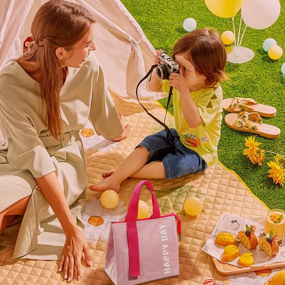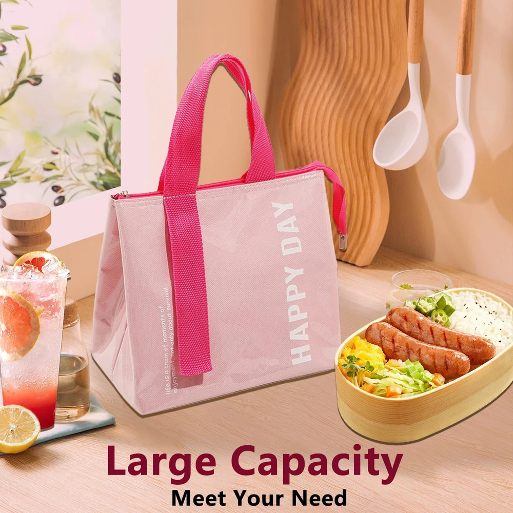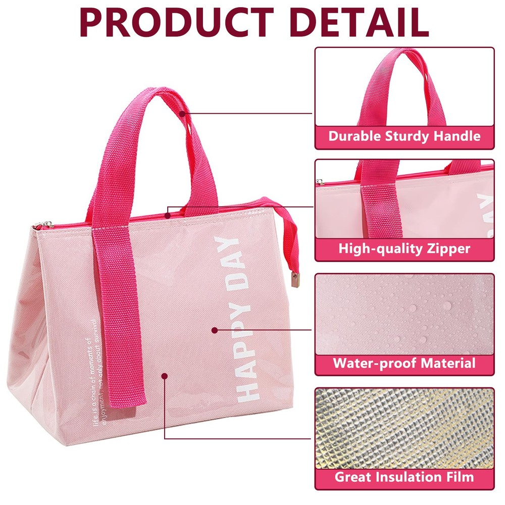 Stylish and Lightweight: The pink lunch tote bag is smooth and lightweight for a comfortable and portable experience, the smooth surface and fashionable design blend perfectly, making you look cute and elegant in all occasions Large Capacity: The lunch tote measures 9.84*7.87*6.29 inches, providing more interior space to hold a variety of food and drinks, making it easy for workers and other people to carry plenty of lunches and snacks to meet the needs of a long day of work and picnic or on the go Three-layer Insulation Technology: The lunch bag consists of an inner layer of food-thickened aluminum film, a middle layer of high-efficiency insulation material, and an outer wear-resistant waterproof layer, isolating the temperature in all directions, keeping your hot food insulated for a long time, and your cold food cold for a long time, keeping it in the best condition, and enjoying the deliciousness anytime, anywhere, no longer subject to the limitations of the environment Easy to Clean: The outer layer of the lunch tote is made of transparent waterproof material, which is waterproof and oil-proof, with high wear-resistant performance, easy to wipe, and can be recycled, making it the ideal portable lunch tote Perfect Gift: The lunch tote bag is a thoughtful companion for carrying lunches and snacks on a daily basis, and is also a practical choice for family and friends at Christmas and gift exchanges