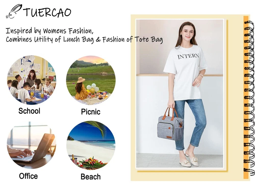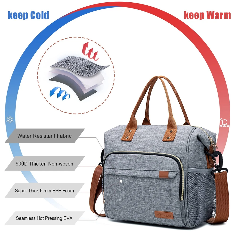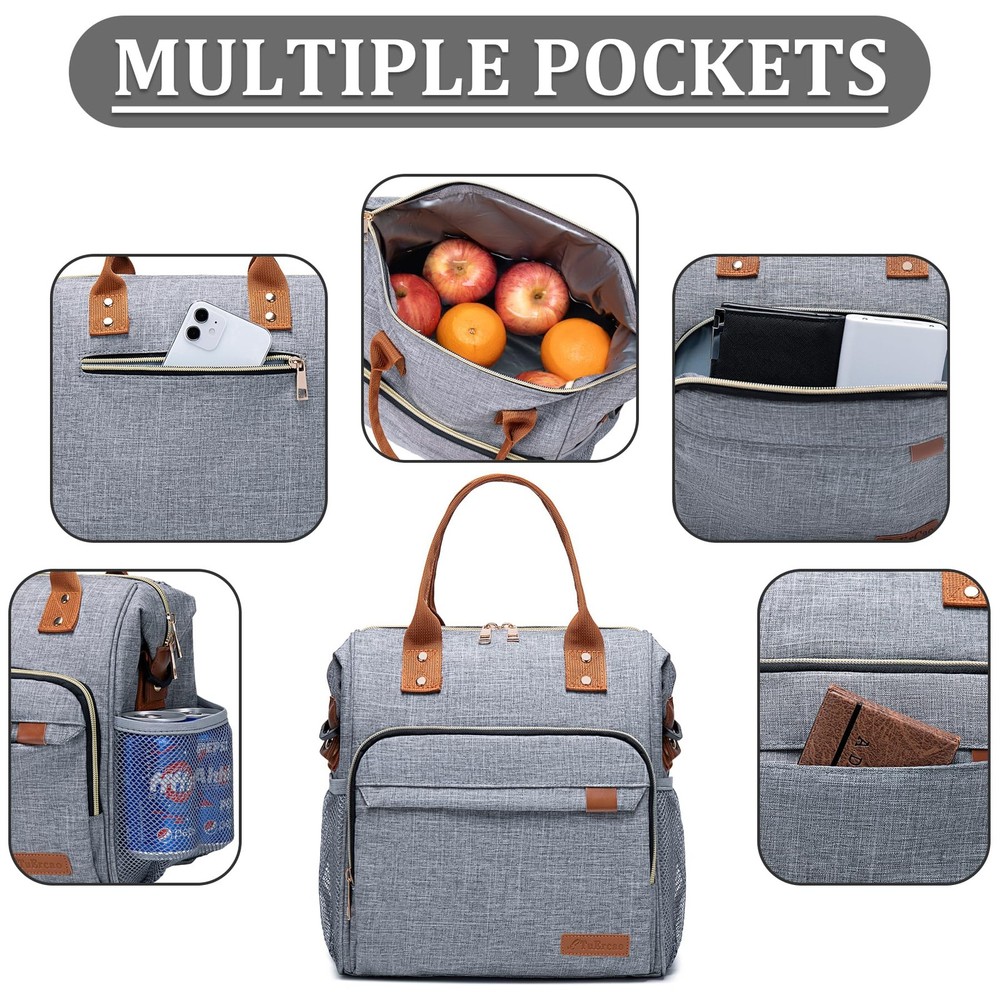 Are you looking for a fashionable and practical lunch bag? Quality life starts with simple stylish design, insulated lunch bags are simple but smart for holding your lunch box. Greatly insulated and portable lunch bag for your work, travel, picnic, etc. HUMANIZED DESIGN Durable Construction : Made of high quality material, durable, waterproof and leakproof, rip-resistant and maximum durability. Dual Zippers: Premium reinforced metal SBS dual zippers, secure zipper closure and metal buckle ensure smooth open. Three Ways to Carry: Detachable & adjustable shoulder strap and padded handle ensure you more comfortable carrying options. Easy to free your hands once switch to a shoulder bag. Super Large Capacity: Dimensions are 10.25" х 6.3" х 10.5" (L x W x H) , the main compartment is super large capacity and the tote bag can fit 16 can bottles of 330ml drinks. Durable & Reusable:Load-shaking Test Report shows that lunch tote bag can bear more than 10,000+ times irregular machine shaking continuously when the lunch bag loaded 33lb(15kg) MULTI COMPARTMENTS Zippered Front Pocket: There is 1 arrow print front pocket for holding cutlery or storing your snacks. Velcro Pocket : There is 1 velcro front pocket for holding cutlery or storing your necessities, like cell phone, keys . Side Mesh Pockets: Two side mesh pockets are great for drinks, bottles or tissues. Back Privacy Pocket: One back Privacy zippered pocket for important items, like small change, credit card. MULTIPLE USAGE It can be used at work and at any free time. The style is suitable for picnic, street shopping, dinner, class study, outdoor travel, office work, etc. is a company that focuses on design and quality. Original design, Stylish and Top Quality. MULTIPLE POCKETS: insulated lunch bag: 1, Features one main zippered compartment to keep your food and fruits warm or fresh. 2, The front zipper pocket great for your headphones, data cable. 3, The velcro pocket suitable for holding cutlery or your snacks. 4, The back privacy zippered pocket is for your necessities like keys, credit cards, and small change. 5, Two mesh pockets are for drinks, beer, cola, water bottles, shoulder strap or tissues LEAKPROOF & THERMAL INSULATED: reusable lunch bags are equipped with waterproof ethylene vinyl acetate lining, which is soft, leakproof, and easy to clean. Padded with 6mm EPE foam and 900d polyester & composite tarpaulin outer fabric will keep your food fresh or warm when you're on the go DIMENSIONS & CAPACITY: lunch bag dimensions are 10.25" x 6.3" x 10.5" (L x W x H). The main compartment has large capacity and can fit 16 cans 330ml colas. It can hold all of your food like sandwiches, salad, snacks, drinks, and fruits for the entire day PORTABLE & CONVENIENCE: insulated lunch box features one reinforced handle on top for carrying as a handbag or tote bag. And comes with a detachable & adjustable shoulder strap which can be adjusted from 15" to 27" for carrying as a shoulder bag or crossbody bag DURABLE MATERIALS: Premium reinforced metal dual zippers, secure zipper closure, and sturdy buckle ensure smooth open and maximum durability. Our Insulated lunch box follows a strict set of specifications and quality standards WIDE USAGE: This lunch bag can use as a cooler bag, small ice chest, tote bag, work bag, travel bag, picnic bag, beach bag, sundry bag, food delivery bag, reusable grocery bags, reusable shopping bags. This insulated lunch tote is perfect for a family time, house warming, birthday party, picnic and more