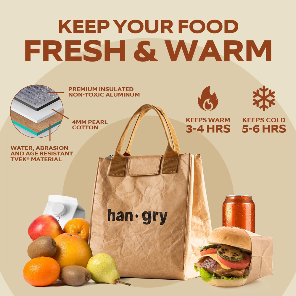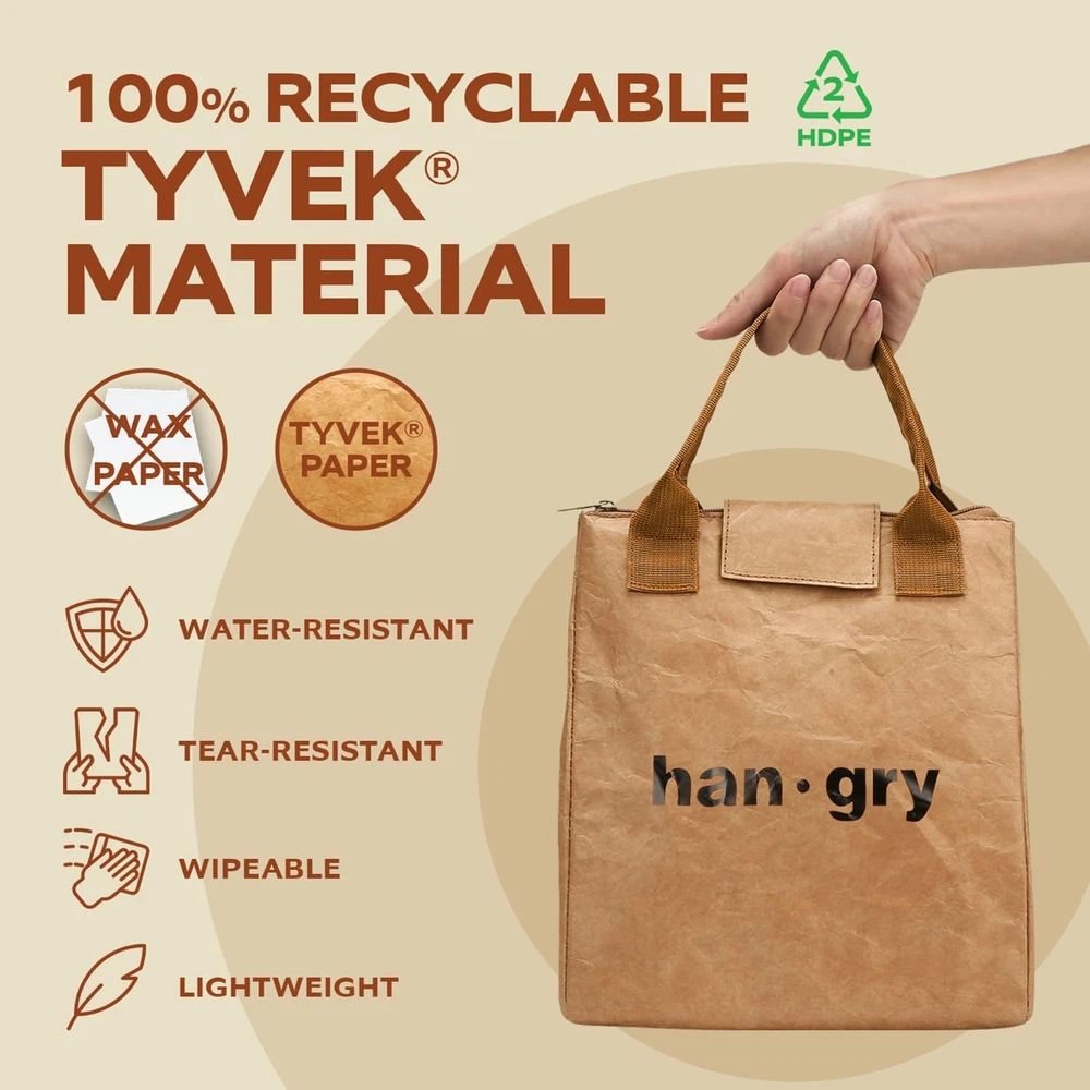 Item Form: Tote bag Number of Compartments: 1 UPC: 7445049095090 Material: Tyvek Product Dimensions: 5.5"D x 5.5"W x 9.5"H Recommended Uses For Product: Office, Work, Outdoor, Yoga, Indoor gtin13: 7445049095090 Age Range (Description): Adult Theme: Nostalgic Shape: Rectangular Brand: Does not apply Capacity: 7 Liters Country of Origin: China Type: Does not apply Style: Classic Pattern: Solid Number of Items: 1 Material Type Free: Plastic Free, Vinyl Free Color: Brown-hangry Included Components: Utensil Pouch, Spork Product Care Instructions: Wipe with a damp cloth Item Height: Does not apply Item Width: Does not apply Closure Type: Zipper, Snap, Velcro Item model number: reusable lunch bag Global Trade Identification Number: 00768492335696 Item Weight: 6.4 ounces