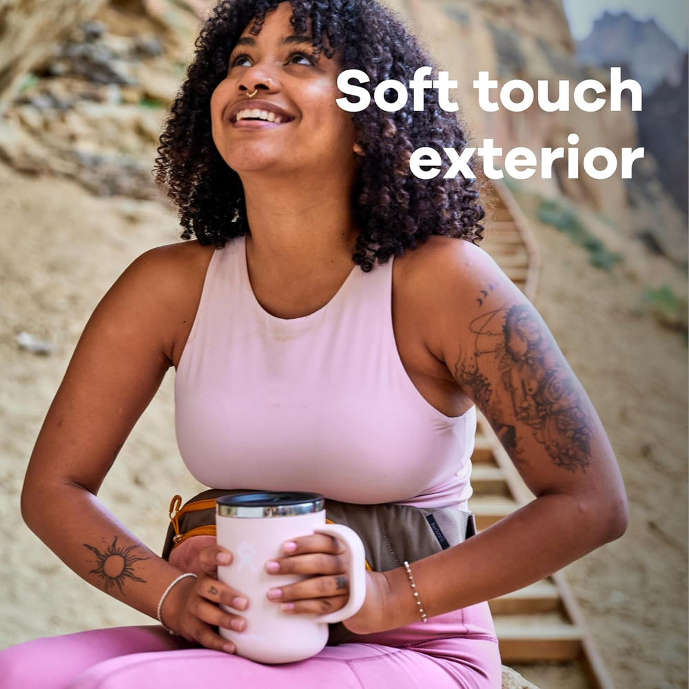 INSULATED MUG: The Hydro Flask stainless steel insulated mug keeps drinks hot for hours. Sized for the perfect cup with a closeable, leak-resistant and splash-resistant lid HOT STAYS HOT: Thanks to the double-wall vacuum insulation, drinks stay hot or cold for hours in this mug. The TempShield insulation ensures the perfect temp, so your drink is always ready for the next sip LEAK-RESISTANT: The closeable leak-resistant and splash-resistant press-in lid on the insulated Mug keeps drinks ready to sip SOFT TO THE TOUCH: The soft-touch exterior stays cool and is easy to hold. The ergonomic handle is strong and durable, and ensures a comfy fit." PURE TASTE: Durable pro-grade stainless steel ensures pure taste and no leftover flavor transfer. So, today's tea have any taste of yesterday's coffee From the manufacturer
