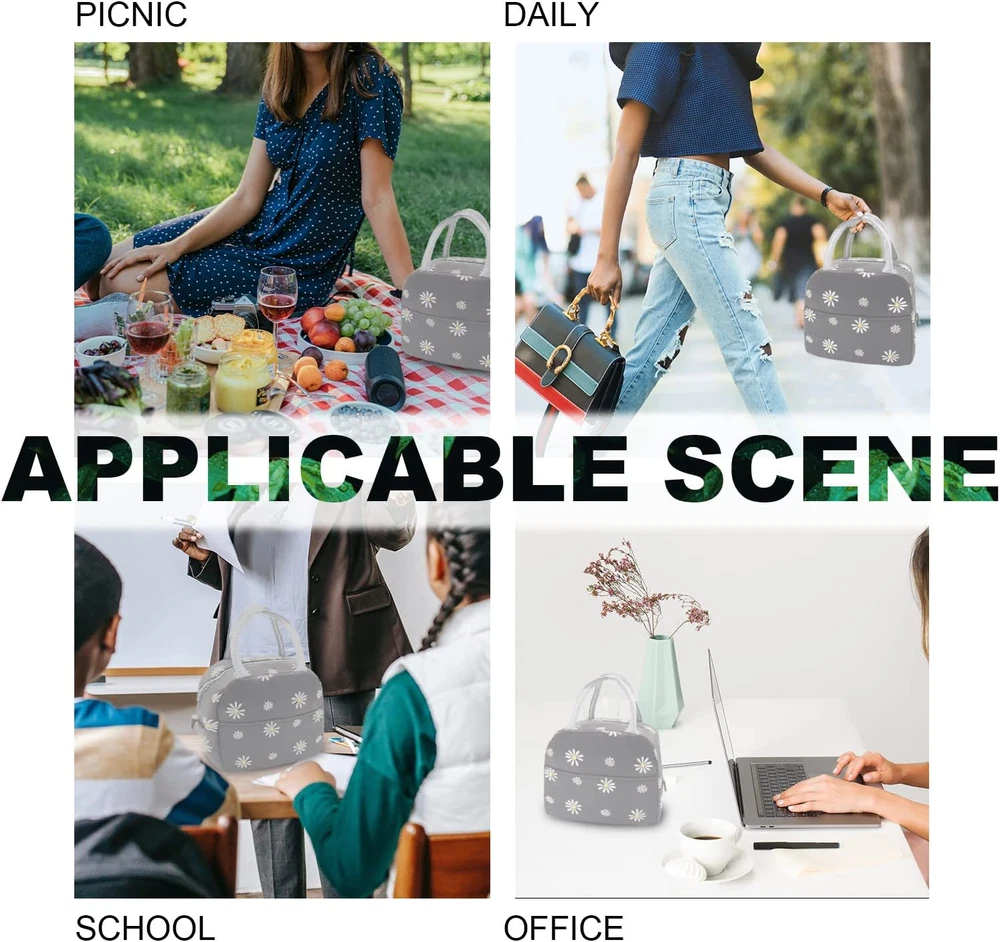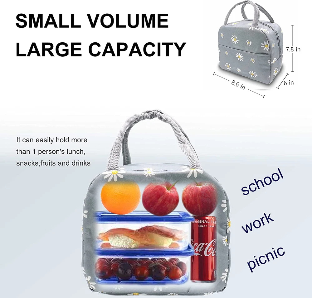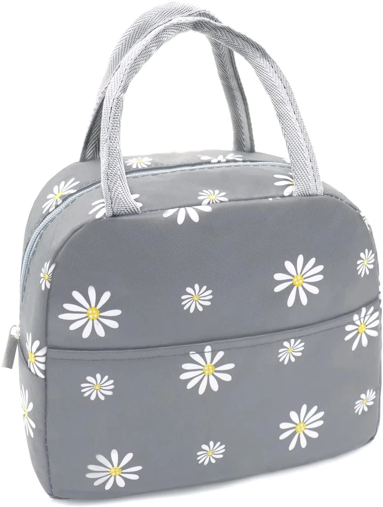 【HIGH QUALITY】The insulated lunch box bag is made of high quality high-density oxford cloth and food-grade waterproof aluminum foil to prevent tears and ensure maximum durability, can be leakproof, easy to clean and reusable 【JUST THE RIGHT SIZE】About 9 x 6 x 7.9 inches and weighing only 0.21 pounds, this insulated tote lunch bag is light in weight but big enough to easily hold all the food and dinnerware as you want (lunch box containers, food, fruit, snacks, canned drinks) 【KEEP YOU FOOD FRESH】The cooler lunchbox bag can keep food warm and fresh for a long time, keep your drinks cold, don't worry about food spoilage, it's like a good assistant for your life 【PERFECT DESIGN】Lunch bag with tote style and front pocket design, you can put in some small stuffs you need in life: keys, cards, tissues, cell phone etc; Cute Floral pattern style lunch bag, ideal gift for teen girls women or ladies 【MULTI-PURPOSE LUNCH BAG】You can use it as an insulated lunch bag, cooler bag to carry lunch containers and drinks, outdoor picnic bag, grocery bag or shopping bag; Reusable lunch bag, very lightweight with soft handle, can be used in any occasion, such as office, work, school, beach, outdoor picnic etc Product Description Keep Your Food Fresh The cooler lunchbox bag can keep food warm and fresh for a long time, keep your drinks cold, don't worry about food spoilage, Use an ice pack for better results. It can carry 1 lunch container, some snacks and fruit, even drinks. If you don't need to bring a lot of stuff to work, This lunch bag is prefect for you. it's like a good assistant for your life. Reusable Cute Tote Lunch Bag Unique Front Pocket Easy for you to store little things, such as cutlery, napkins, tissues, keys, mobile phones ect. Fashion Tote Bag Design Easy to carry, Handbag design, fashionable and durable, Can also be used as your daily handbag. A good style for Ladies or women Cute Daisy Pattern Cute lunch bag with high quality HD oxford cloth, Can be effectively waterproof It can meet your daily needs Insulated Lunch Bag & Easy to Clean Specifications: Insulated Lunch Bags Color: Grey with White Daisy Outer layer fabirc: Waterproof Item Weight: 0.21 lb Package size: 9 x8.27 x 0.79 inches Packing List: 1 Pcs White Daisy Insulated Lunch Bag Lunch bag Not for children under 12 yrs