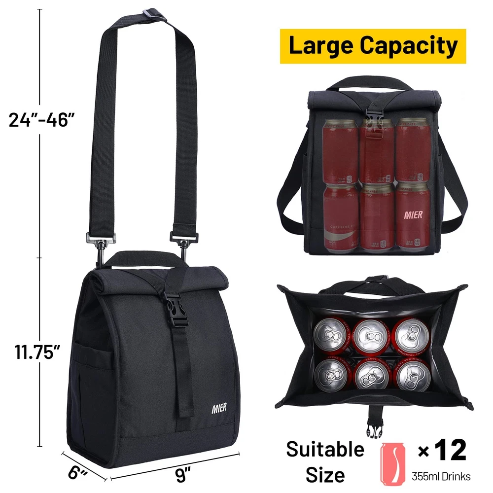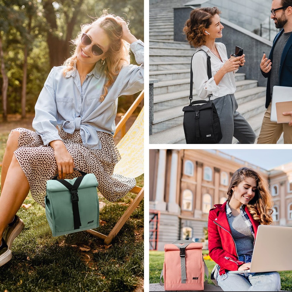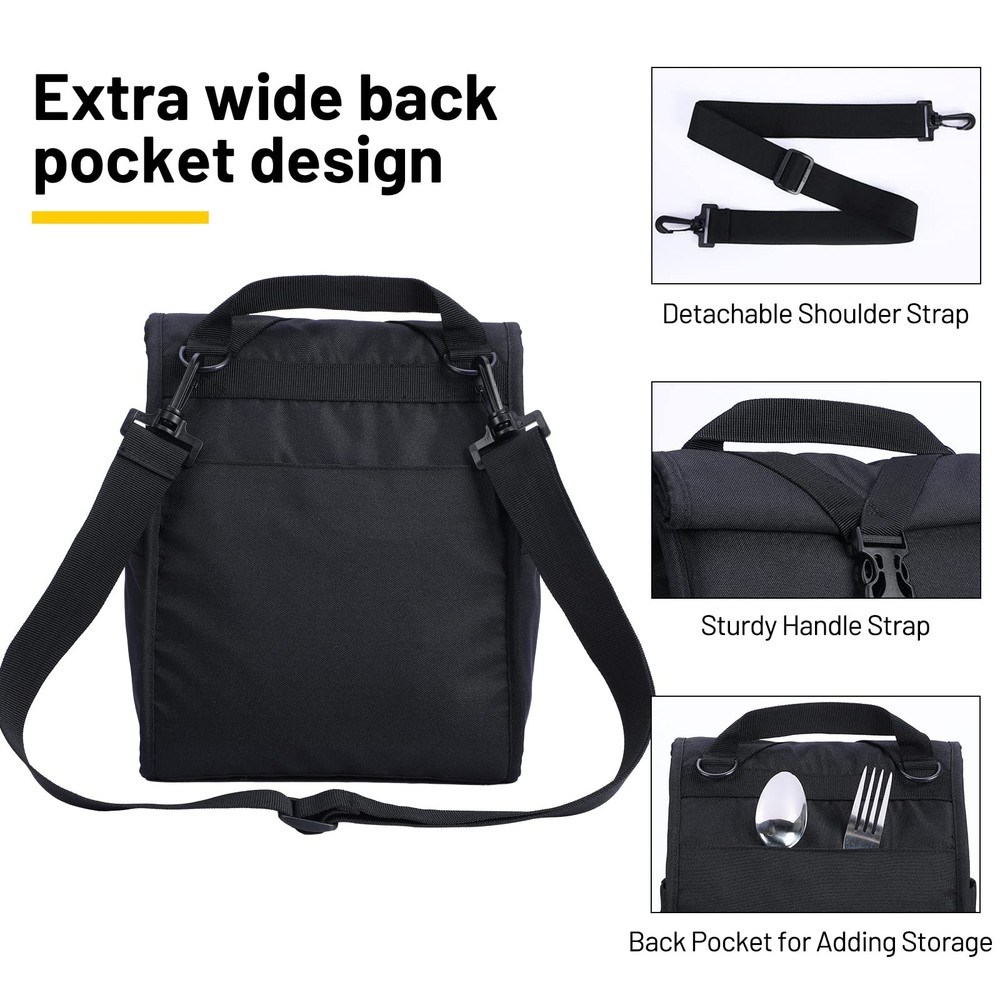 More Than Just a Lunch Bag – Your All-in-One Food Companion Whether you're preparing for a short weekend getaway or trekking on a mountain trail, this roll-top insulated lunch bag transforms into your personal pantry-on-the-go. With its stretchy sidekick pockets and expandable belly, it's like having a mini refrigerator that moonlights as a gear organizer! Why It Stands Out *Dual Side Pockets: Elastic mesh pockets securely hold water bottles or small accessories, freeing up main compartment space. *Roll-Top Expansion Magic: Simply unroll the top to add 2+ inches of vertical space – ideal for tall meal prep containers or last-minute snack additions. *3-Way Carrying Options: Switch between the padded shoulder strap, top handles, or backpack-style carry with quick-adjust buckles. Office & Commutes: Keep meals fresh for hours with leak-resistant insulation, ideal for desk lunches or midday snacks during busy workdays. Outdoor Adventures: Durable, water-resistant design protects contents during hikes, picnics, or beach trips, while lightweight portability fits into backpacks. Fitness & Errands: Compact yet spacious enough for protein shakes, snacks, or groceries, ensuring freshness post-workout or while running errands. Can the side pockets fit large bottles ? Yes! The retractable side pockets to hold your water bottle and umbrella. Reinforced stitching prevents tearing, even with heavy stainless steel bottles. Is the roll-top closure truly leak-proof? When fully rolled down and clipped with the buckle, the triple-sealed edges create an airtight barrier. The closure buckle strap is flexible and you can adjust the strap length according to your need How to clean the interior after spills? Simply wipe with a damp cloth – no lingering odors or stains. 【Roll Top Lunch Bag】Dimension:9 L x 6 W x 15 H inches, after roll:9 L x 6 W x 11.75 H inches. Zipperless design, the wide opening main compartment can hold 12 Cans which perfectly store the whole day food that you need. The closure buckle strap is flexible and you can adjust the strap length according to your need 【Multiple Pockets Lunch Tote】The 2 retractable side pockets are perfect for your water bottle and umbrella. Extra 1 hook & loop closure back pocket is available for organizing small things like tissue, utensils, phone, key, wallet or other small stuff you need 【Insulated Lunchbox】Three-layer heat insulation and roll-up tops are designed to keep your lunch stay cold/warm/fresh for hours. Easy to clean, if your food spill inside, just wipe it off with a wet cloth or napkins and it will be good as new 【2 Carrying Ways】Sturdy top handle for easy carrying. No zipper lunch box come with an adjustable & detachable shoulder strap providing more carrying options, free your hands to hold other items, which is more convenient, stylish and attractive 【Durable & Sturdy】Lunch cooler bag made of 600D Polyester material, durable buckles and enhanced by bar-tacks at major stress points, providing long-lasting durability against daily activities. Perfect for woman men adult to work office picnic beach