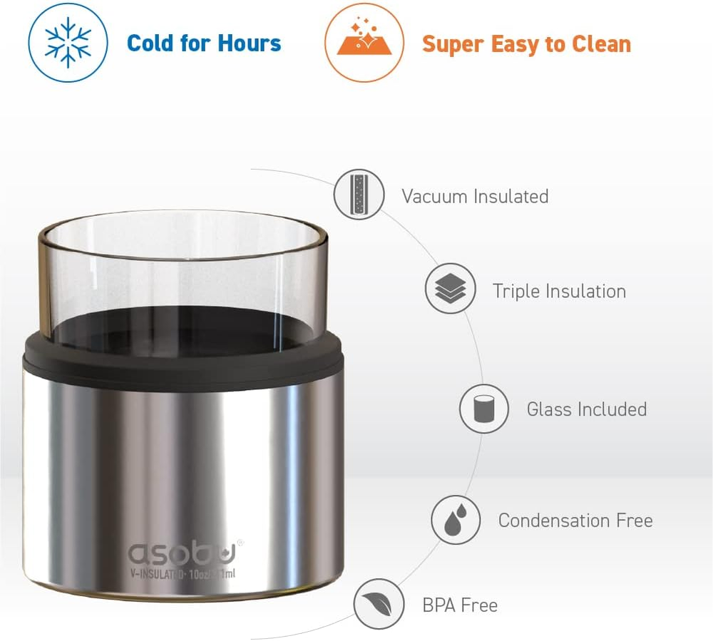 NO MORE WARM WHISKEY - Keep your hands warm and your whiskey cold with our insulated stainless sleeve for your whiskey glass STAINLESS STEEL INSULATED - Our sleeve is designed to keep your whiskey chilled until the last drop without the taste of a stainless steel cup SECURE RUBBER BAND - The band on top keeps your whiskey glass secure in the insulating sleeve DOUBLE WALLED - Chill your whiskey not your hands with the double walls that protect your whiskey INDOOR OR OUTDOOR - Great for use indoors and durable enough for backyard, poolside or BBQ parties Product Description Double Walled Insulation Chill your whiskey not your hands with the double walls that protects your whiskey Premium Glass Includes a quality old fashion whiskey sized glass Condensation Free Sleeve Keep your hands dry and your whiskey cold with the condensation free insulated stainless sleeve. Removable Sleeve The sleeve easily removes from the glass for easy cleaning and storing No more watered down, melted ice whiskey Indoors or outdoors your whiskey will stay cold and pure! Preserve the taste of your beverage Great for use with any cocktail - Enjoy the pure taste of you cocktail in a stainless steel insulated cup! Asobu Bar Collection Add to Cart Add to Cart Customer Reviews 4.7 out of 5 stars 2,505 3.4 out of 5 stars 20 4.7 out of 5 stars 5,193 4.3 out of 5 stars 86 4.1 out of 5 stars 54 Price $21.90 $ 21 . 90 — $29.99 $ 29 . 99 — — Double Walled Vacuum Insulated ✔ ✔ ✔ ✔ ✔ Capacity 10.5 Ounces 17 Ounce N/A 16 Ounces 15 Ounces No flavor transfer glass ✔ ✔ ✔ ✔ ✔ No outer condensation ✔ ✔ ✔ ✔ ✔ Glass Included ✔ ✘ ✘ ✔ ✔