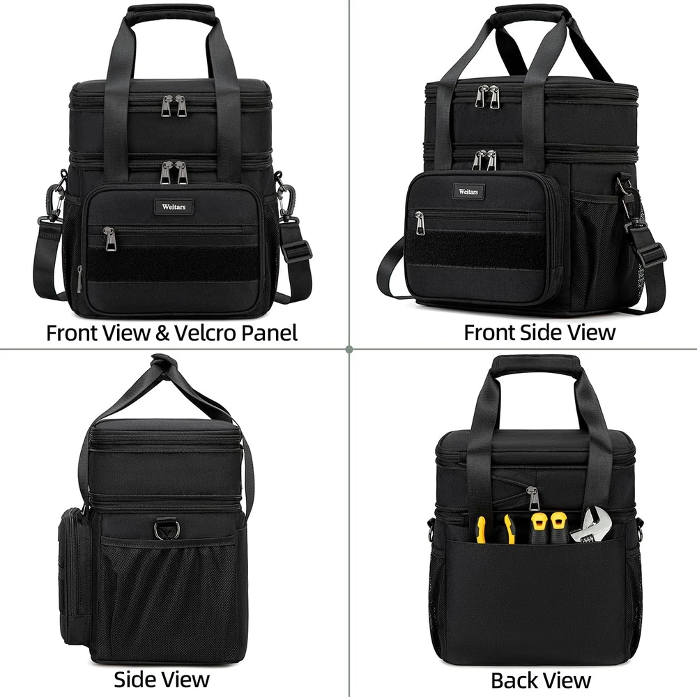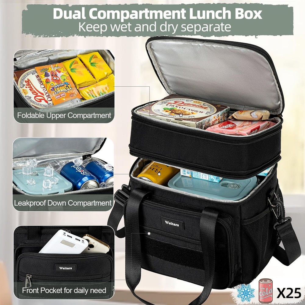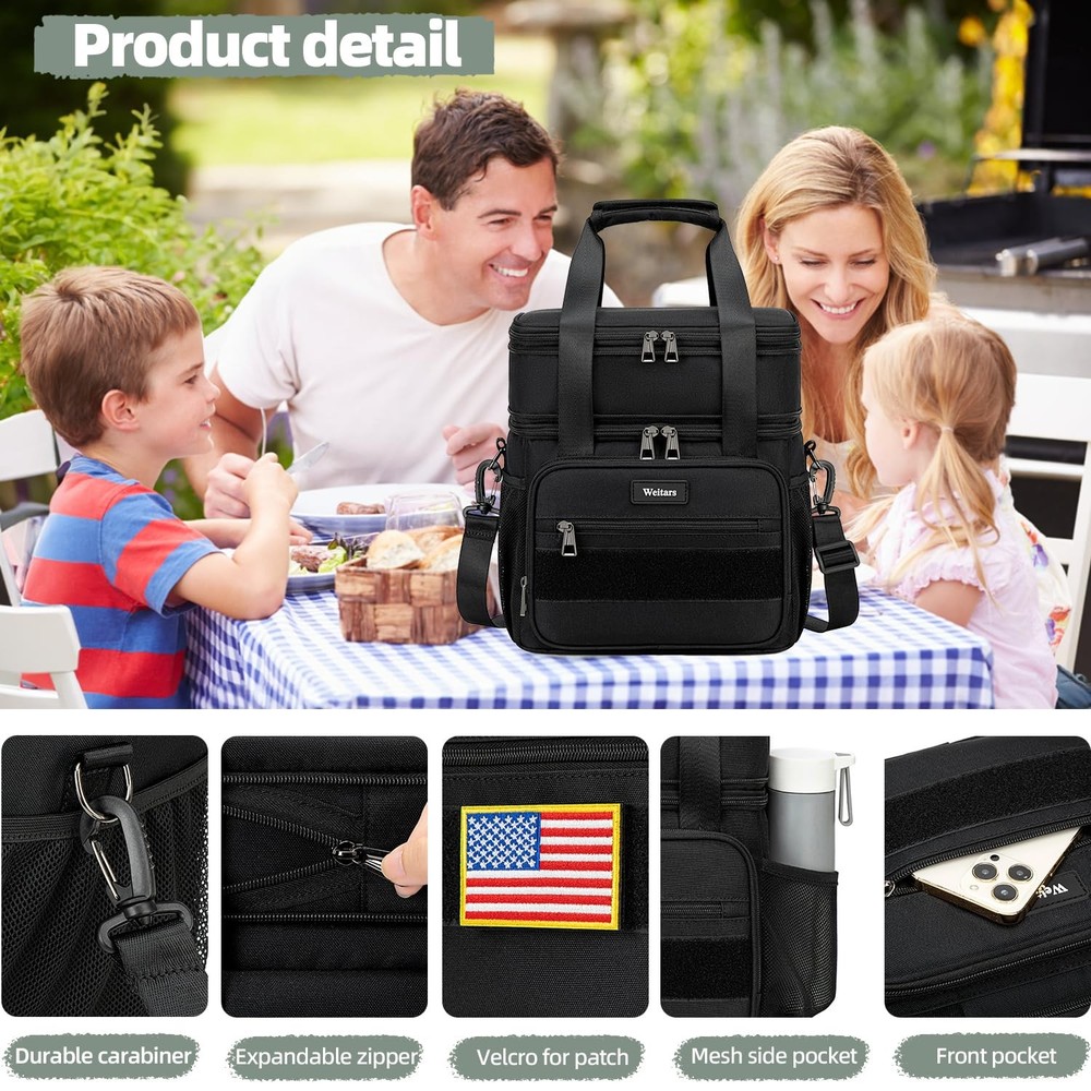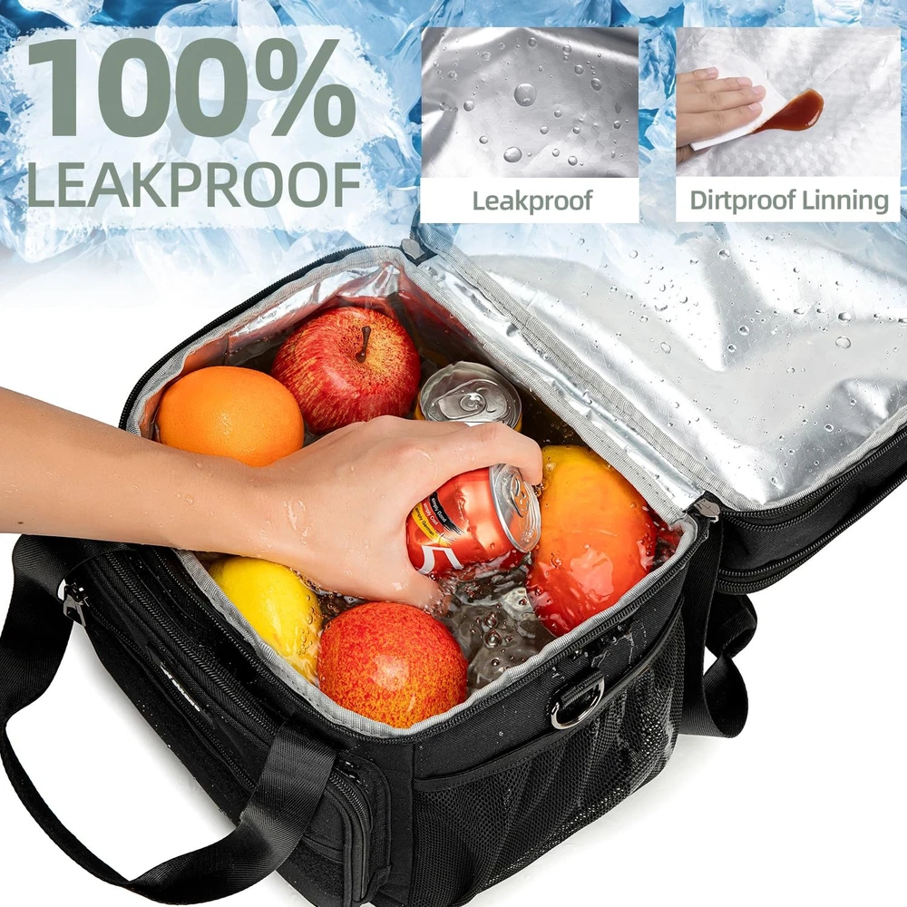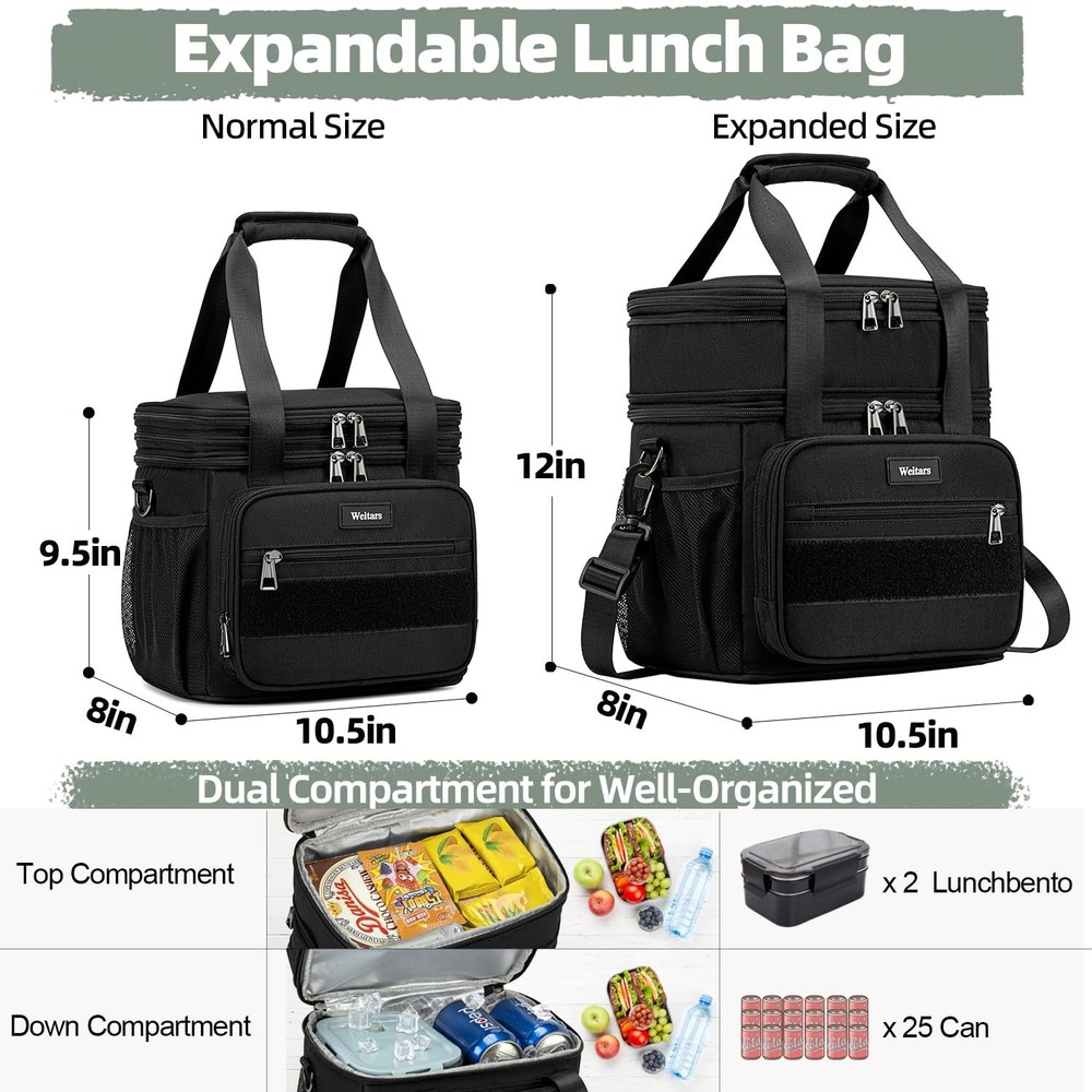 Lunch Box Large Lunch Box with Expandable Design - Dual-compartment lunch box features an expandable design, offering a capacity of 16L that fits up to 25 cans (330ml). The top compartment can expand by an additional 4L, lunch bag loncheras providing a standard size of 12L, making it ideal for various activities such as work, outings, picnics, camping, college and road trips Water-Resistant & Leakproof - Lunch box for men women made from durable, water-resistant material, this lunchbox protects against light rain and spills. The thick lining, combined with a one-piece heat-pressed design, prevents leaks and is easy to clean, insulated bag making it suitable for drivers, construction workers, and athletes Well Insulation Performance - Double decker lunch box features two separate compartments to keep wet and dry foods apart. With 6mm thick insulation and a food-grade liner, lunchbag maintains food temperatures for up to 10 hours. The PEVA lining ensures waterproofing and simplifies cleaning Tactical Style & Multi-Use - Tactical lunch bag has large Velcro patch on the front allows for personalization, lunch cooler has 5 versatile side pockets are designed for conveniently storing bottles, coffee, portable chargers, and other essentials Two Carry Options & Multiple Occasions - lunch box for men women comes with a reinforced handle for hand-carrying and a removable, adjustable shoulder strap. It's perfect for keeping food fresh during picnics, hiking, camping, gym sessions, work, beach outings, and fishing trips