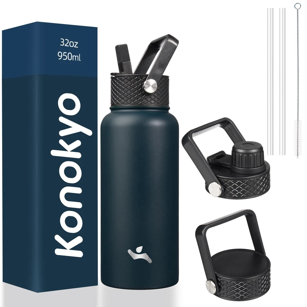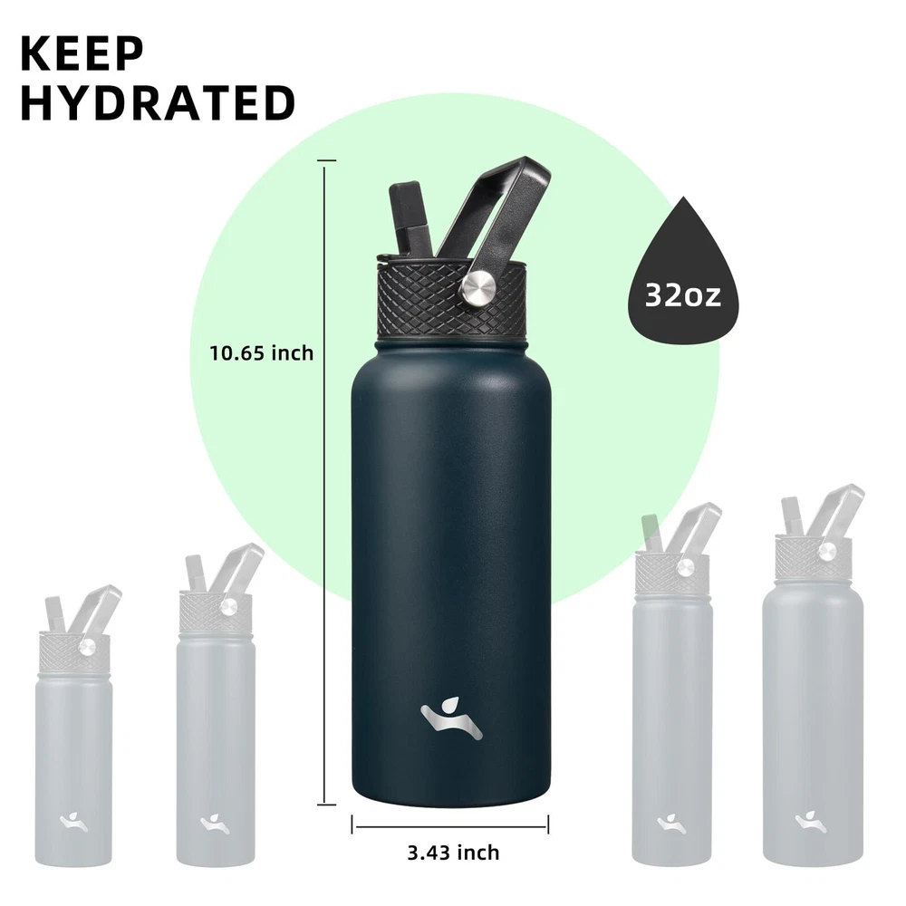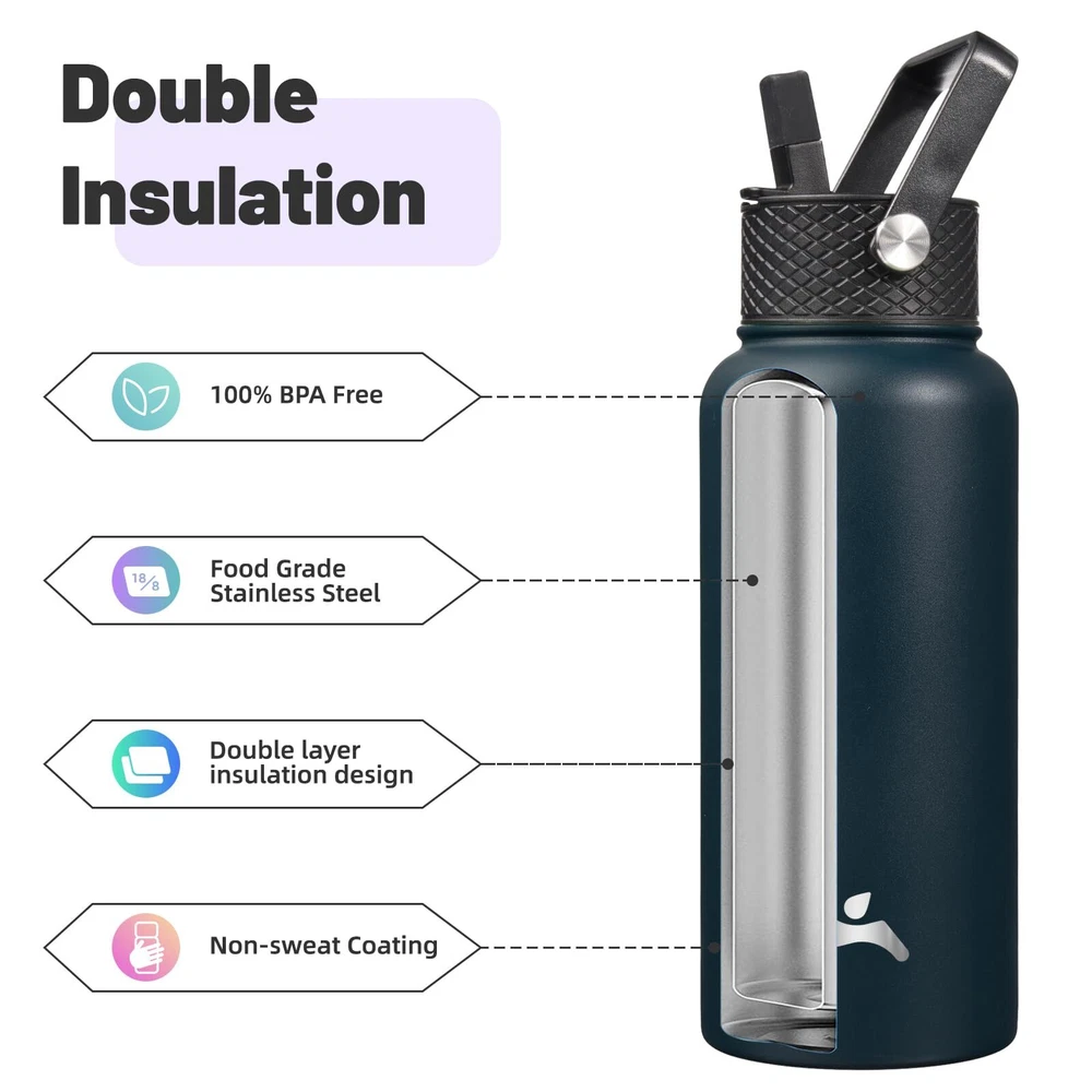 Insulated Water Bottle with Straw, 32oz 3 Lids Metal Bottles Stainless Steel Water Flask,Navy Blue Crafted from food-18/8 stainless steel, the double walled insulated bottle keep your drinks hot for 12 hours and cold for 24 hours.Say goodbye to lukewarm drinks and enjoy refreshing sips of hot or cold beverages whenever you need them The water bottle comes with 3 lids for different beverages, a sip lid for hot drinks, a straw lid for iced beverages, a flex-removable lid(2 different handle lids ship at random) for smoothies or fruit drinks. All lids are BPA-free, leak-proof, and dust-proof, catering to your needs Enjoy a dry grip without any unwanted condensation on the bottle's non-sweat surface. Easy-to-carry design makes it perfect for on-the-go use, the insulated water bottle with straw is a must-have for your daily routine The metal water bottle comes in various sizes, including 18 oz, 22 oz, 24 oz, 32 oz, and 40 oz, with a range of colors to choose from according to your need. The insulated sports water bottle is ideal for outdoor activities, the gym, work, or home use. Carry this water bottle with you wherever you go and stay hydrated all day
