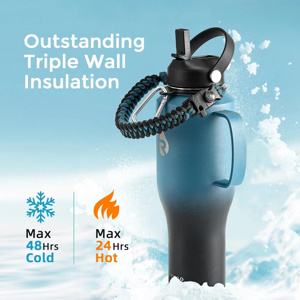 The Go-anywhere Insulated Water Bottle: T-shape design sports a sleek and ice cream cone profile that fits in any car cup holder, so that you can tote it around with zero effort. This 32/40oz water bottle with straw is best and ideal for driving, commute, travel, camp, etc Copper Plated Vacuum Insulation: Double Wall vacuum plus extra copper plate achieves the highest insulation for up to 48 hour keep-cold and 24 hour keep-warm. The water bottle contain no flavors or metal rust. Savor fresh coffee or juice freely no matter where you are. Be at the top of your game all day long The Go-easy Water Bottle: Benefit from the cool features of this bottle with a built-in ergonomic handle and the straw lid ensures you chug at ease anytime, while chug lid allows you to refresh in huge gulps when a quick boost is called for. Plus, survival paracord integrating a whistle and compass for extra portability and practicality Smart Safe & Friendly Features: Food-18/8 stainless steel is Non-BPA and won't corrode or rust without any flavor transfer. Wide mouth design is made friendly for ice adding and washing. Fine textured coat feels nice in the palm and won't slip, ideal for safe driving 100% Satisfaction Support: We offer continuous after-sales service, making sure this bottle sticks around in its top game for years. Package contains 1 x Car Water Bottle with Handle, 1 x Straw Lid with 2 x Straws & 1 x Straw Brush, 1 x Spout Lid, 1 x Paracord Handle
