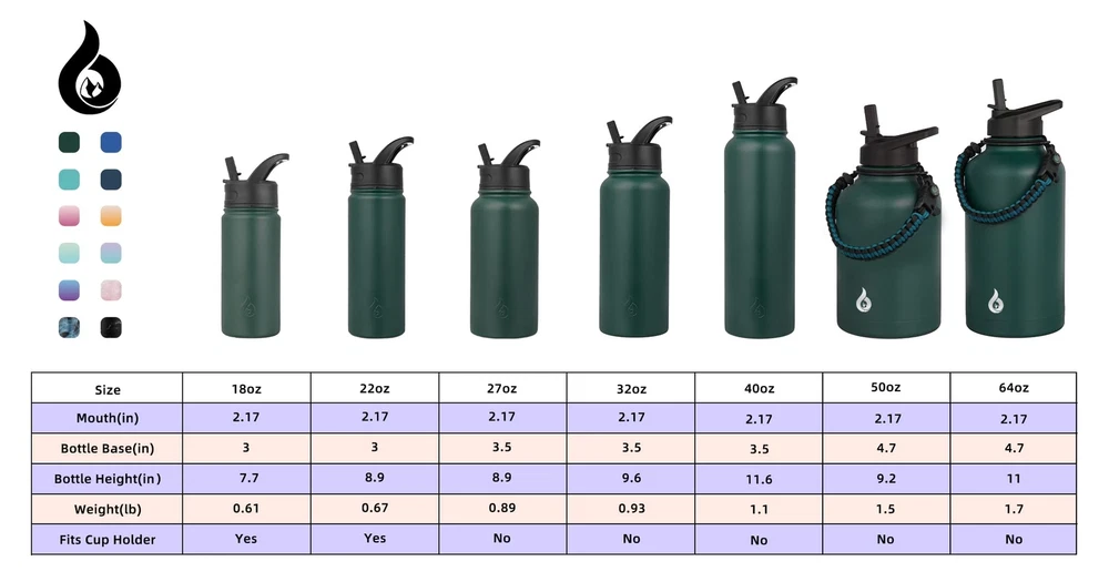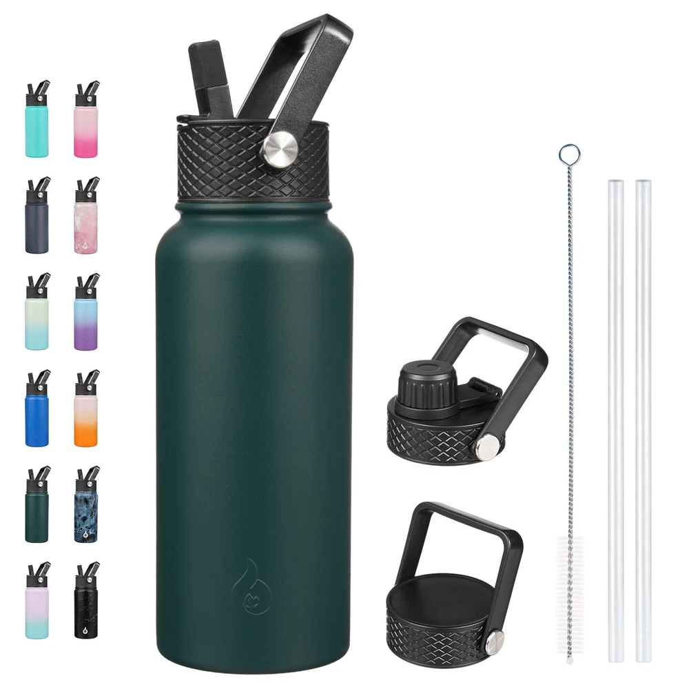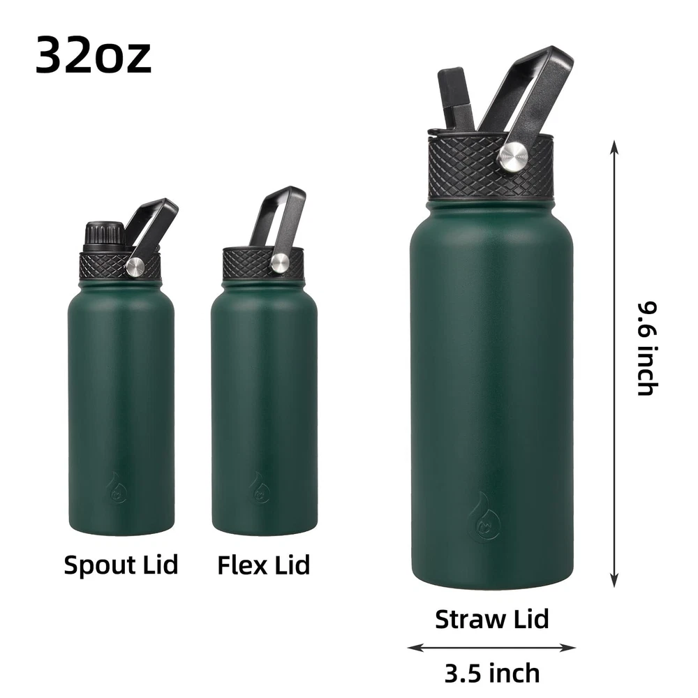 32oz Insulated Water Bottles,Stainless Steel Water Bottle with Straw,Thermo Insulated Water Bottles with 3 Lids,Hot Cold Water Bottles for School-Army Green Insulated water bottles are made of food grade 18/8 stainless steel, crafted with double wall, comes with 3 leak-proof lids, 2 straws and 1 straw brush, it will keep your drinks ice-cold for 24 hours and hot for 12 hours. 100% BPA, durable power coating, fashion colors and non-sweat design are all make it a perfect water bottle for your daily use. Double-walled vacuum insulation keeps drinks cold for up to 24 hours and hot for up to 12 hours, perfect for any activity Durable and long-lasting stainless steel construction with powder coating for added protection against wear and tear Comes with three lids, including a straw lid for easy drinking on-the-go, and is food-grade safe for healthy hydration Designed with non-sweat technology to prevent condensation and accidental wet spots, keeping your bag and tabletops clean and dry Perfect for hiking, camping, workout, or office use, this insulated water bottle with a straw is an eco-friendly alternative to plastic bottles