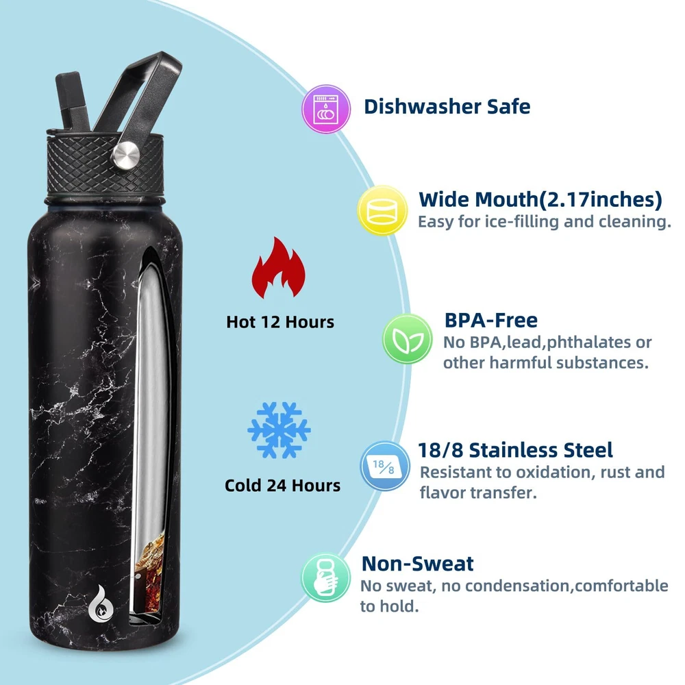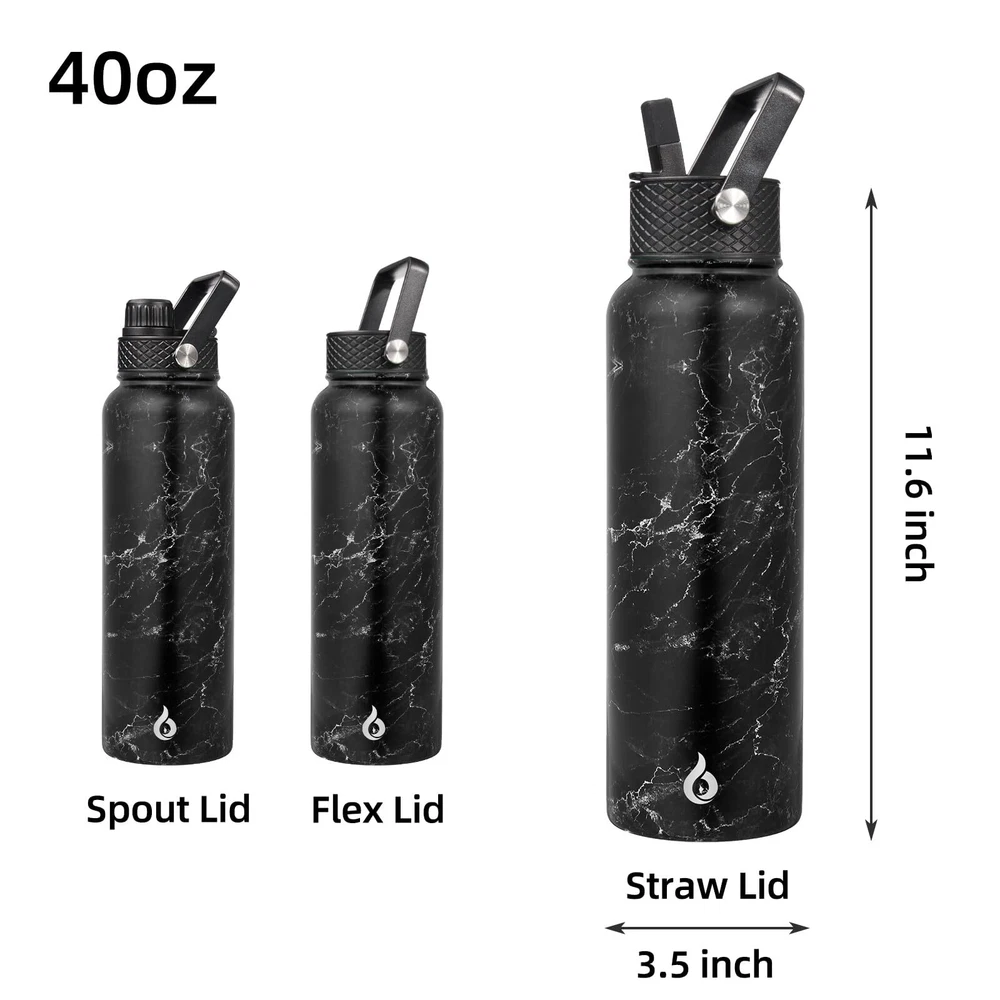 Insulated Water Bottles with Straw Lid, 40oz Large Water Bottle, Stainless Steel Metal Water Bottle with 3 Lids, Reusable Thermos Bottle, Cold & Hot Water Bottle for Sports, Gym-Midnight Double-walled vacuum insulation keeps drinks cold for up to 24 hours and hot for up to 12 hours, perfect for any activity Durable and long-lasting stainless steel construction with powder coating for added protection against wear and tear Comes with three lids, including a straw lid for easy drinking on-the-go, and is food-grade safe for healthy hydration Designed with non-sweat technology to prevent condensation and accidental wet spots, keeping your bag and tabletops clean and dry Perfect for hiking, camping, workout, or office use, this insulated water bottle with a straw is an eco-friendly alternative to plastic bottles