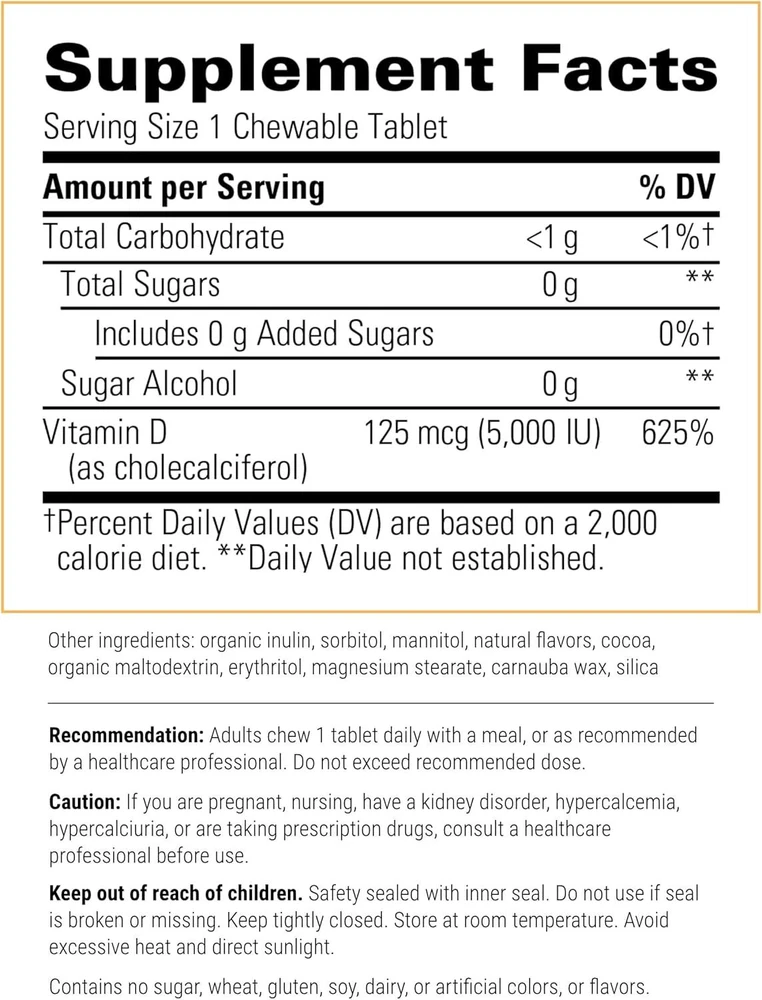 Integrative Therapeutics Vitamin D3 125 mcg - 5,000 IU – Immune Support Supplement* - Healthy Bone Support* - Gluten Free - 90 Chocolate Flavored Chewables Product Details Product Dimensions : 2.02 x 2.02 x 4.02 inches; 2.4 ounces Manufacturer : Integrative Therapeutics Brand: Integrative Therapeutics Item Form: Tablet Primary Supplement Type: Vitamin-d Diet Type: Gluten Free Flavor: Chocolate High potency vitamin D (as cholecalciferol) supports a healthy immune system.* Promotes healthy bones.* Research has shown that increased intake of cholecalciferol supports calcium absorption.* Chocolate flavored chewables are a delicious, convenient way to get your vitamin D. Gluten-free. No sugar, wheat, soy, dairy, or artificial colors or flavors. You are a force. It's not a superpower, it’s a mindset. It's how you get things done, how you rise above the outside world. It’s the commitment you make with yourself to be on top of your game and in optimal wellness. Integrative Therapeutics, supplements for your momentum to break through.