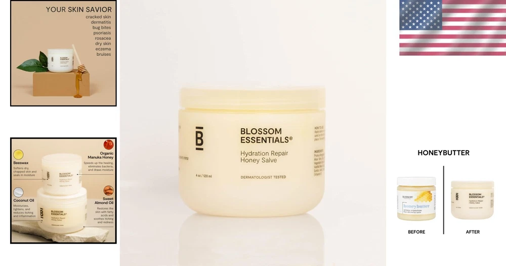Intense Hydration Honey Salve - Natural Balm for Eczema and Sensitive Skin ‹ › ‹ › ‹ › ‹ › ‹ › ‹ › ‹ › ‹ › ‹ › ‹ › ‹ › Intense Hydration Honey Salve Natural Balm for Eczema and Sensitive Skin Formerly HoneyButter Key Features: Dermatologist Approved: Our soothing balm is designed for intense hydration, providing relief from irritation, redness, and swelling. Power of Manuka Honey: Quickly nourishes dry, itchy, and cracked patches by drawing moisture to the top layer of your skin. Natural Ingredients: Made with aloe vera gel, tea tree oil, vitamins A & E, and more, free from parabens, sulfates, chemicals, and steroids. Versatile Use: Safe for all skin types; ideal for hands, feet, face, scalp, underarms, eyelids, and lips. Soothing Sensation: Experience a cooling effect from the tea tree oil while nourishing sensitive skin. Moisturizing Body Butter: Promotes new, healthy skin with continued use. Simply apply, massage, and allow it to melt into your skin. Blossom Essentials Promise: Our mission focuses on creating ultra-hydrating, chemical-free products for your well-being. Important Note: Jars are marked with a Manufacturer's Date (MFG) indicating the production month and year, not an expiration date. Why Choose Our Intense Hydration Honey Salve? Are you struggling with dry, sensitive skin or conditions like eczema that disrupt your comfort? Our Intense Hydration Honey Salve is your ultimate solution. With the rich nurturing properties of Manuka honey and complementary natural ingredients, it provides rapid relief and replenishes moisture to soothe and heal your skin. Say goodbye to irritation and embrace the love for your skin with our gentle, effective formula. Make the choice toward natural bodycare and elevate your skincare routine with the powerful benefits of our Honey Salve. Treat yourself and your family to the soothing solution you deserve today! Shipping Free & Fast Shipping - We offer free shipping to most of the USA with a normal delivery time of 3-7 days. However, due to the current situation, additional delivery time (up to 3 weeks) may be required for some items. Alternative Carriers - We may use alternative carriers (e.g. USPS, FedEx, UPS, etc.) to ensure your package arrives safely and on time. Due to the use of multiple carriers, we are unable to provide a tracking number automatically. Handling Time - Orders are processed and shipped within 1-2 business days of receiving cleared payment. Shipping Restrictions - Shipping to Alaska, Hawaii, Puerto Rico, Guam, and other US territories may incur shipping charges or delivery restrictions. Please contact us before ordering, or your order can be refunded/cancelled. State Restrictions - There may be restrictions based on your state of purchase. For example, certain items may not be shipped to California due to state regulations. Contact for Tracking Updates - If you require tracking updates or have any concerns about the delivery of your order, please feel free to contact us, and we will be happy to assist you. Return 30-Day Hassle-Free Returns - We want you to be completely satisfied with your purchase. If you are not, you can return the item within 30 days of receiving it for a full refund or exchange. Easy Return Process - To start a return, simply contact us and we will provide you with a prepaid return shipping label and detailed instructions. Restocking Fee - There are no restocking fees for returns. However, the buyer is responsible for return shipping costs if the return is not due to a seller's error. Refund Processing Time - Refunds will be processed within 5 business days of receiving the returned item in its original condition. Payment We accept all major credit cards, PayPal, and Apple Pay for your convenience. Your payment information is secure and encrypted to ensure a safe and seamless transaction. Please complete your payment within 3 days of purchase to avoid any delays in shipping. Feedback Your feedback is extremely important to us. We strive to provide the best products and customer service possible. If you are satisfied with your purchase, please take a moment to leave us a positive review. If you have any concerns or issues with your order, please contact us before leaving negative feedback. We are committed to resolving any problems and ensuring your satisfaction. Contact Us If you have any questions or concerns, please feel free to reach out to our customer support team. You can contact us through the eBay messaging system. We are available Monday to Friday, 9:00 am to 5:00 pm EST, and we will do our best to respond to your inquiry within 24 hours. Buy it now and enjoy a pleasant shopping experience! UPC: Not Set Expiration Date: Not Set Unit Quantity: 1 Body Area: Face,Feet,Full Body,Lips,Hands,Scalp,Underarms,Eyelids Ingredients: Aloe Vera,Tea Tree Oil,Manuka Honey,Vitamins A,Vitamins E Main Purpose: Eczema,Psoriasis,Hydration Repair Features: Hydrating,Paraben-Free,Sulfate-Free,Moisturizing,Nourishing,Soothing,Chemical-Free,Steroid-Free Active Ingredients: Aloe Vera,Manuka Honey,Tea Tree Oil,Vitamins A,Vitamins E Formulation: Butter Scent: Coconut Set Includes: Daily Use Brand: Unbranded Type: Daily Use Size: 4 ounce Product Line: Not Set Color: Multicolor Sun Protection Factor (SPF): Not Set Volume: 4 ounces UVA Protection: Not Set MPN: Not Set Period After Opening (PAO): Not Set Department: Unisex Skin Type: Sensitive Country/Region of Manufacture: Not Set Unit Type: oz