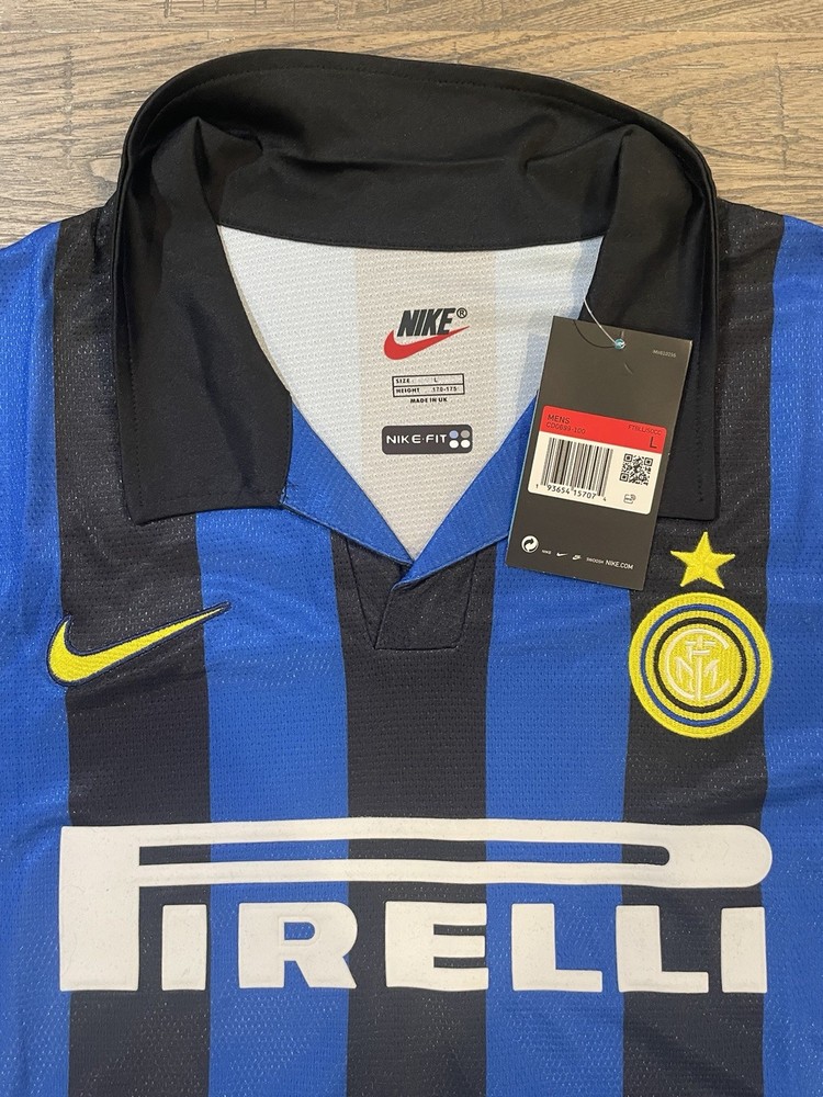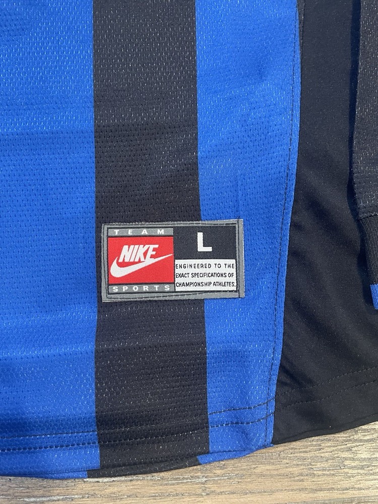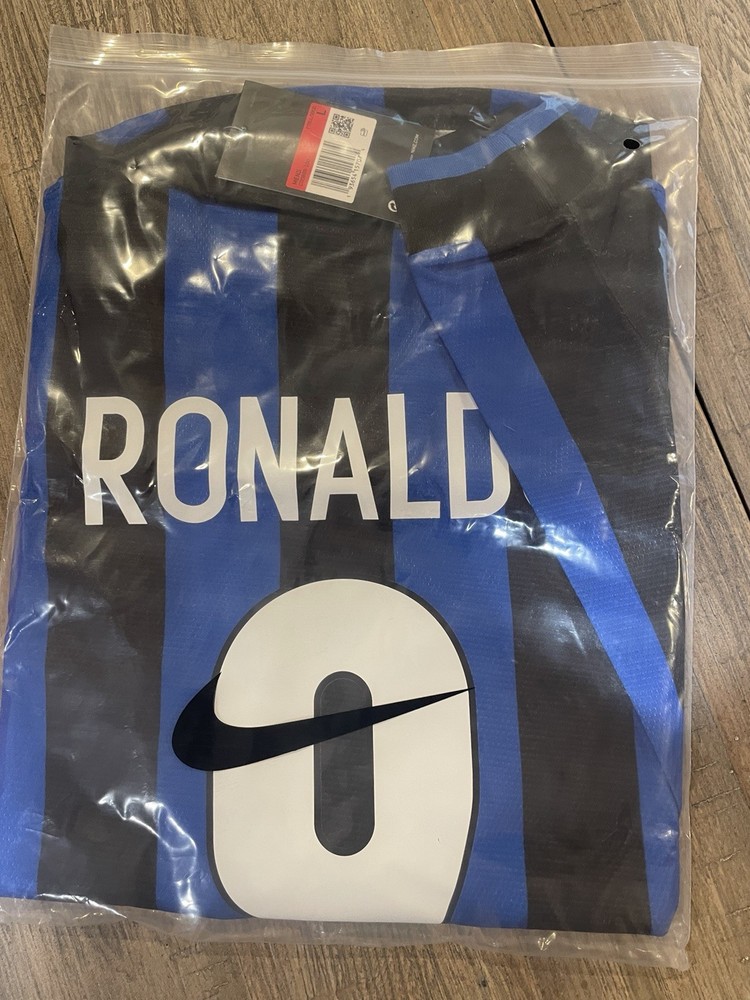 The product is a retro Inter Milan 98 jersey featuring Cristiano Ronaldo's iconic #9, designed by Nike and officially licensed for soccer fans. This long sleeve jersey in size L is in the signature blue color of the team, perfect for male fans looking to show their support for Inter Milan in the Champions League. Made in the United Kingdom, this sports memorabilia item is a must-have for any passionate soccer collector.