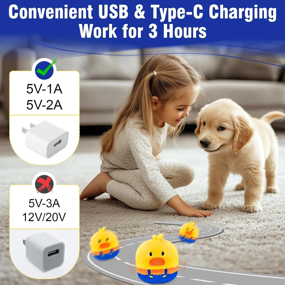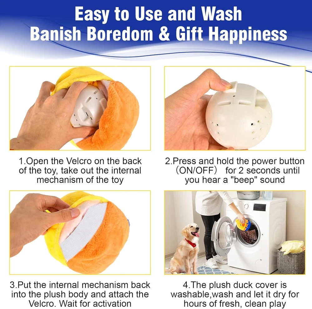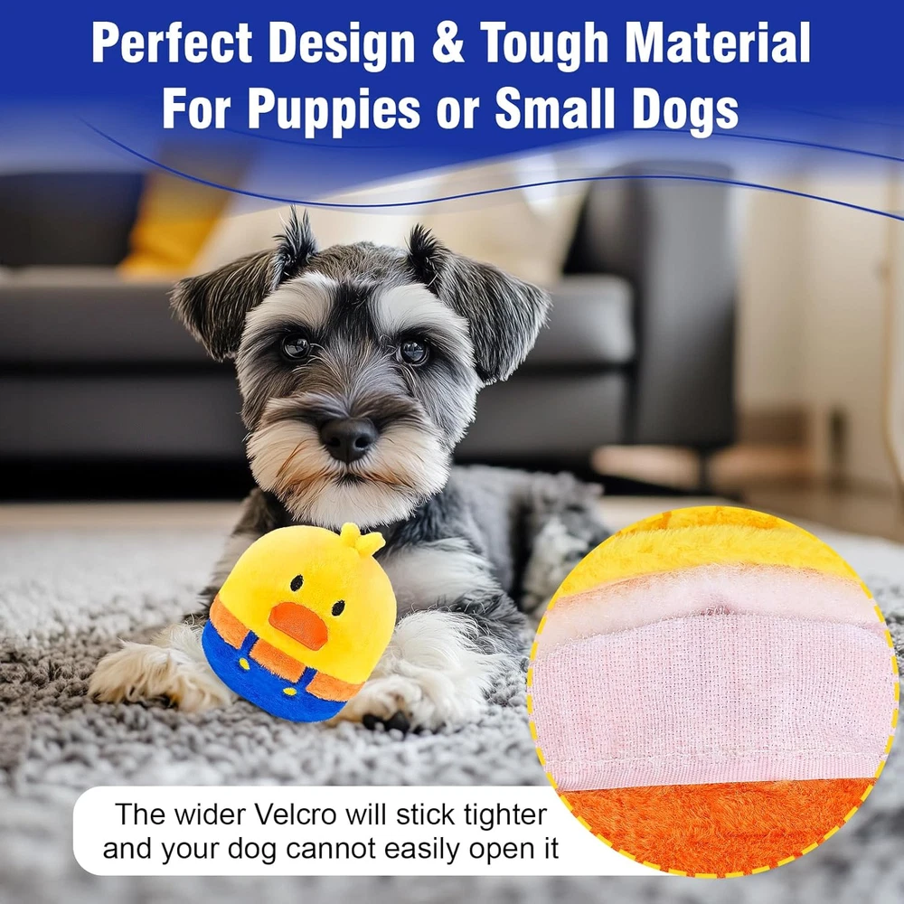 【Automatic Interactive Puppy Toys to Keep Them Busy】 Looking for ways to keep your furry friend occupied? Our active bouncing dog toy is specially curated to provide physical activity for small dogs, especially puppies. This motion activated toy for dogs is designed to challenge your dog's mind and keep them entertained, helping to alleviate boredom, anxiety and prevent destructive behavior. Say goodbye to restless pups and hello to hours of engaging playtime with our selection of busy toys for dogs. 【Rechargeable】 Say goodbye to the hassle of battery replacement. Our updated USB Type-C charging design allows for easy charging when this electric moving dog ball runs out of battery. *Please choose 5V/1A or 5V/2A adapter*. With a 500mAh battery capacity, just one hour of charging provides three hours of continuous dog playtime. By taking off the plush crinkle duck's cover and fully charging the dog ball, it will keep your dogs fun going without interruption. 【Motion Activated Dog Toy】Featuring a built-in motion & recording sensor, our automatic dog toy offers interactive fun for your furry friend. Simply press and hold the switch for 2 seconds to activate the vibrating ball, then, either you speak to it or your dog barks at it, it will automatically vibrate and repeat the sound. When the sound ceases, the vibration stops. However, if a new sound emerges, it will resume vibrating, bringing endless excitement and joy. Anyway, this interactive jumping ball for dog can attract more attention and bring more joy to your dogs. 【Easy to Use and Wash】 Our squeaky dog toy is designed for convenience. By pressing and holding the switch for 2 seconds, you can easily turn the moving dog toy on or off, making it effortless for dog owners to entertain their pets. Plus, the plush duck cover is washable, ensuring easy maintenance. Simply open the plush cover's Velcro fastener, take out the bounce ball, wash and let it dry for hours of fresh, clean play. 【Banish Boredom, Not for Aggressive Chewers】Say goodbye to boredom and hello to endless entertainment with our innovation of interactive puppy toys for small dogs. This cute duck cover electronic dog toy is designed to stimulate your dog's mind and provide hours of engaging play. Whether your pup prefers solo play or interactive sessions with their favorite human, these active moving dog toy is sure to banish boredom and keep tails wagging and busy. Product Description Interactive Puppy Toy to Keep Them Busy, The Best Canine Companion For Your Dog! Press the Switch and Hold it for 2 seconds, Then Speak or Bark at This Toy! Our updated USB charging design allows for easy charging when this electric moving ball runs out of battery. Please choose 5V/1A or 5V/2A adapter Please remember, press the switch and hold it for 2 seconds to activate this dog toy, then speak or bark at it, this ball will vibrate. Much Safer with Our Velcro Design! How to Start and Play with Our Cute and Crazy Dog Toy? - Remember to press the switch and hold it for two seconds when you want to activate this built-in ball - Next, you can speak to this ball or pat the ball to trigger the repeat sensor in the ball - Our Velcro design is MUCH safer for dogs, it does not have the risk of being eaten by dogs like other zipper designs The video showcases the product in use. The video guides you through product setup. The video compares multiple products. The video shows the product being unpacked. Attract More Attention and Bring More Joy to Your Babies! Whether your pup prefers solo play or interactive sessions with their favorite human, these active moving dog toy is sure to banish boredom and keep tails wagging and busy. Keep Your Puppies Occupied! VYsTN Electronic Interactive Puppy Toys to Keep Them Busy for Hours! Looking for ways to keep your furry friend occupied? Our active bouncing puppy toy is specially curated to provide mental stimulation and physical activity for dogs of all ages and sizes. Featuring a built-in motion & recording sensor, our automatic dog toy offers interactive fun for your furry friend. Attractive Idea for Dog Birthdays, Special Holidays Such As Christmas, etc.