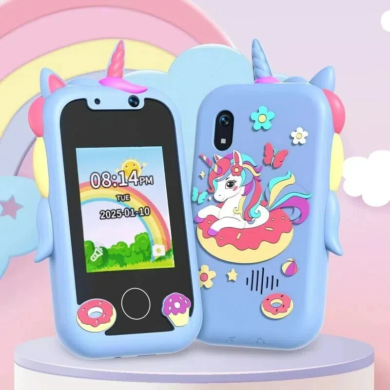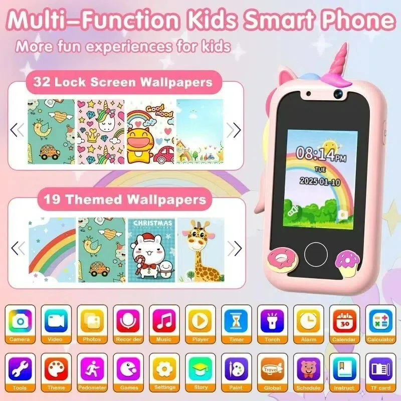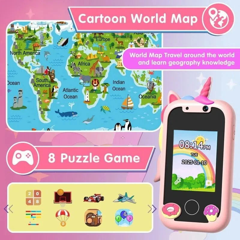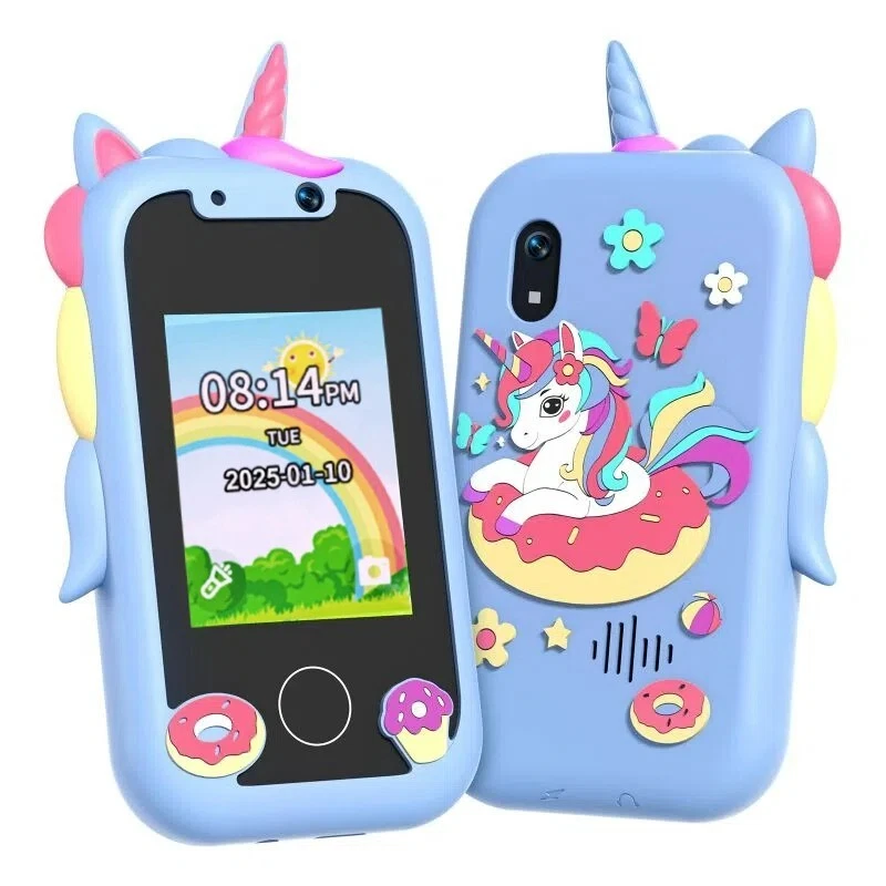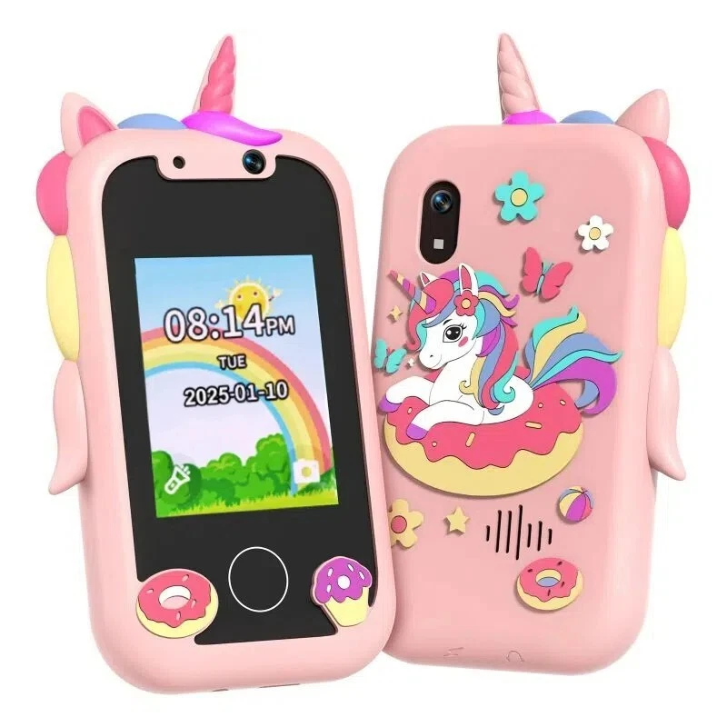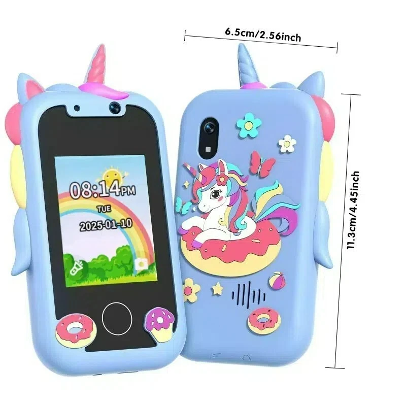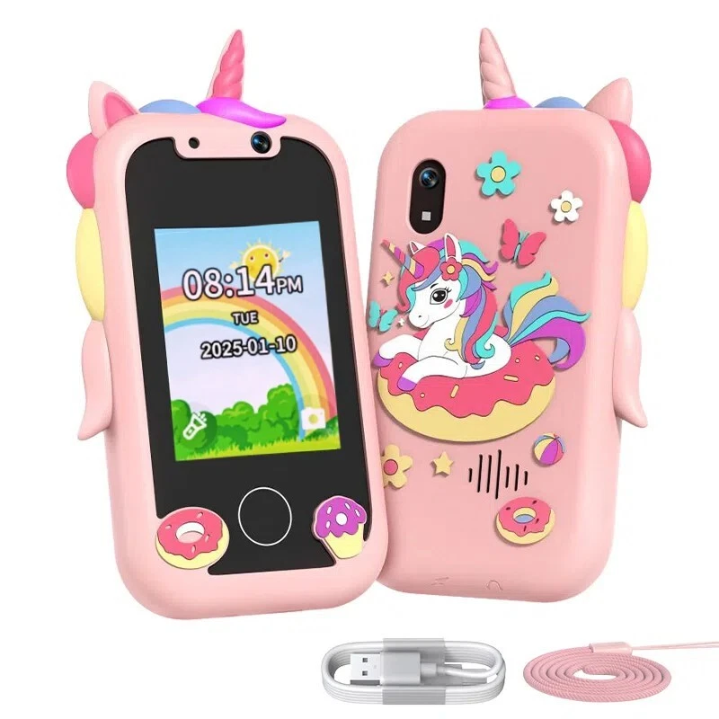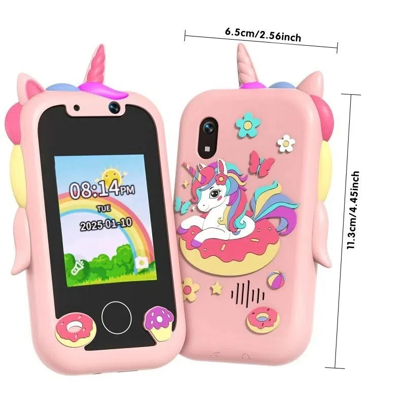Specifications: [ Multifunctional Kids Smart Phone ] - 2.4" Touchscreen kids phone rich features, easy to use. Wide range of entertainment and learning options, such as 8 puzzle games, music, etc, and equipped with useful gadgets that children need, such as recorder, calculator, calendar, alarm clock, torch, countdown timer, stopwatch, etc. Kids toy cell phones, all in entertainment and learning, are designed for kids aged 3-10years old. [ Joy and Relaxation Time ] - Kids toys phone has 8 fun puzzle games, it can help children relax and release stress, exercising their logical thinking, reaction skills, and hand-eye coordination. Graffiti painting function can let children give full play to their imagination and creativity. Kids smartphone built-in 5 fun stories, high-quality MP3 music player, make child enjoy music on the go. [ Dual Camera Recording Good Times ] - kids smartphones support dual cameras to take pictures and video recording, just like a real smartphone, and quickly switch between front and rear, easy selfies. With 18 cute stickers. Kids choose their favorite stickers to take photos and record the beautiful moments and interesting experiences in their lives with family or friends. To prevent the loss, kids phone for girls boys comes with a durable lanyard for easy carrying. [ Great Gifts for Girls Boys ] - Kids play phones, the touch screen is sensitive, and han 32 styles of wallpaper and 19 desktop background wallpapers to choose from. Comes with a cute pattern design silicone phone case, it can be drop-proof and more durable. Small and exquisite phone, easy to carry, with a 800mAh battery, it offers more usage time. This fake phone is a popular kids toy for girls boys age 3-10, the great surprise Christmas birthday travel gift for kids. Specifications: Material: ABS+PC Memory: 512MB Display: 2. 4 inch touch screen Interface Charging port: TYPE-C Battery Capacity: 8 00mA Time: year, month, 24 hours