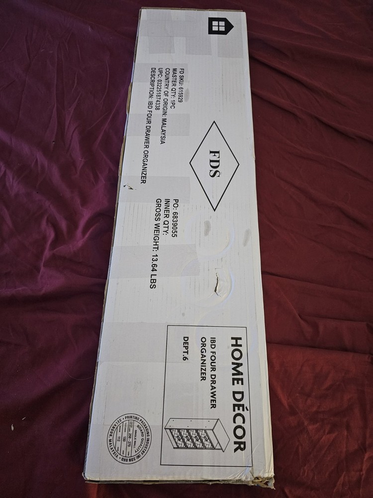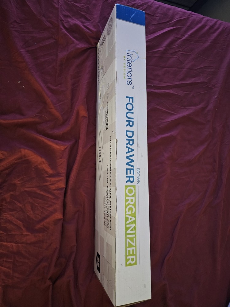 New in factory sealed box . The Interiors by Design Four Drawer Organizer is a medium-sized, rectangular storage box made of wood in a brown color. It features a camlock construction for easy assembly and has multiple compartments for organizing items. With dimensions of 33 inches in length and more than 24 inches in height and width, this free-standing drawer box is a stylish and functional addition to any home. Assembly is required, but the end result is a sturdy and practical storage solution for keeping items neat and tidy.