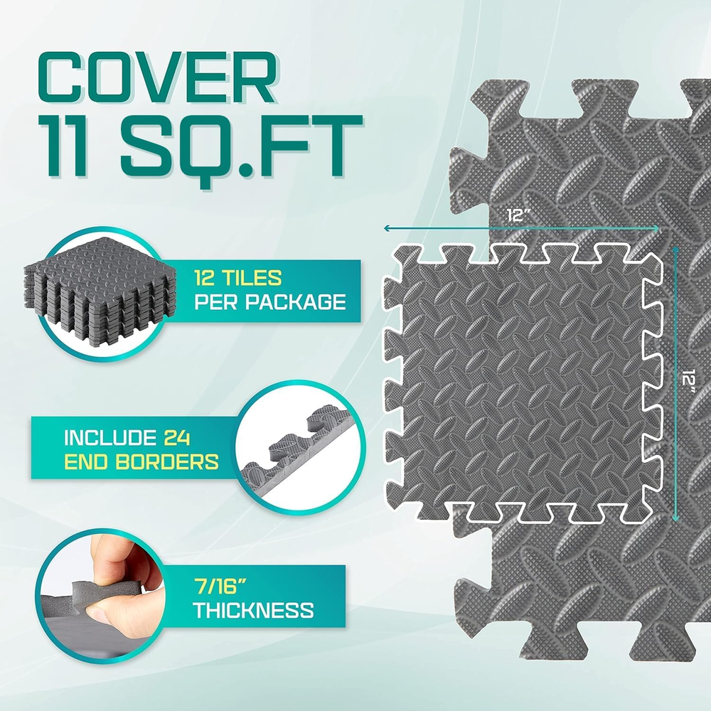 EVA Interlocking Mats, Puzzle Floor Tiles, Foam Floor Padding with Border for Furniture, Home Space, Living Room, Garage 11,15,32,99 SQFT Sport Type: Sporting Goods COVER 12 SQ. FT: Include 12 tiles. Each tile measures 12 inch L x 12 inch W x 7/16 inch thick – thick from the highest point of the texture DURABLE & NON SLIP: Non-skid textured and shock- absorbing surface provides a soft feeling when exercise on, best for comfortable workout area – a combination of high density EVA foam mat & exercise mat for excellent support and cushion. EASY TO CLEAN: The water-resistant & noise-reducing design is easy to clean. The moisture-resistant technology & high-quality material make the mat easy to wash with soap & water EASY 5 MINUTE ASSEMBLY: Lightweight puzzle pieces can be connected and disassembled easily in less than 5 minutes. Great for home gym, fitness gym, garages coverage or play areas PROTECTIVE WORKOUT FLOORING: Give yourself shock-absorbing comfort when doing Yoga, Pilates, or weightlifting! Yes4All Interlocking Mats can also be used to create a soft & anti-slip floor while camping or playing Product Description The video showcases the product in use. The video guides you through product setup. The video compares multiple products. The video shows the product being unpacked. 1 EASY TO ASSEMBLE 2 VARIOUS COLORS & SIZES 3 MULTIFUNTIONAL USE YES4ALL INTERLOCKING MATS OFFERS Add to Cart Add to Cart Add to Cart Add to Cart Add to Cart Add to Cart Add to Cart Customer Reviews 4.2 out of 5 stars 25 4.3 out of 5 stars 8,104 4.6 out of 5 stars 4,560 4.6 out of 5 stars 4,560 4.6 out of 5 stars 4,560 3.9 out of 5 stars 2,969 4.3 out of 5 stars 1,893 Price $36.15 $ 36 . 15 $54.64 $ 54 . 64 $75.26 $ 75 . 26 $100.14 $ 100 . 14 $128.26 $ 128 . 26 $44.04 $ 44 . 04 $47.29 $ 47 . 29 Size 12”L x 12”W x 3/4”H 12”L x 12”W x 7/16”H 24”L x 24”W x 1”H 24”L x 24”W x 3/4”H 24”L x 24”W x 7/16”H 12”L x 12”W x 7/16”H 24”L x 24”W x 7/16”H Color Black, Gray Black, Gray Black Black, Gray Black Wood Grain Wood Grain, Slate, Carbon Tiles 12 36 6 12 30 24 12 Material High-density EVA Foam High-density EVA Foam High-density EVA Foam High-density EVA Foam High-density EVA Foam High-density EVA Foam High-density EVA Foam Easy to Assemble ✔ ✔ ✔ ✔ ✔ ✔ ✔ Easy to Clean ✔ ✔ ✔ ✔ ✔ ✔ ✔ YES4ALL HEAVY DUTY RUBBER TOP & RUBBER OFFERS Add to Cart Add to Cart Add to Cart Add to Cart Customer Reviews 5.0 out of 5 stars 2 5.0 out of 5 stars 1 3.8 out of 5 stars 14 3.1 out of 5 stars 14 Price $42.41 $ 42 . 41 $73.86 $ 73 . 86 $186.89 $ 186 . 89 $106.09 $ 106 . 09 Tiles 6 12 6 8 Material Rubber & EVA Foam Rubber & EVA Foam High-density Rubber High-density Rubber Size 24"L x 24"W x 0.56"H 24"L x 24"W x 0.56"H 24"L x 24"W x 3/8H" 20"L x 20"W x 3/8H" Easy to Assemble ✔ ✔ ✔ ✔ Water-resistant ✔ ✔ ✔ ✔ Item model number 8YCR Item Thickness 0.44 Inches Warranty Description 30 days return & 1 year warranty. Number of Items 1 Assembly required No Water resistant Waterproof Color Grey Pattern Solid Country of Origin USA Style 7/16" Thick, 12SQFT Material Ethylene Vinyl Acetate (EVA) Shape Square Item Weight 2.09 pounds Batteries required No Department Exercise & Fitness Import Imported Is Discontinued By Manufacturer No Special Feature Waterproof, Durable Product Dimensions 12"L x 12"W x 0.44"Th Material Type Free Other Materials Free 13.35 inches x 13.82 inches x 5.71 inches. Weight: 2.09 lb Shipping from the USA All of our products are shipped from the USA, ensuring quick delivery to your destination. Payment We offer the following payment methods: PayPal, credit card, bank transfer, and eBay's secure payment system. Free Shipping & Free Returns Shipping within the USA is FREE. Additionally, any return is absolutely free for you. Risk-Free Purchase You have the option to return an item within 30 days without any justification. We cover the return shipping costs! Fast Shipping We ship immediately upon receipt of payment. Generally, the package is delivered within 2-3 days in the USA. If it takes longer, we will contact you. Quality and Costs Made in Europe, USA, China No customs fees or additional charges Total satisfaction guarantee Invoice with declared VAT available upon request in .pdf format Feedback Your feedback is very important to us. After you pay for your purchase, you will automatically receive positive feedback from us.