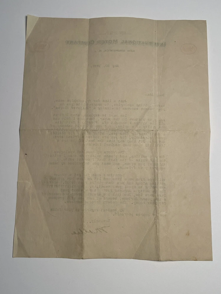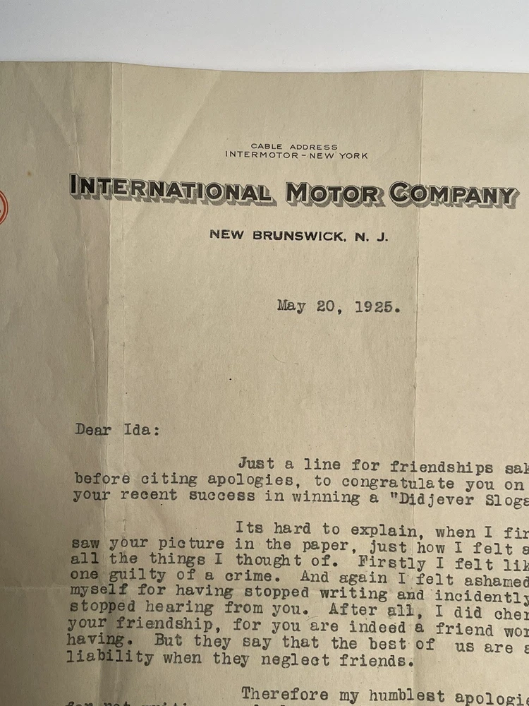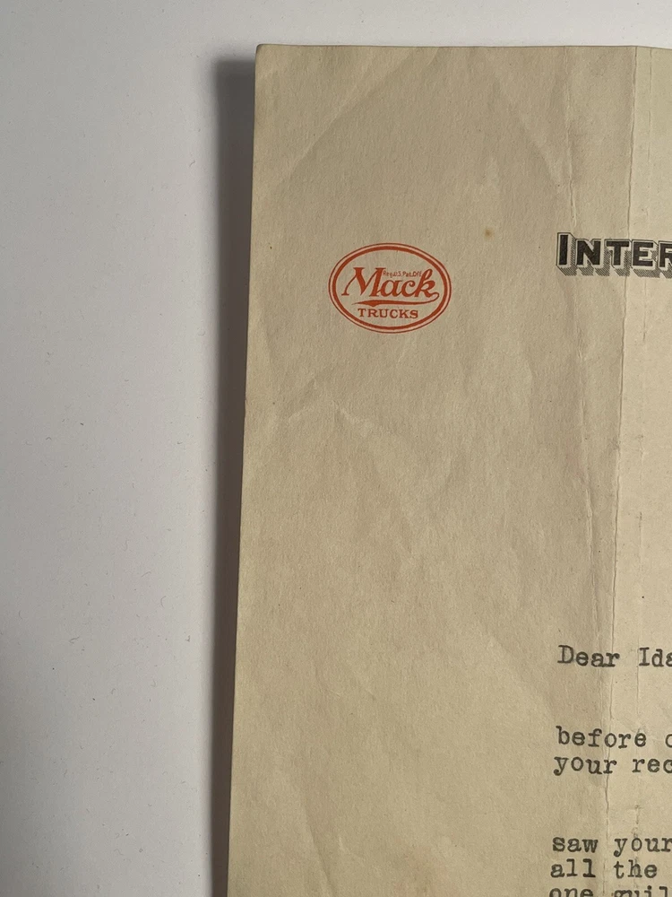 The product is a vintage letterhead from the International Motor Co. in the United States. The letterhead features Mack Trucks and is from the year 1925. Appears to be a personal letter between friends. Very good shape