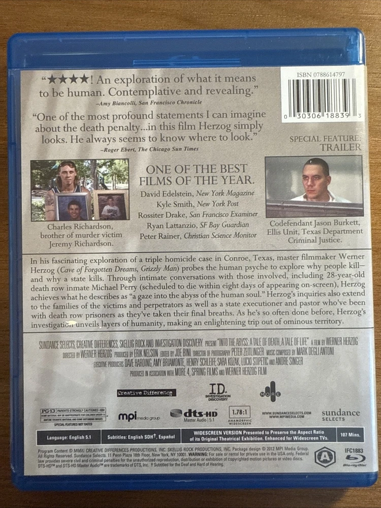 Director: Werner Herzog Genre: Documentary Producer: Erik Nelson Run Time: 107 min. Language: English Aspect Ratio: 1.78:1 UPC: 0030306188393 Studio: Ifc Independent Film Rating: PG-13 Movie/TV Title: Into the Abyss gtin13: 0030306188393 Release Year: 2011 Format: Blu-ray