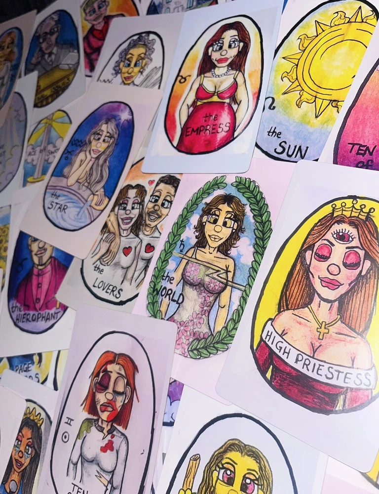 Intuitive Kev’s Tarot deck. Intuitive Kev’s Tarot Deck is a 100 card deck which includes the 78 traditional Tarot cards(Major/Minor arcana) and 22 Additional cards(Oracle), all illustrated by me (Kevin Thomas Jr) from 2022-2024. The creation of this deck was initially a hobby, that aided in transmuting negative energies early in my journey. Each card(and the box)is hand drawn and colored. Aside from the Gold gilding, I’ve added no fancy embellishments. These are exact copies of the original drawings; Flawed and Imperfect. Authentic and Original. And Im happy to share them with you 🙏❤️ -Kev