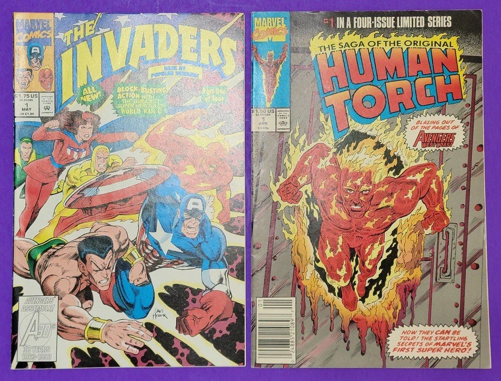 Invaders Issue 1 & The Saga Of The Original Human Torch 1 Vintage Marvel Comics. 1990, 1993, Marvel Comics Group. TAGS: comic books Comics Silver Age Golden Age Limited Edition rare scarce independent indy small Press Valiant DC Marvel Image Sirius cover collectible collector Collection series mini series movies Adaptation tie in animation animated cartoon tv television Series shows human torch invaders