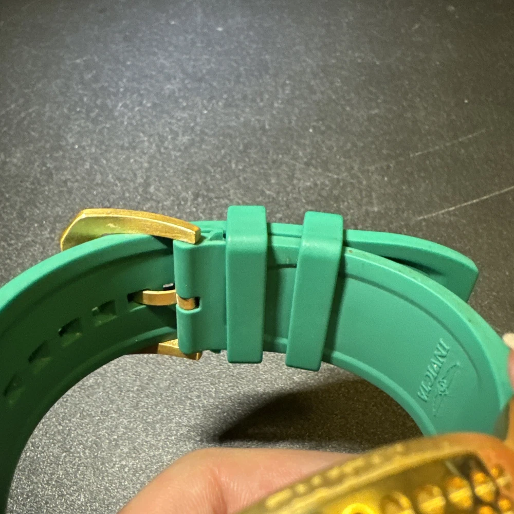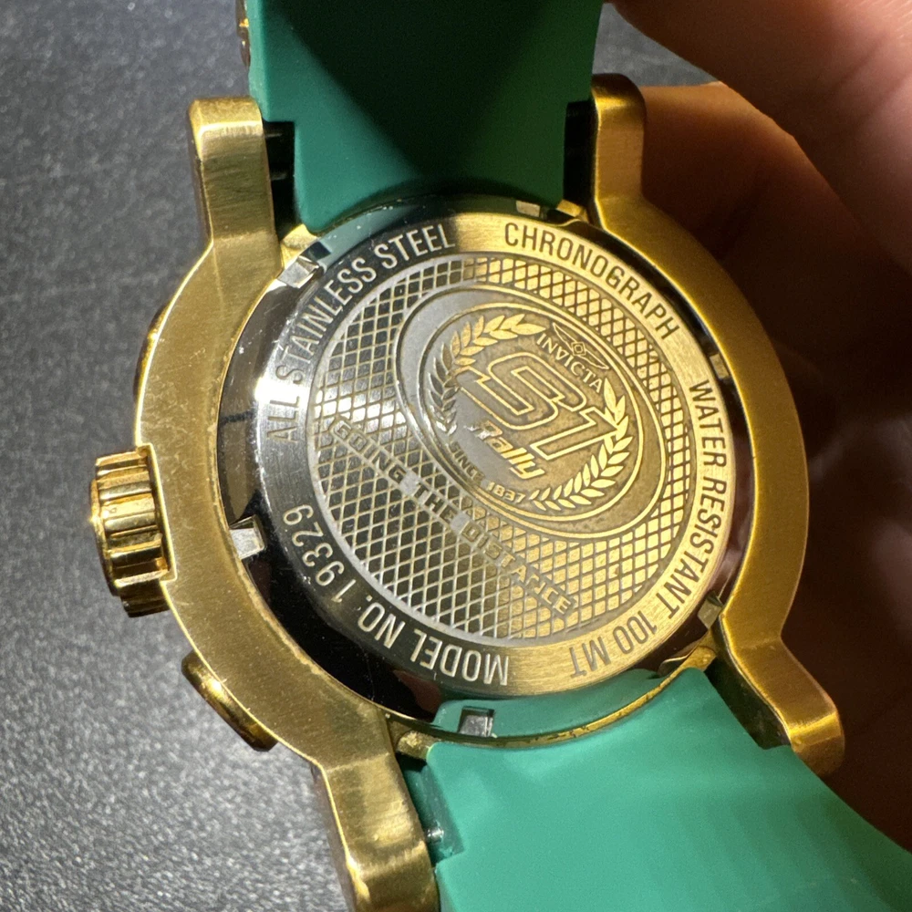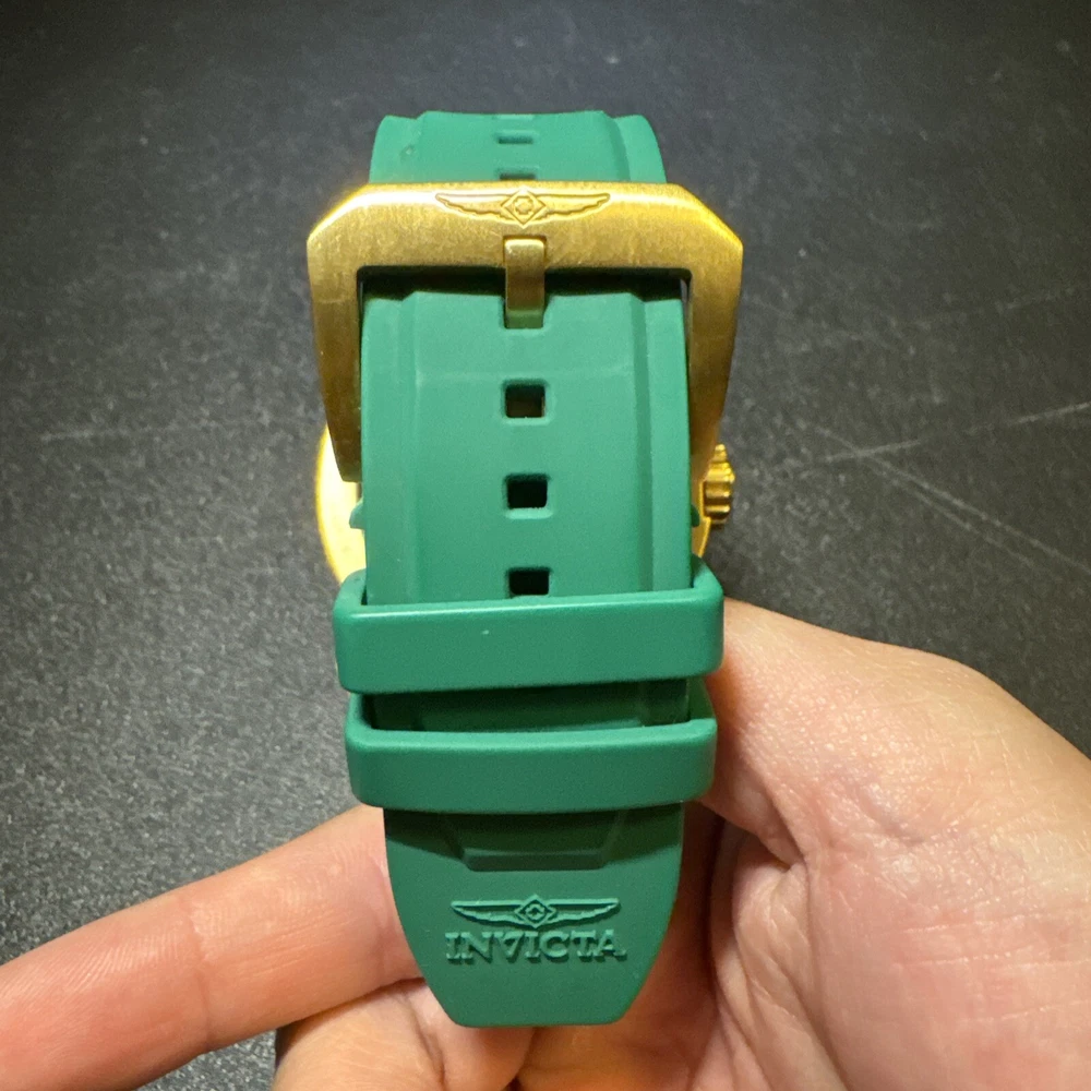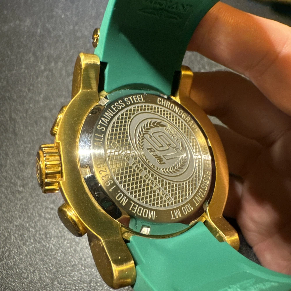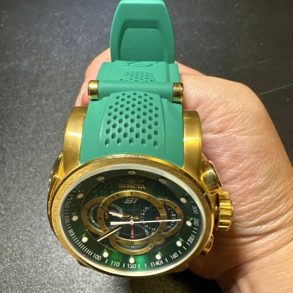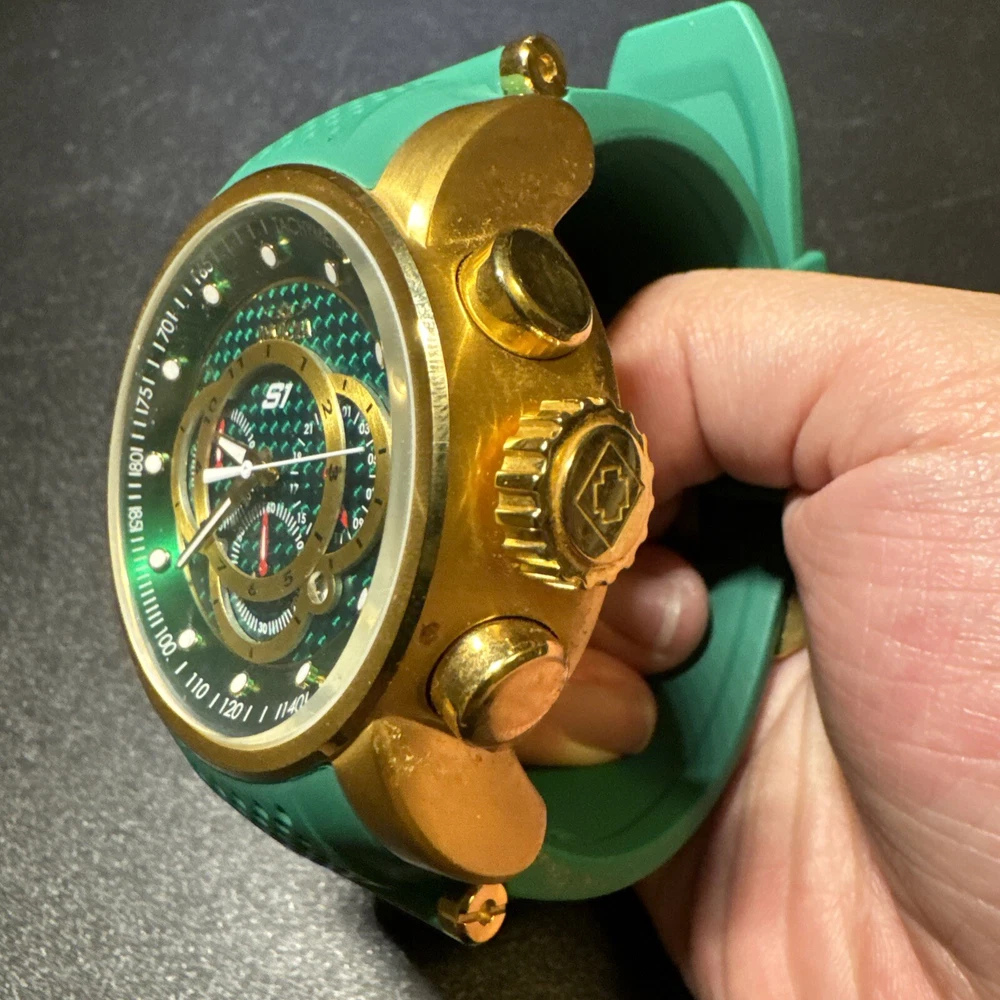 Introducing the Invicta 19329 Men's Watch, a luxurious timepiece with a 52mm polished stainless steel case and a green dial. This watch features a quartz movement, water resistance up to 100m, and a chronograph function. The bezel is gold in color and the band is made of both stainless steel and silicone materials. This watch is perfect for any occasion, whether it's a formal event or a casual day out. It comes with a date indicator and scratch-resistant mineral crystal. The lug width is 26mm and the band is strap-style. This modern watch is a great addition to any collection. Personal used condition in collection. Not currently running. NEEDS NEW BATTERIES! Bought couple years back and it's been in storage. No box. Just the watch itself with the band. Very good pristine condition. Currently sold out at retail value on official site: $289.00 very rare to find. offers welcome.