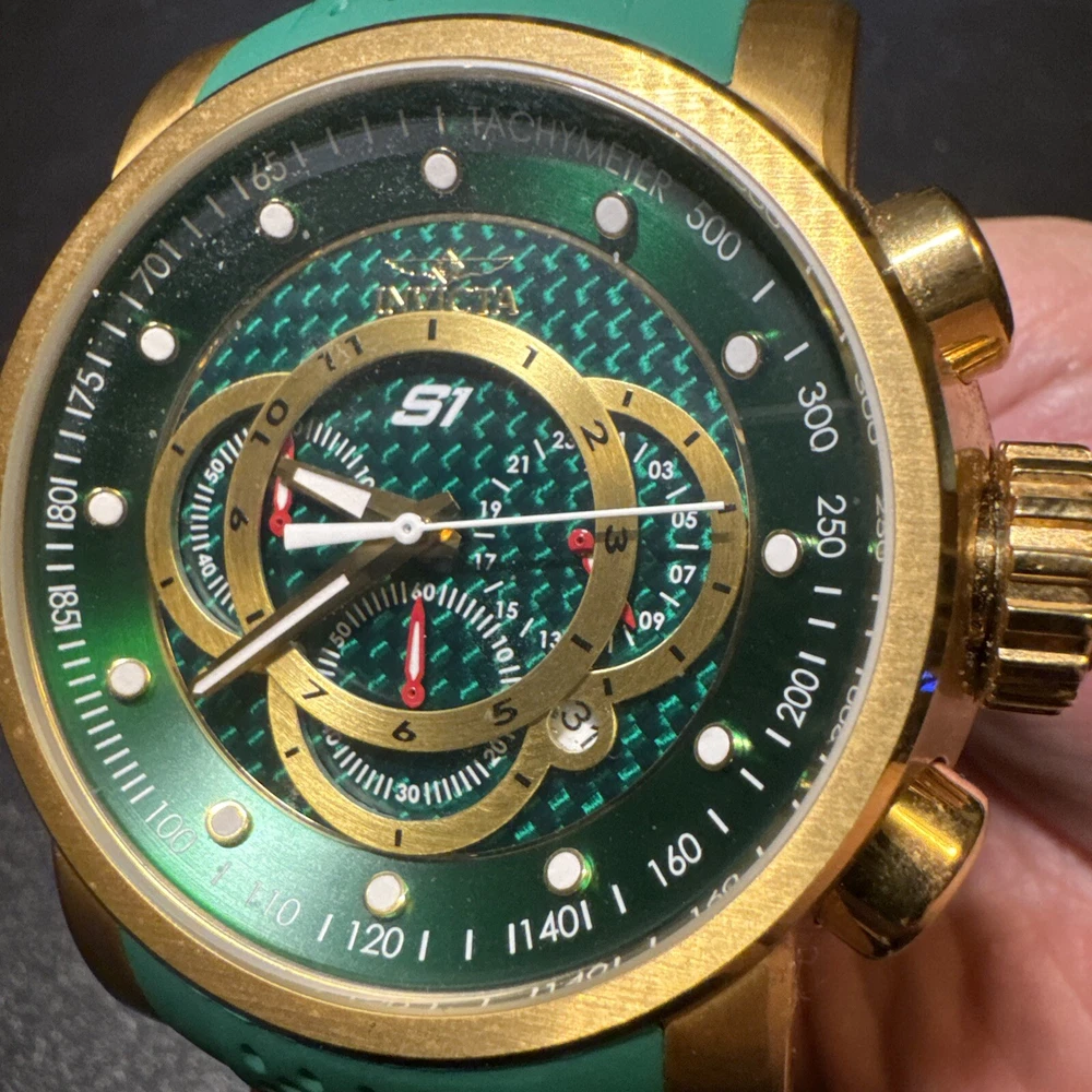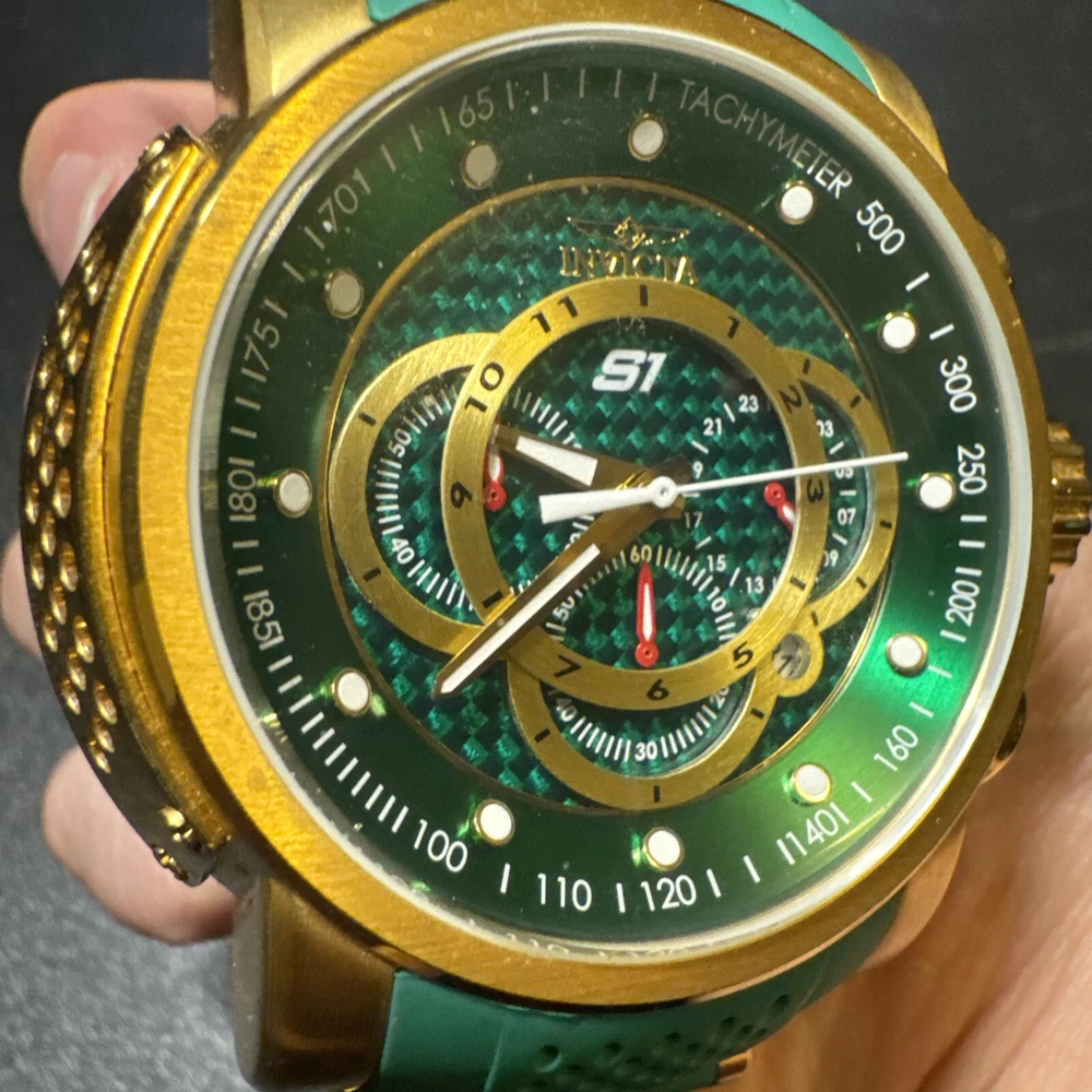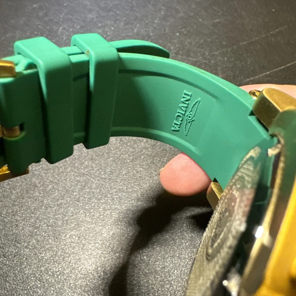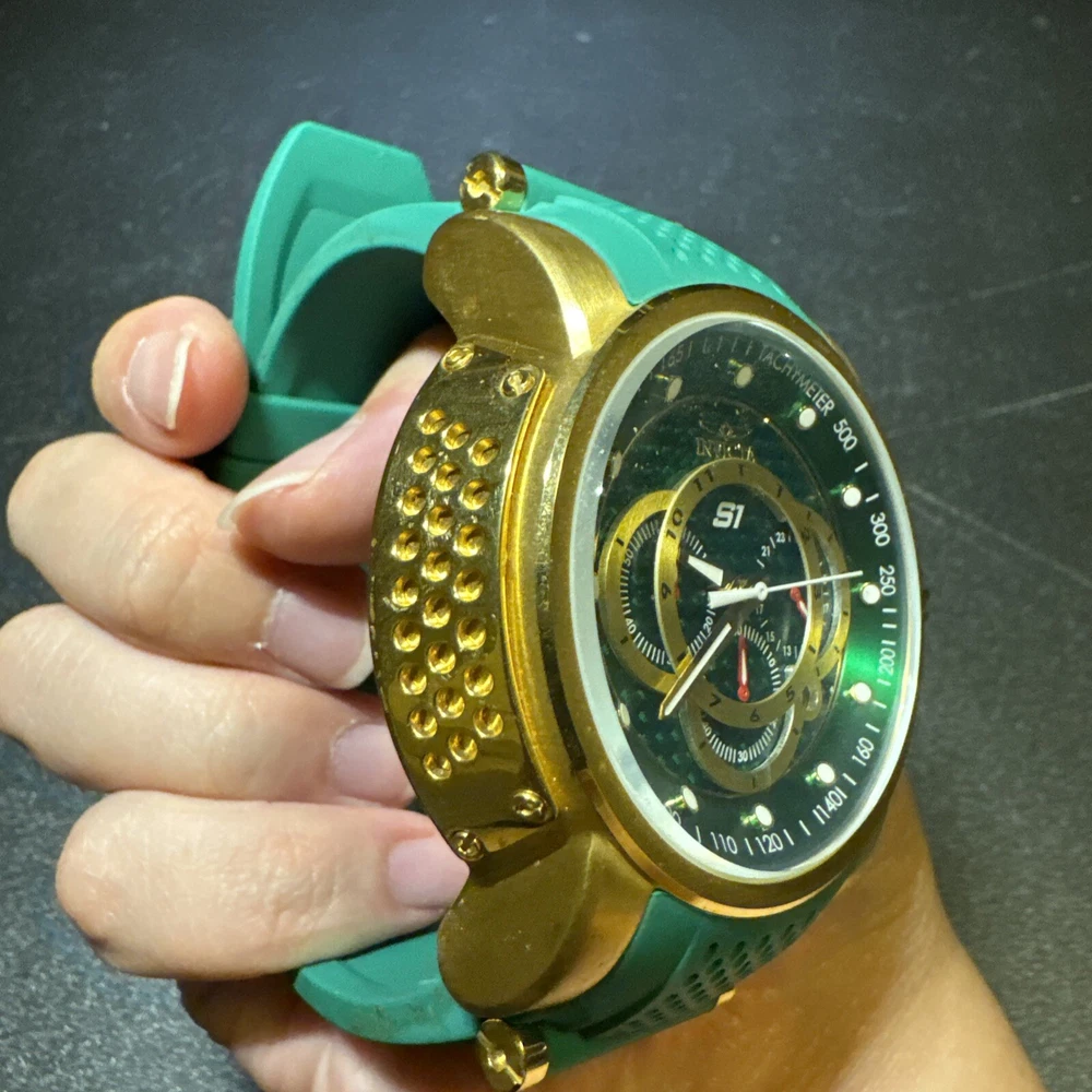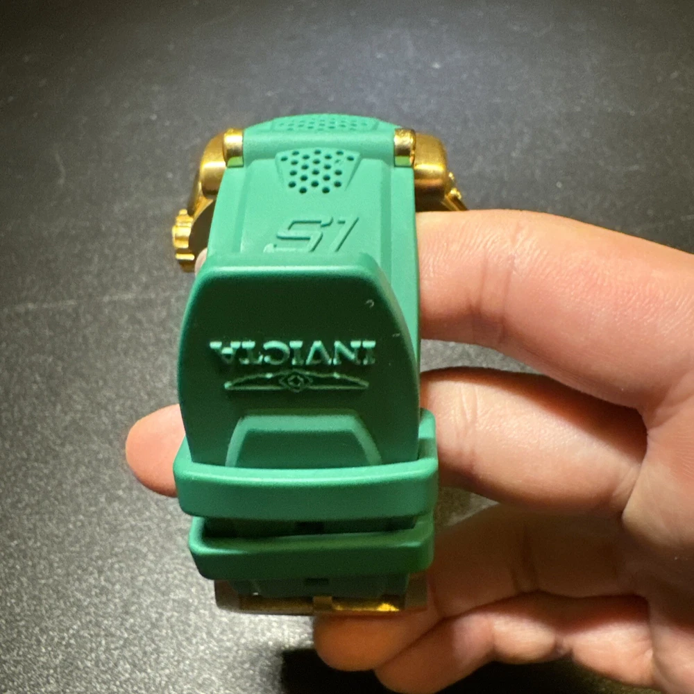 Introducing the Invicta 19329 Men's Watch, a luxurious timepiece with a 52mm polished stainless steel case and a green dial. This watch features a quartz movement, water resistance up to 100m, and a chronograph function. The bezel is gold in color and the band is made of both stainless steel and silicone materials. This watch is perfect for any occasion, whether it's a formal event or a casual day out. It comes with a date indicator and scratch-resistant mineral crystal. The lug width is 26mm and the band is strap-style. This modern watch is a great addition to any collection. Personal used condition in collection. Not currently running. NEEDS NEW BATTERIES! Bought couple years back and it's been in storage. No box. Just the watch itself with the band. Very good pristine condition. Currently sold out at retail value on official site: $289.00 very rare to find. offers welcome.