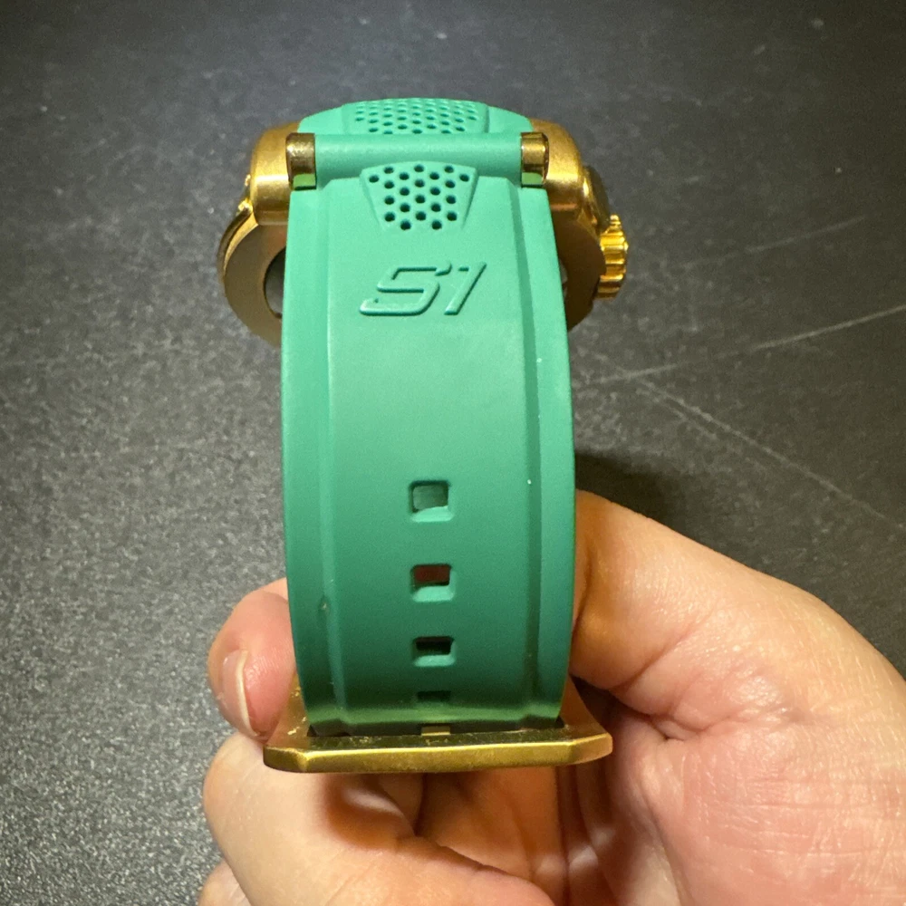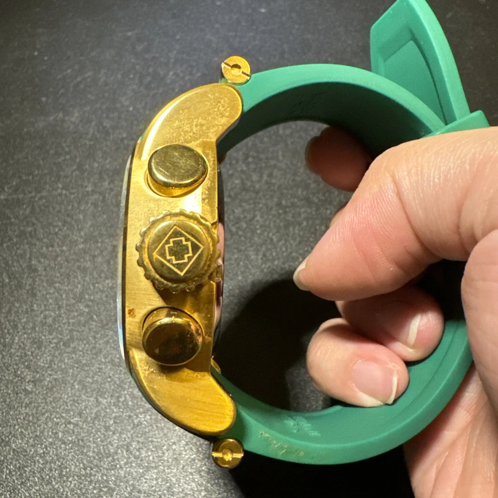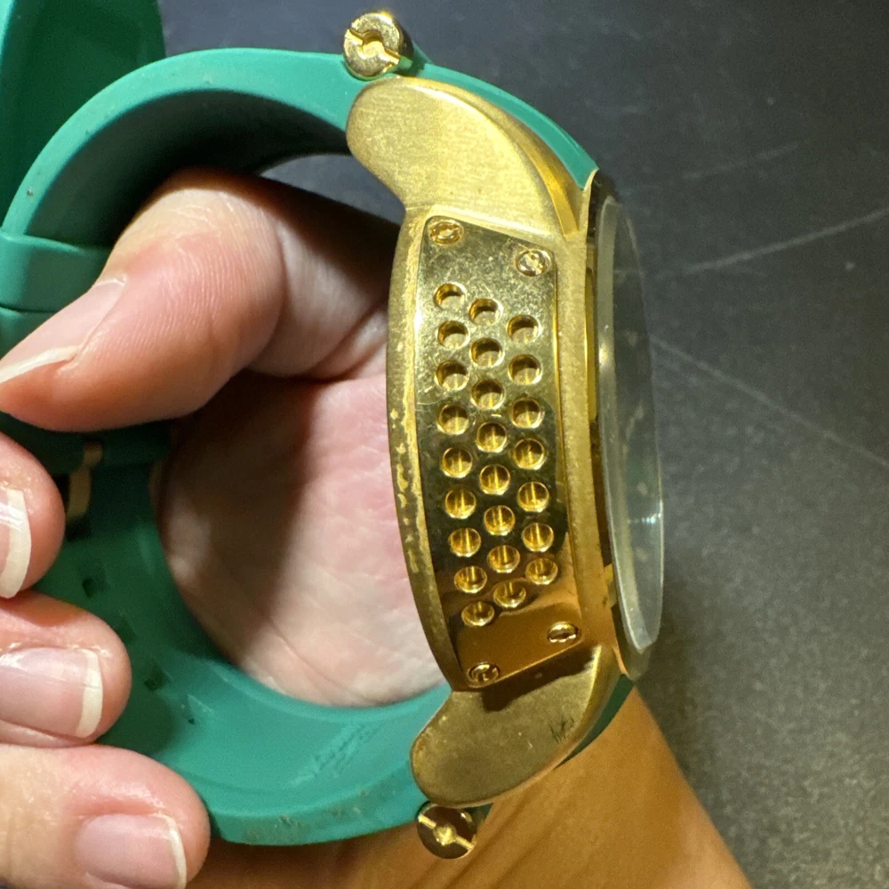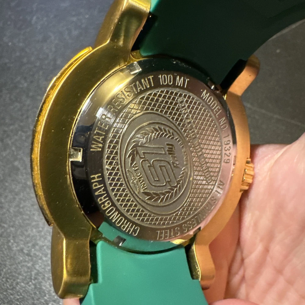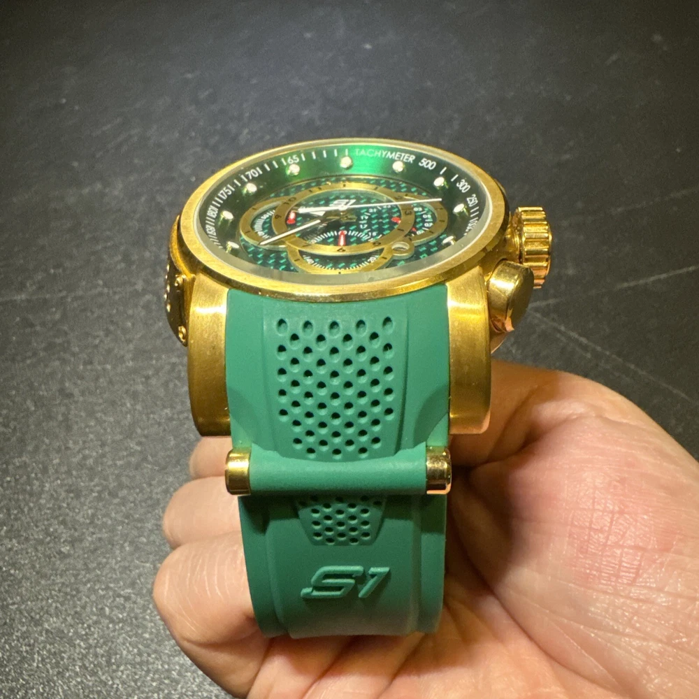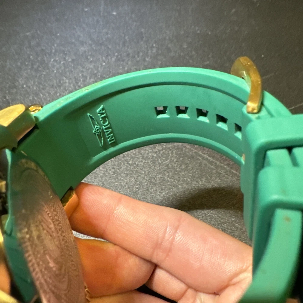 Introducing the Invicta 19329 Men's Watch, a luxurious timepiece with a 52mm polished stainless steel case and a green dial. This watch features a quartz movement, water resistance up to 100m, and a chronograph function. The bezel is gold in color and the band is made of both stainless steel and silicone materials. This watch is perfect for any occasion, whether it's a formal event or a casual day out. It comes with a date indicator and scratch-resistant mineral crystal. The lug width is 26mm and the band is strap-style. This modern watch is a great addition to any collection. Personal used condition in collection. Not currently running. NEEDS NEW BATTERIES! Bought couple years back and it's been in storage. No box. Just the watch itself with the band. Very good pristine condition. Currently sold out at retail value on official site: $289.00 very rare to find. offers welcome.