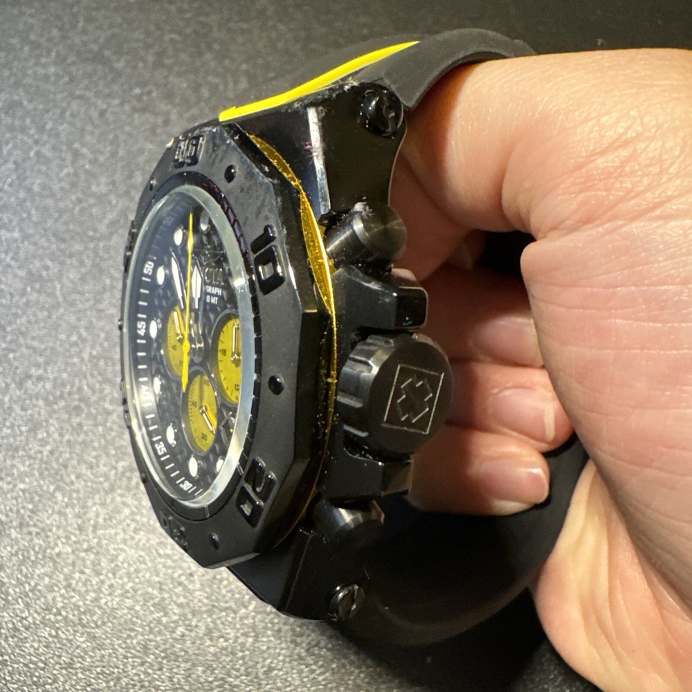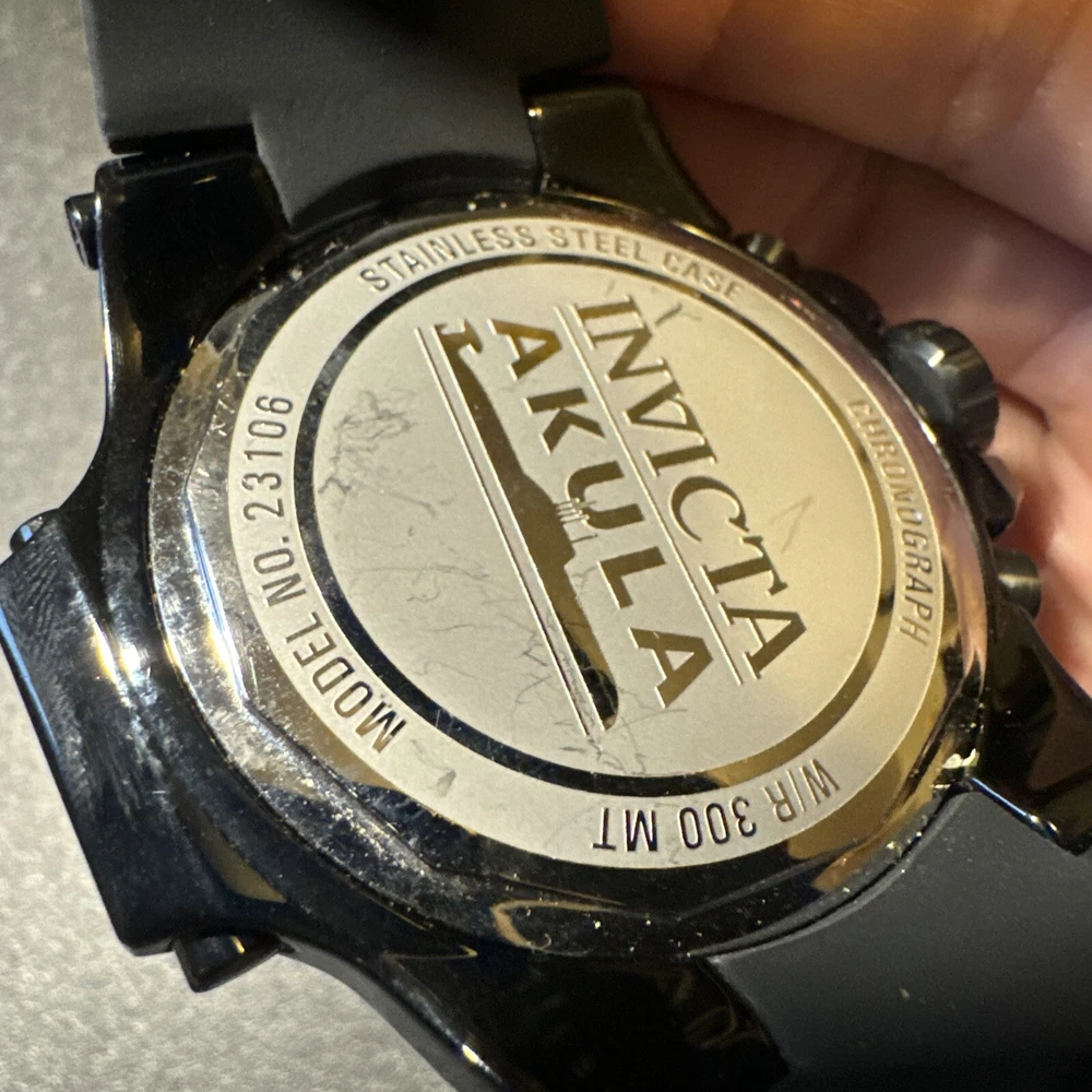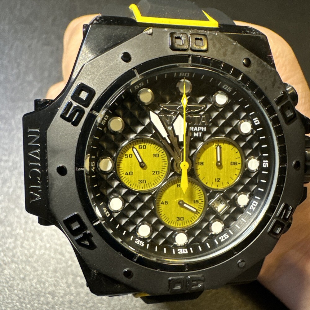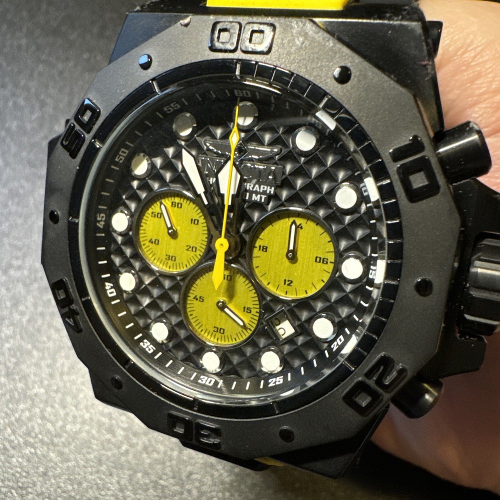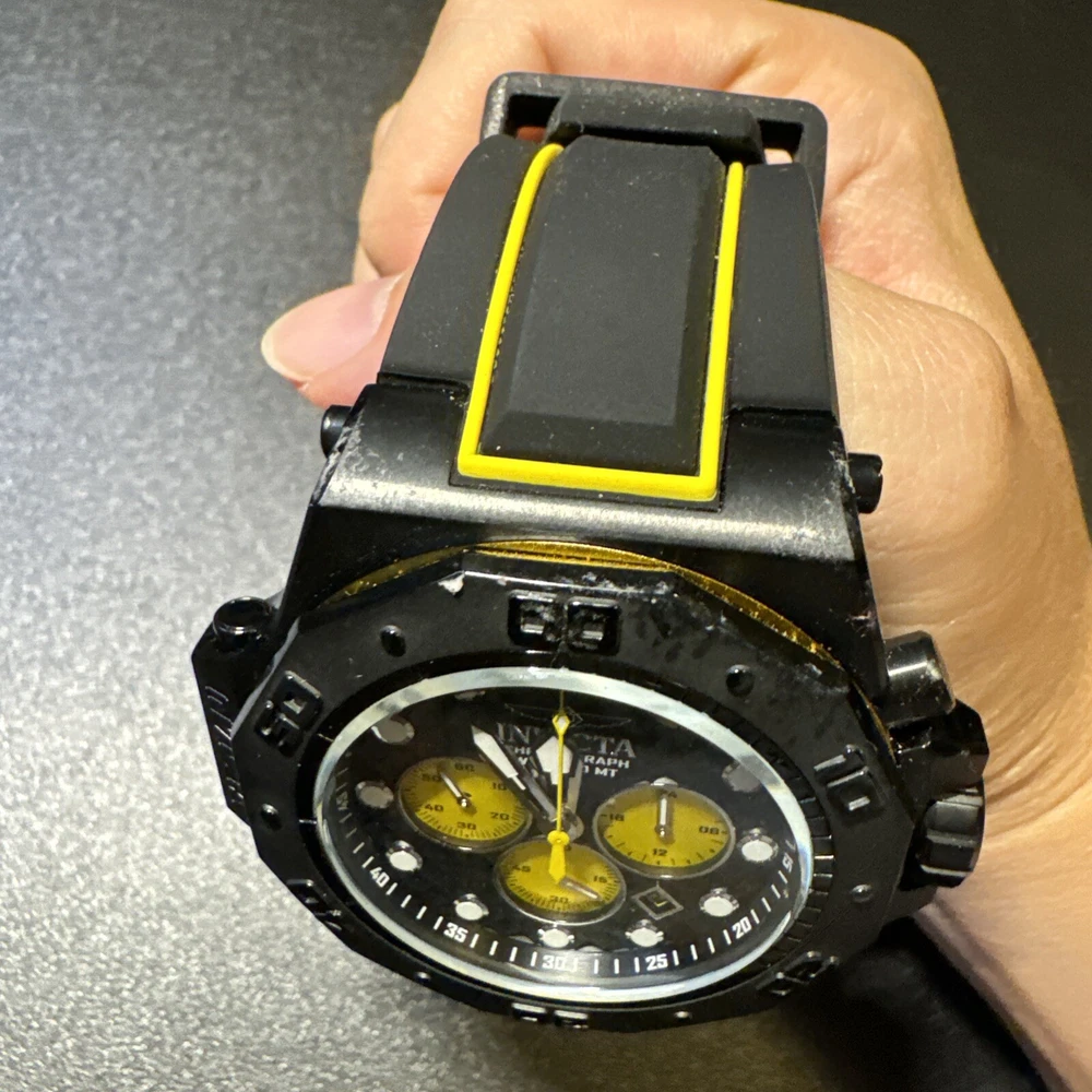 This Invicta Akula wristwatch boasts a sleek and stylish design, with a 58mm round black stainless steel case and a two-piece yellow and black silicone band. The fixed black bezel contrasts with the luminous yellow and black hands and indexes, which are powered by a quartz movement and backed up by a screwdown crown and water resistance up to 300 meters. Other features include a date indicator, luminous hands, scratch-resistant surface, and chronograph function. The buckle closure ensures a secure fit, while the exhibition caseback showcases the inner workings of the watch. This watch is perfect for any occasion, whether it's a sporty event or a formal gathering. Personal used condition in collection. Not currently running. NEEDS NEW BATTERIES! Bought couple years back and it's been in storage. No box. Just the watch itself with the band. Very good pristine condition. Currently sold out at retail value on official site: $439.00 very rare to find. offers welcome.