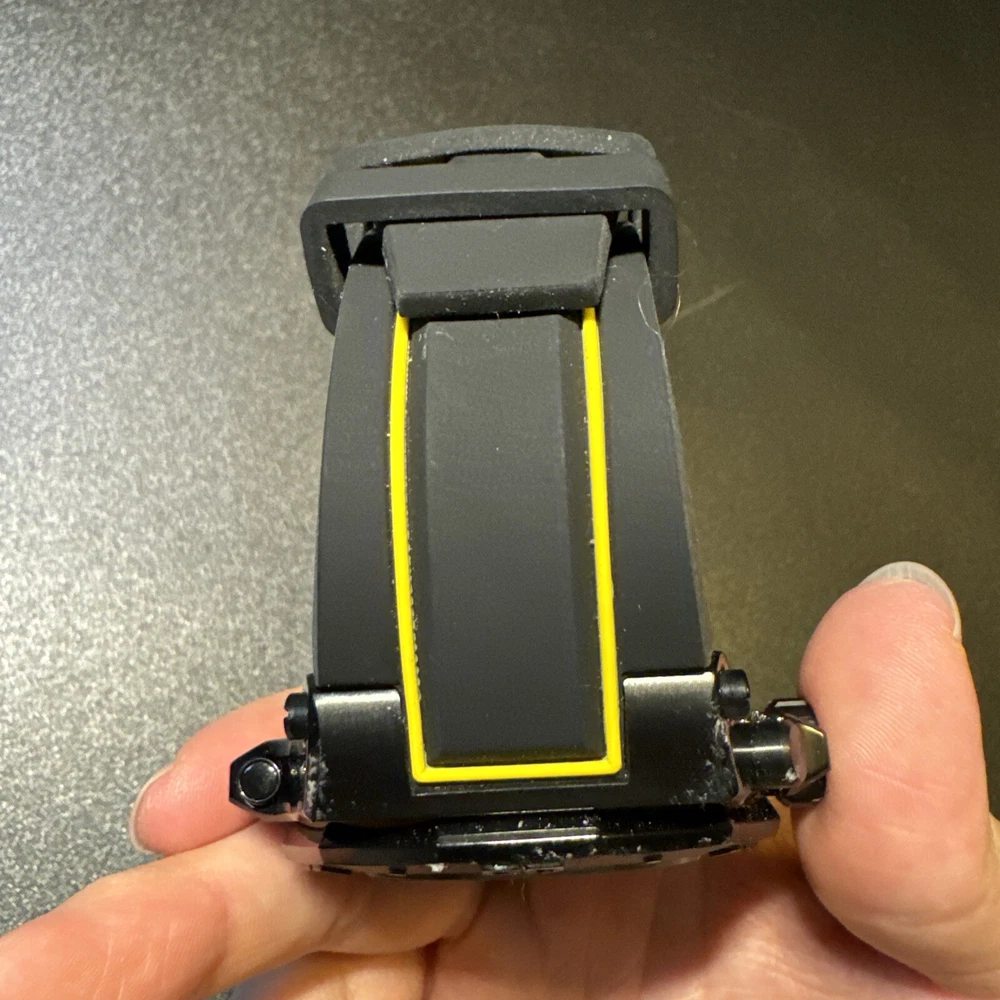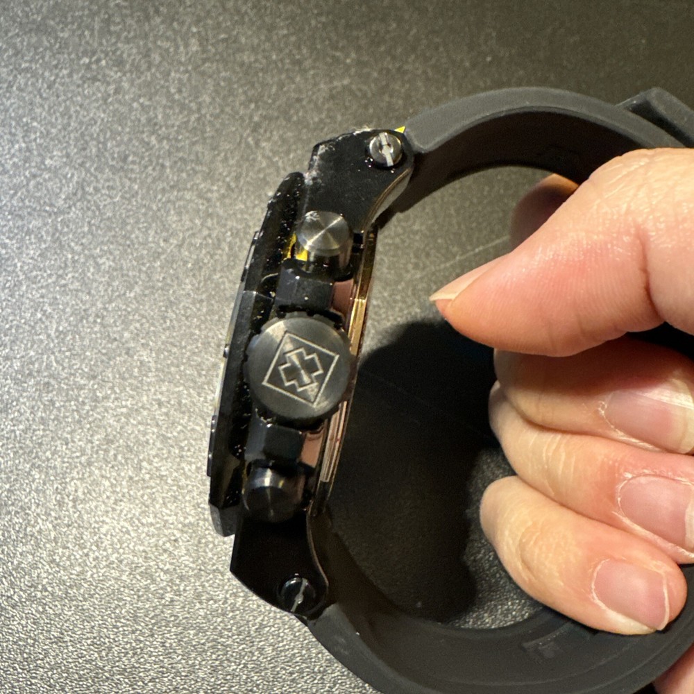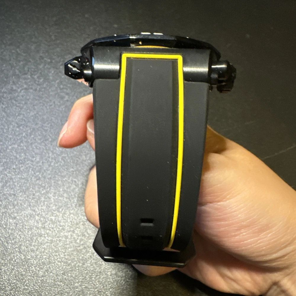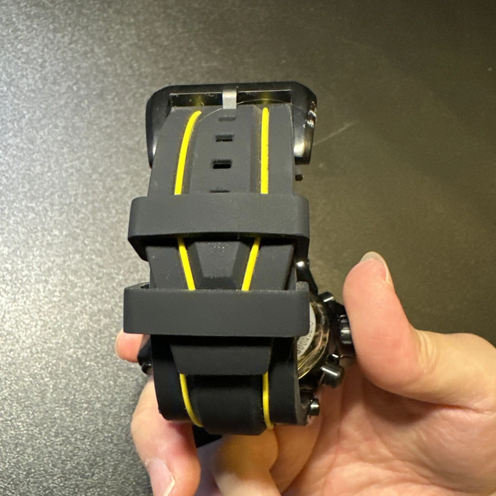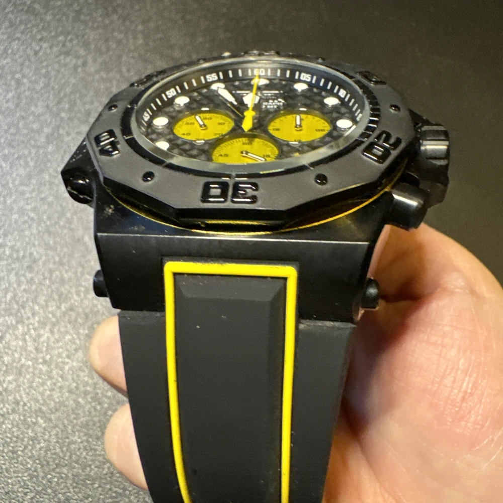 This Invicta Akula wristwatch boasts a sleek and stylish design, with a 58mm round black stainless steel case and a two-piece yellow and black silicone band. The fixed black bezel contrasts with the luminous yellow and black hands and indexes, which are powered by a quartz movement and backed up by a screwdown crown and water resistance up to 300 meters. Other features include a date indicator, luminous hands, scratch-resistant surface, and chronograph function. The buckle closure ensures a secure fit, while the exhibition caseback showcases the inner workings of the watch. This watch is perfect for any occasion, whether it's a sporty event or a formal gathering. Personal used condition in collection. Not currently running. NEEDS NEW BATTERIES! Bought couple years back and it's been in storage. No box. Just the watch itself with the band. Very good pristine condition. Currently sold out at retail value on official site: $439.00 very rare to find. offers welcome.