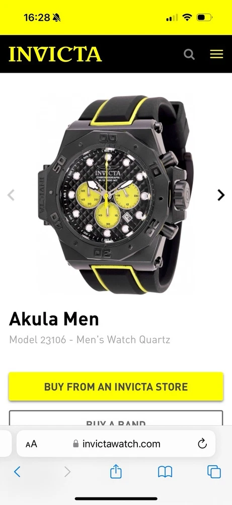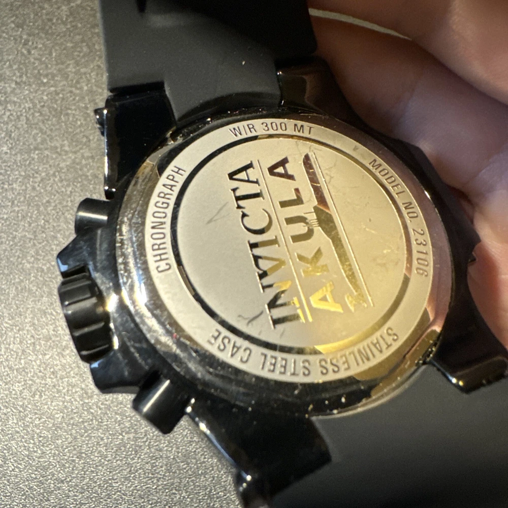 Seller Warranty: No Indices: Round Indexes Model: Invicta Akula Movement: Quartz California Prop 65 Warning: Not Applicable Closure: Buckle Type: Wristwatch Features: 12-Hour Dial, Chronograph, Date Indicator, Day Indicator, Luminous Hands, Luminous Indexes, Scratch-Resistant, Screwdown Crown, Seconds Hand, Water-Resistant Case Thickness: 15 mm Year Manufactured: 2016 UPC: 886678282104 Band Color: Black, Yellow Reference Number: 23106 Watch Shape: Round Band Material: Silicone Handedness: Right gtin13: 886678282104 Case Material: Stainless Steel Caseback: Exhibition Band/Strap: Two-Piece Strap Vintage: No Customized: No Handmade: No Brand: Invicta Water Resistance: 300 m (30 ATM) Bezel Color: Black Style: Casual, Dress/Formal, Luxury, Sport Display: Analog With Manual/Booklet: No With Papers: No Case Size: 58 mm Lug Width: 18 mm Band Width: 32 mm With Original Box/Packaging: No Dial Color: Black, Yellow Bezel Type: Fixed Case Finish: Polished Country/Region of Manufacture: Japan Case Color: Black Department: Men
