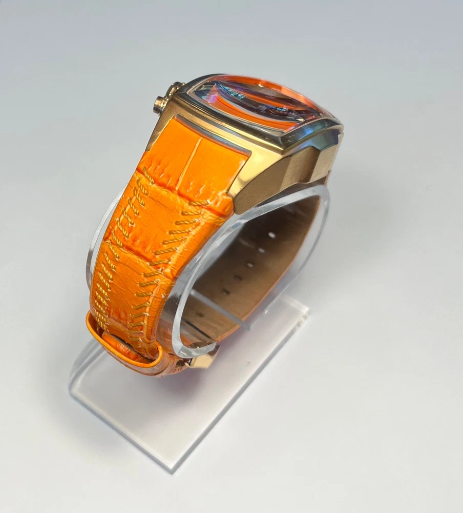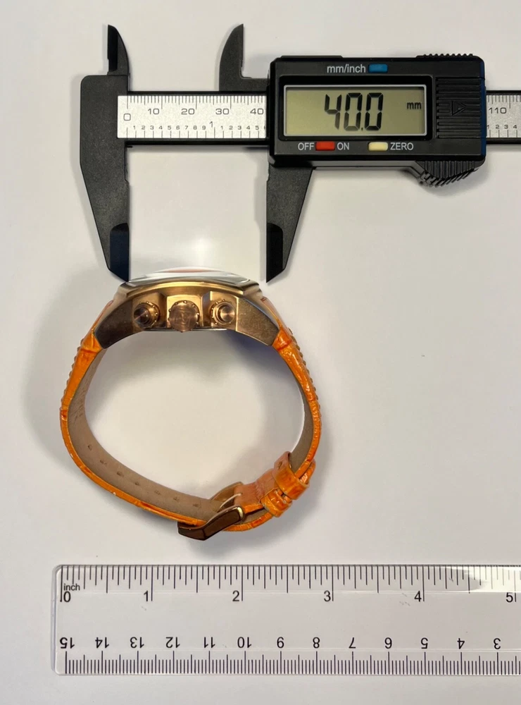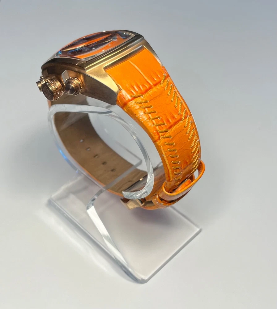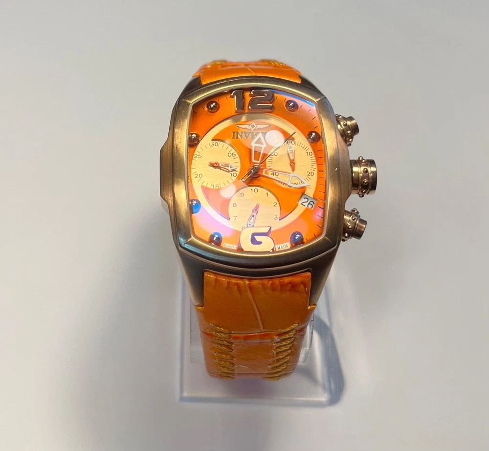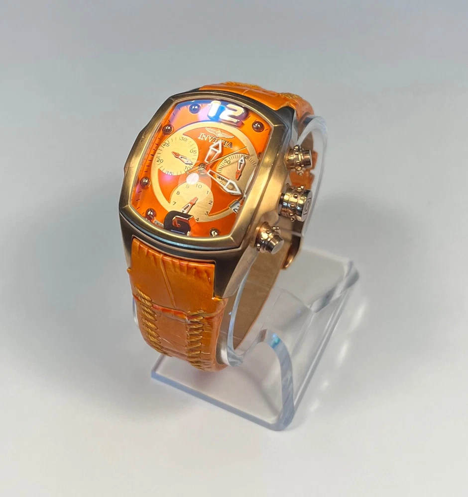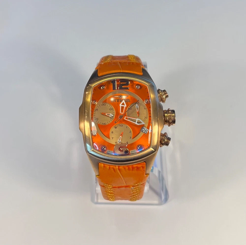 Elevate your timekeeping with the Invicta Lupah Watch, a Swiss-made timepiece that combines functionality with elegance. The watch boasts a polished gold and orange stainless steel case, complemented by a durable leather strap in a coordinating hue. Its classic round dial features a striking gold and orange color scheme, accented by bold Arabic numerals and luminous hands for visibility in low light. The Lupah is equipped with a reliable quartz movement, chronograph, and water resistance up to 330 feet, making it suitable for both everyday wear and aquatic adventures. Additional features include a flame fusion crystal, multi-dial display, and a sleek 45mm case size that fits comfortably on a range of wrists. Whether you're dressing up for a formal event or heading out on a casual outing, this versatile watch is designed to suit any occasion. 273