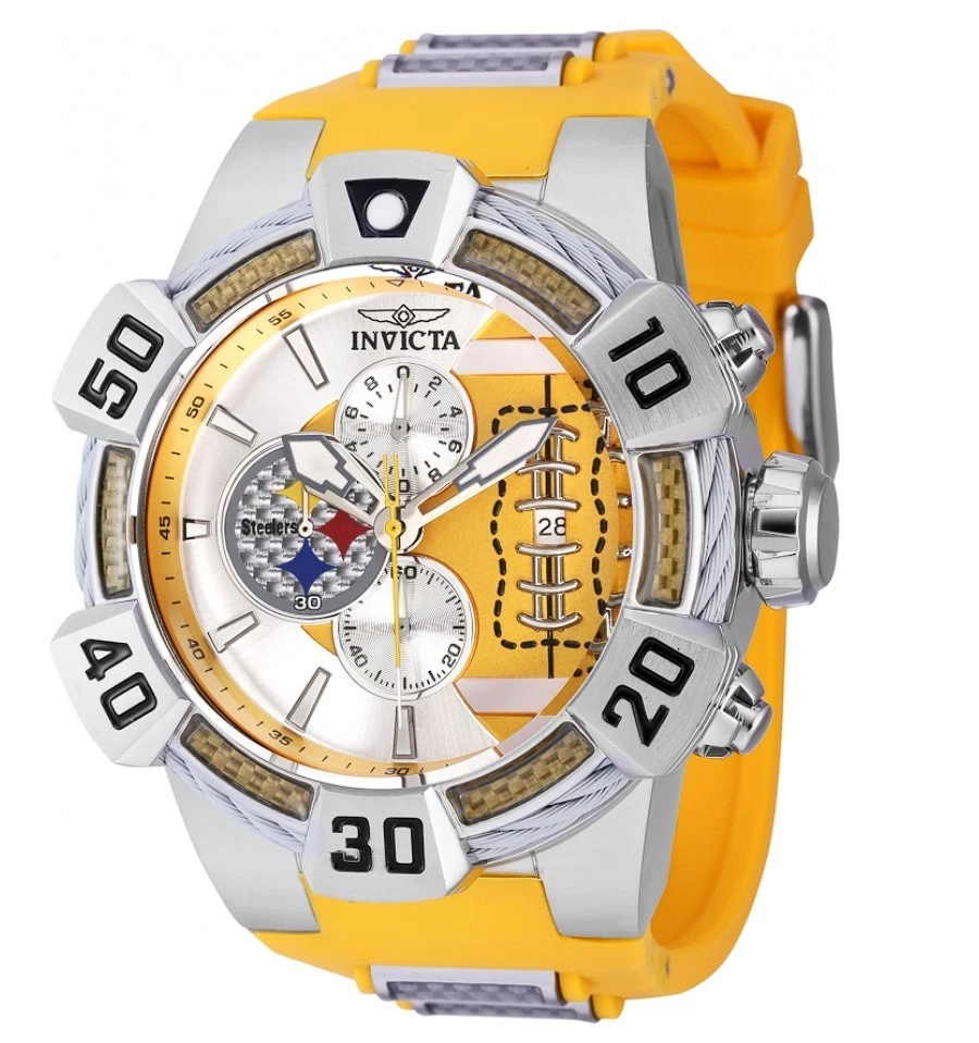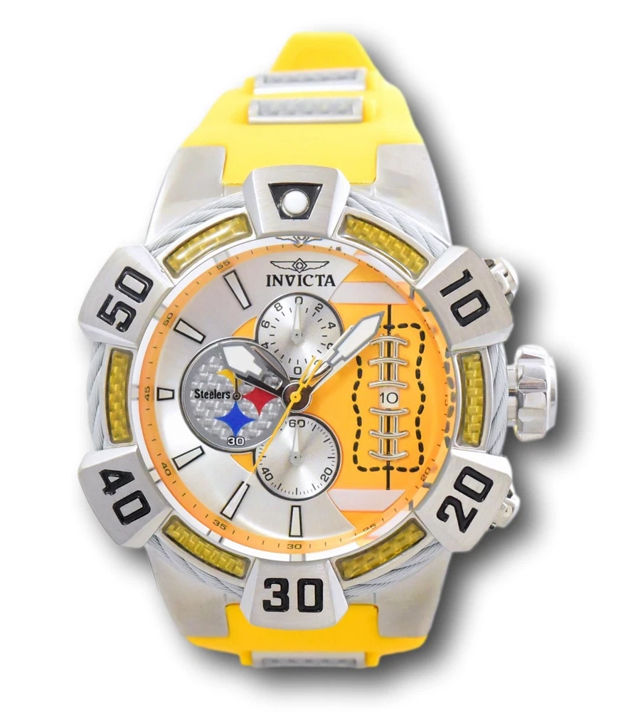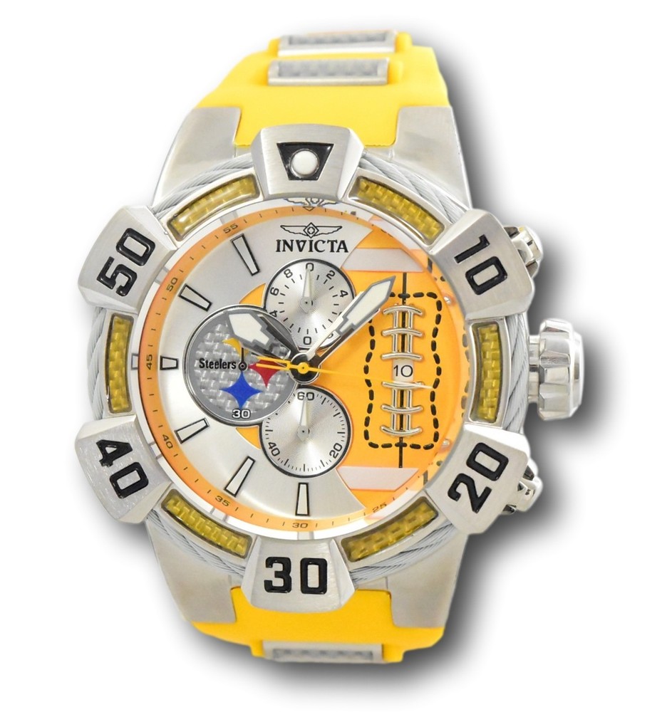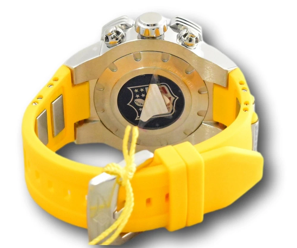 New - With Defects New and Unworn - Very small imperfection on the watch hour hand - see pictures for details - watch is otherwise NEW and 100% Functional Guaranteed Authentic - Includes Blue NFL Invicta Box and Warranty Card 100% Functional - This listing includes pictures of the actual watches for sale Watch has Yellow carbon fiber accents on the bezel and silver carbon fiber on the dial - Quality Japanese chronograph movement with triple chronograph (min, sec, 1/10 second) - luminous hands and hour markers - fixed bezel - waterproof silicone band - 100M Water resistance Limited models - The Invicta NFL watches are made in very small batches - they are hard to find and sell out quickly! Case size: 52mm, or about 58mm wide including the crown - Thickness: 21 mm thick Weight: about 8.3 ounces Items included: Blue Invicta NFL Box and Warranty Card Max wrist size: 8.25 Inches Case and Dial Case Size: 52mm Case Material: Stainless Steel Bezel Material: Stainless Steel, Cable Bezel Color: Black, Gunmetal, Silver, Yellow Crown Type: Push Crystal Type: Flame Fusion Dial Material: Metal, Glass Fiber Movement Caliber: VD57 Function Type: Quartz Water Resistance Water Resistance: 100m Band Material: Silicone, Glass Fiber Tone: Gunmetal, Yellow Length: 210mm Size: 30mm