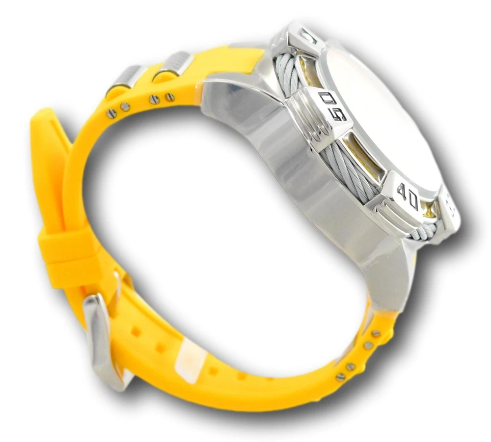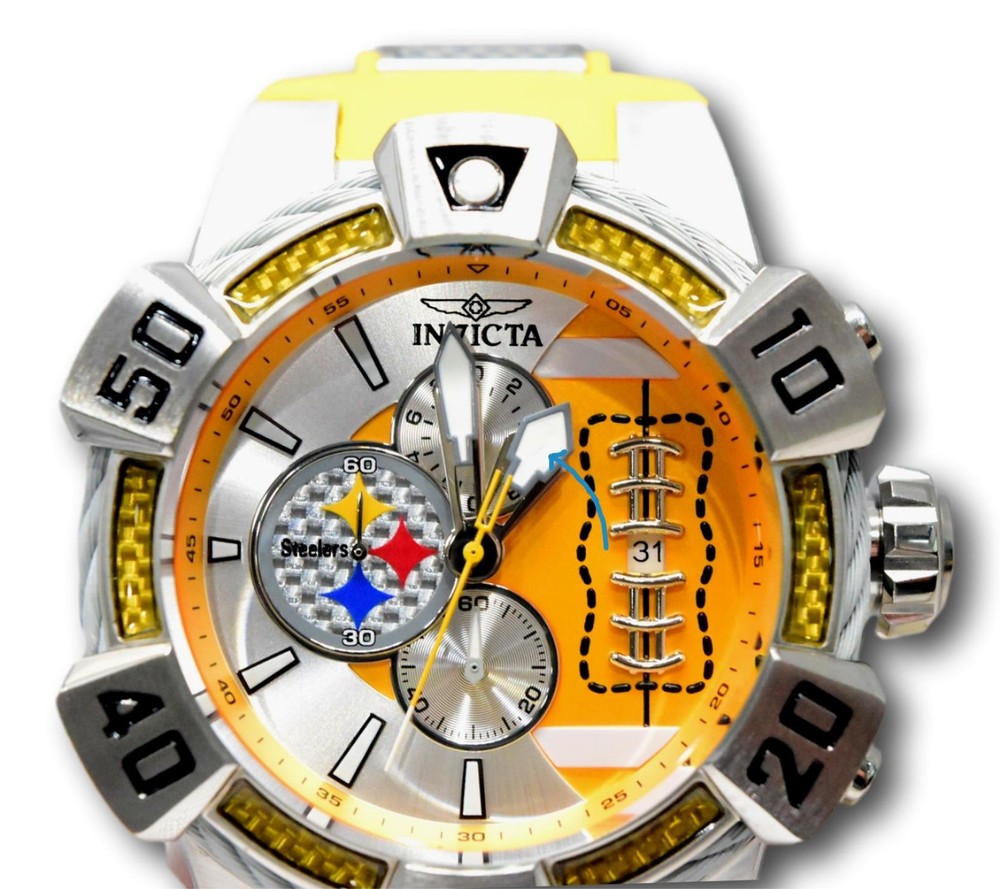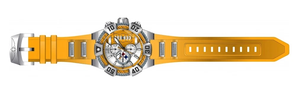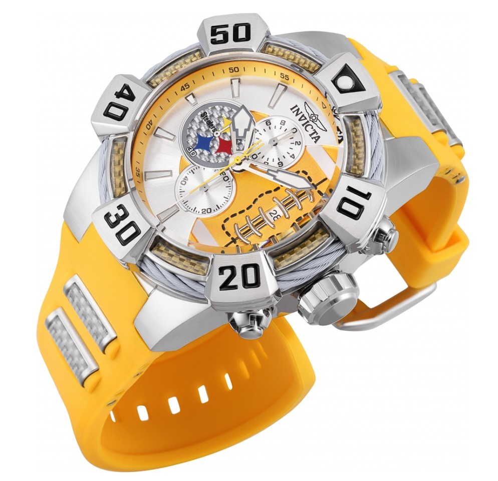 New - With Defects New and Unworn - Very small imperfection on the watch hour hand - see pictures for details - watch is otherwise NEW and 100% Functional Guaranteed Authentic - Includes Blue NFL Invicta Box and Warranty Card 100% Functional - This listing includes pictures of the actual watches for sale Watch has Yellow carbon fiber accents on the bezel and silver carbon fiber on the dial - Quality Japanese chronograph movement with triple chronograph (min, sec, 1/10 second) - luminous hands and hour markers - fixed bezel - waterproof silicone band - 100M Water resistance Limited models - The Invicta NFL watches are made in very small batches - they are hard to find and sell out quickly! Case size: 52mm, or about 58mm wide including the crown - Thickness: 21 mm thick Weight: about 8.3 ounces Items included: Blue Invicta NFL Box and Warranty Card Max wrist size: 8.25 Inches Case and Dial Case Size: 52mm Case Material: Stainless Steel Bezel Material: Stainless Steel, Cable Bezel Color: Black, Gunmetal, Silver, Yellow Crown Type: Push Crystal Type: Flame Fusion Dial Material: Metal, Glass Fiber Movement Caliber: VD57 Function Type: Quartz Water Resistance Water Resistance: 100m Band Material: Silicone, Glass Fiber Tone: Gunmetal, Yellow Length: 210mm Size: 30mm