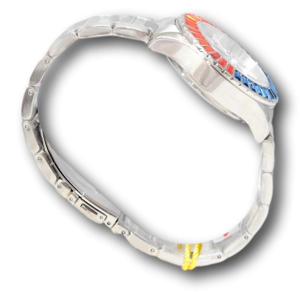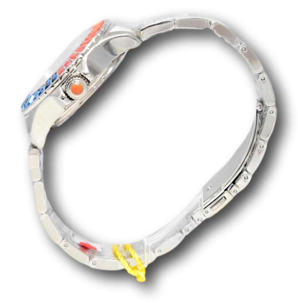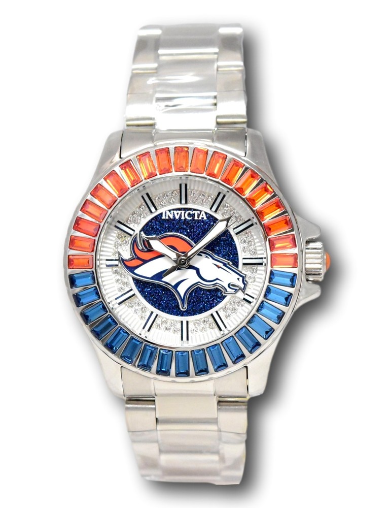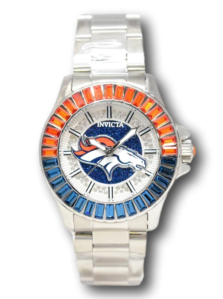 New - With Tags New and Unworn - Guaranteed Authentic - Includes Blue Invicta NFL Box and Warranty Card 100% Functional - This listing includes real pictures of the actual watches for sale These NFL watches are made in limited small batches, and once they sell out are hard to find! Rare and collectible model. Watch features: 96 individual crystals! 36 crystals around the watch bezel, and 60 on the watch dial. Case Size : 38mm or about 42mm wide including the crown Thickness: 12.5 mm Weight: about 4.7 ounces Items included: Blue Invicta NFL Box and Warranty Card Max wrist size: 7.75 Inches Case and Dial Case Size: 38mm Case Material: Stainless Steel Bezel Material: Stainless Steel Bezel Color: Blue, Orange, Silver Crown Type: Push Crystal Type: Flame Fusion Dial Material: Metal, Glitter Movement Caliber: PC21J Function Type: Quartz Water Resistance Water Resistance: 100m Band Material: Stainless Steel Tone: Steel Length: 175mm Size: 20mm Stones Type: Crystal Quantity: 17, 19, 56 Size: 1.0MM, 4.0MM Color: Blue, Orange, White