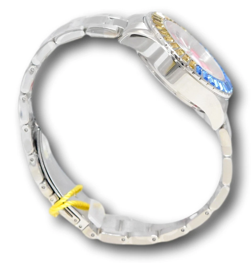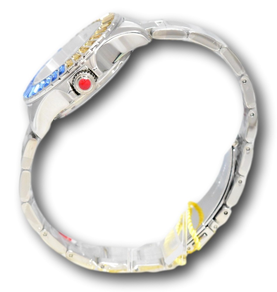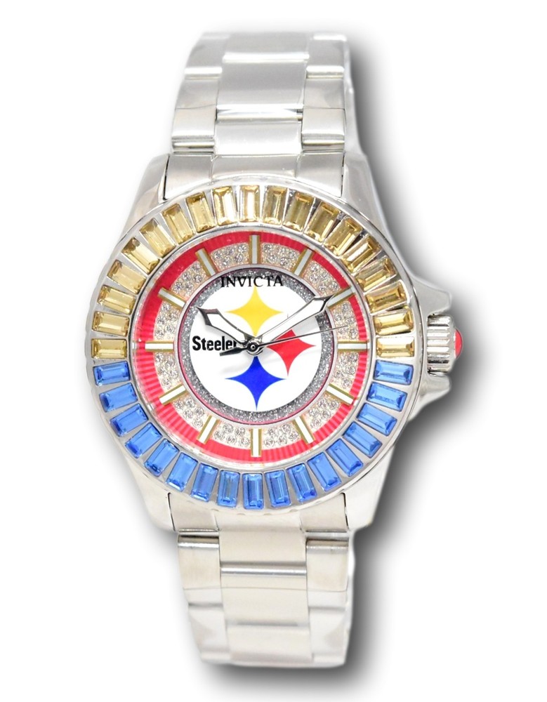 New - With Tags New and Unworn - Guaranteed Authentic - Includes Blue Invicta NFL Box and Warranty Card 100% Functional - This listing includes real pictures of the actual watches for sale These NFL watches are made in limited small batches, and once they sell out are hard to find! Rare and collectible model. Watch features: 96 individual crystals! 36 crystals around the watch bezel, and 60 on the watch dial. Case Size : 38mm or about 42mm wide including the crown Thickness: 12.5 mm Weight: about 4.7 ounces Items included: Blue Invicta NFL Box and Warranty Card Max wrist size: 7.75 Inches Case and Dial Case Size: 38mm Case Material: Stainless Steel Bezel Material: Stainless Steel Bezel Color: Blue, Silver, Yellow Crown Type: Push Crystal Type: Flame Fusion Dial Material: Metal, Glitter Movement Caliber: PC21J Function Type: Quartz Water Resistance Water Resistance: 100m Band Material: Stainless Steel Tone: Steel Length: 175mm Size: 20mm Stones Type: Crystal Quantity: 17, 19, 60 Size: 1.0MM, 4.0MM Color: Blue, White, Yellow