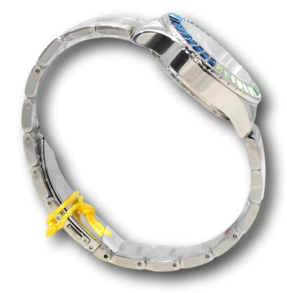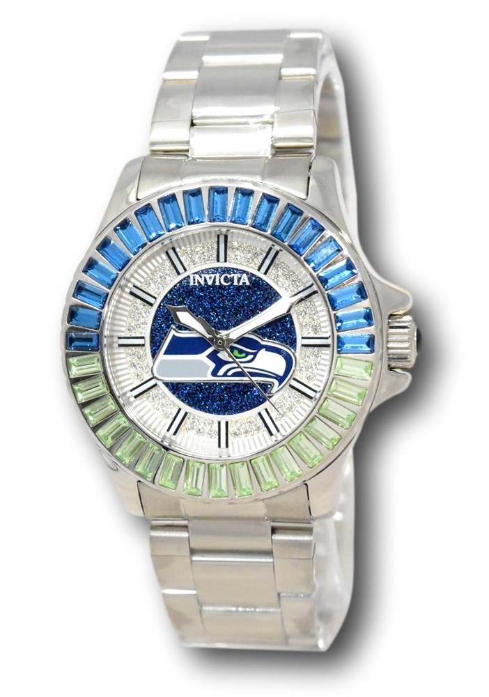 New - With Tags New and Unworn - Guaranteed Authentic - Includes Blue Invicta NFL Box and Warranty Card 100% Functional - This listing includes real pictures of the actual watches for sale These NFL watches are made in limited small batches, and once they sell out are hard to find! Rare and collectible model. Watch features: 96 individual crystals! 36 crystals around the watch bezel, and 60 on the watch dial. Case Size : 38mm or about 42mm wide including the crown Thickness: 12.5 mm Weight: about 4.7 ounces Items included: Blue Invicta NFL Box and Warranty Card Max wrist size: 7.75 Inches Case and Dial Case Size: 38mm Case Material: Stainless Steel Bezel Material: Stainless Steel Bezel Color: Blue, Green, Silver Crown Type: Push Crystal Type: Flame Fusion Dial Material: Metal, Glitter Movement Caliber: PC21J Function Type: Quartz Water Resistance Water Resistance: 100m Band Material: Stainless Steel Tone: Steel Length: 175mm Size: 20mm Stones Type: Crystal Quantity: 17, 19, 60 Size: 1.0MM, 4.0MM Color: Blue, Green, White